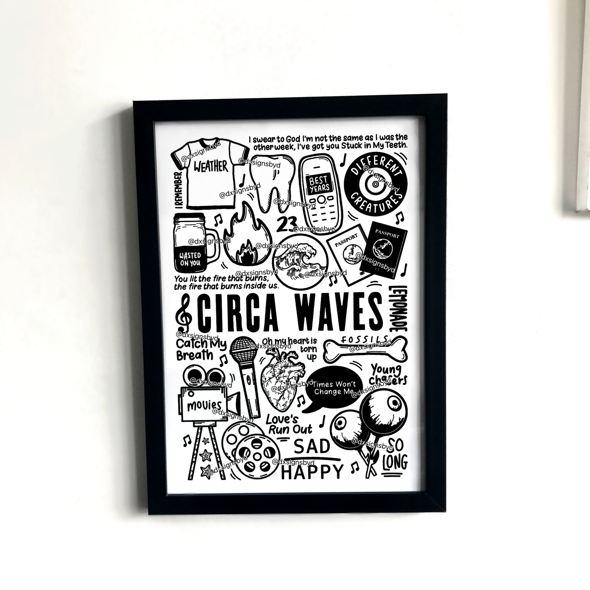 🎶Affiche de Circa Waves comprenant des images et des paroles de chansons de leurs albums tels que Sad Happy, Young Chasers, Whats It Like Over There ? et Different Creatures. Ainsi que leurs chansons populaires telles que T-shirt weather, Movies, Fire That Burns, Fossils, Lemonade et Stuck In My Teeth.