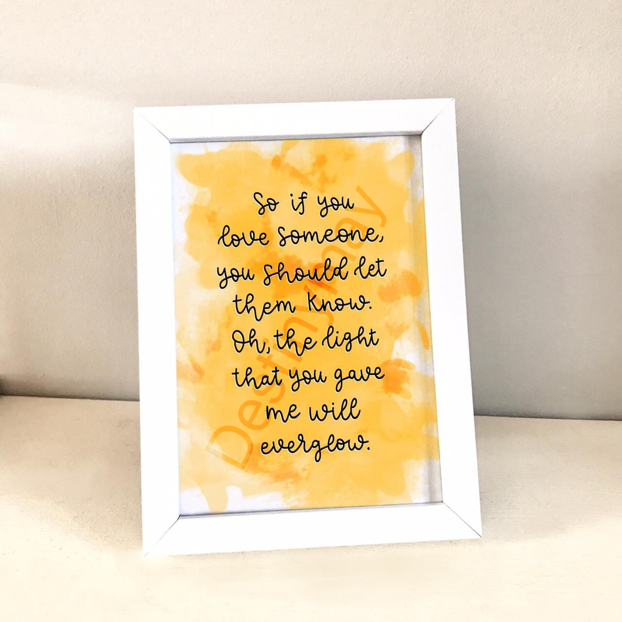 🧡Coldplay Everglow qui comprend les paroles dans une police manuscrite sur un fond aquarelle jaune moutarde.