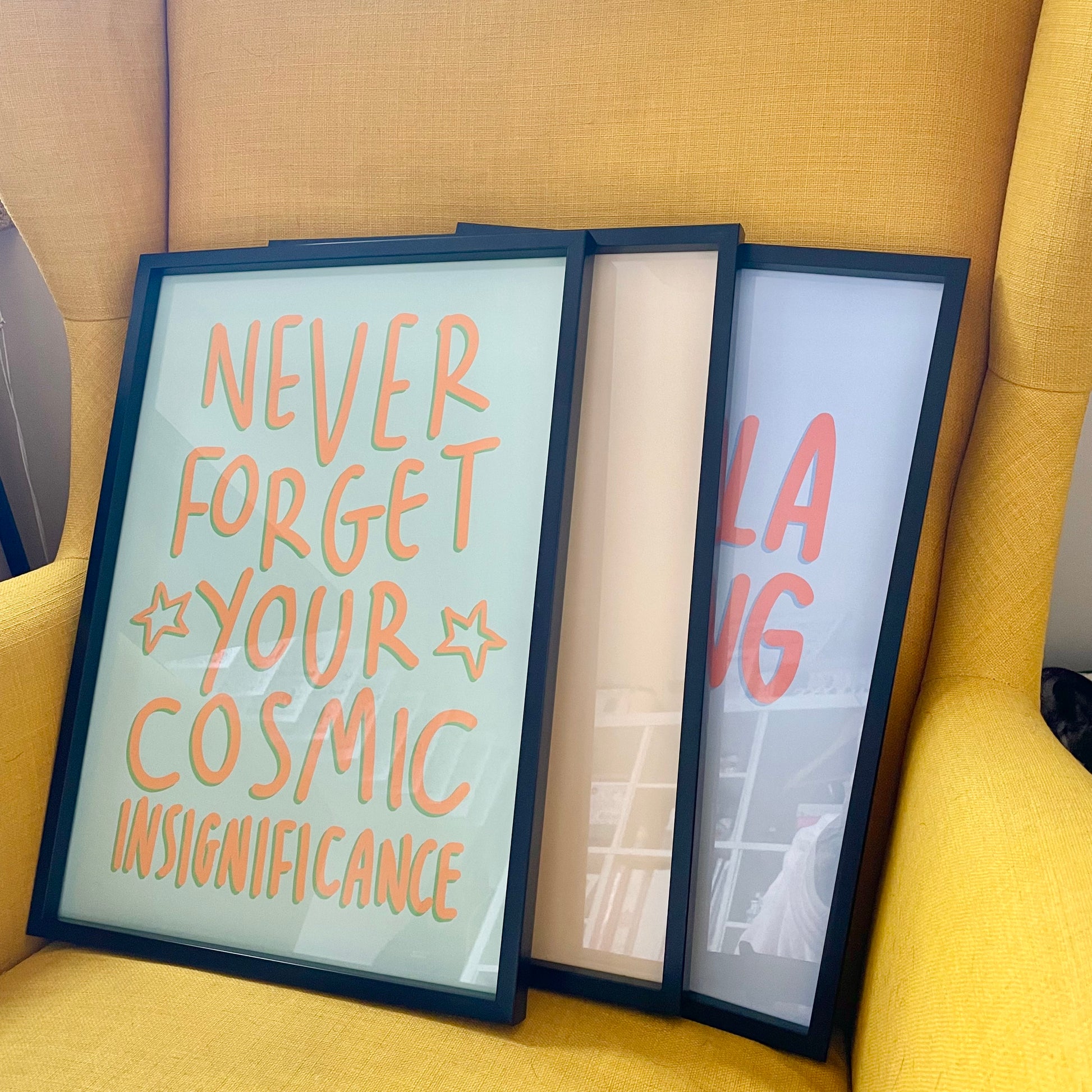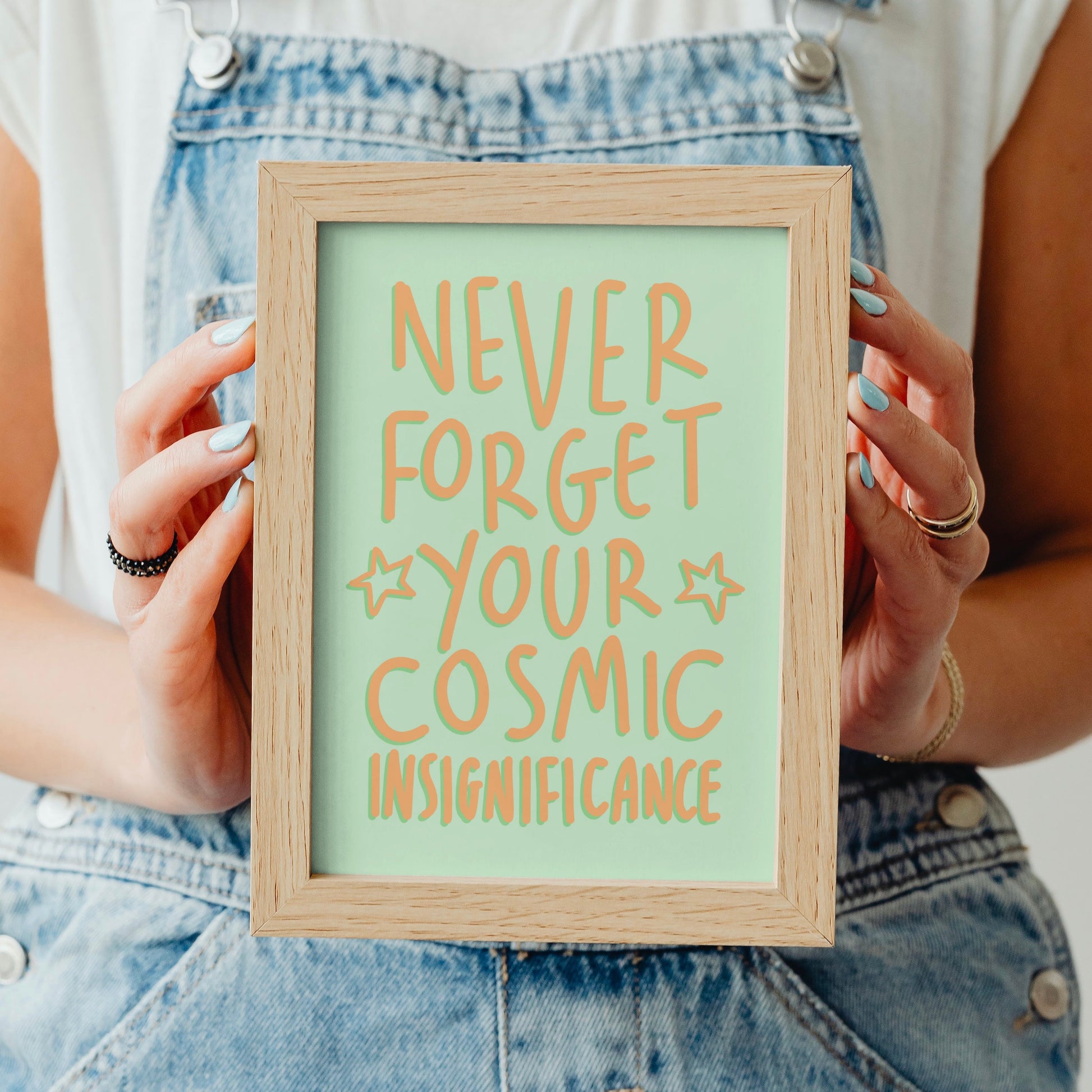🥑Affiche de citation amusante « N'oubliez jamais votre insignifiance cosmique » dans une combinaison de couleurs vertes et orange contrastées.
