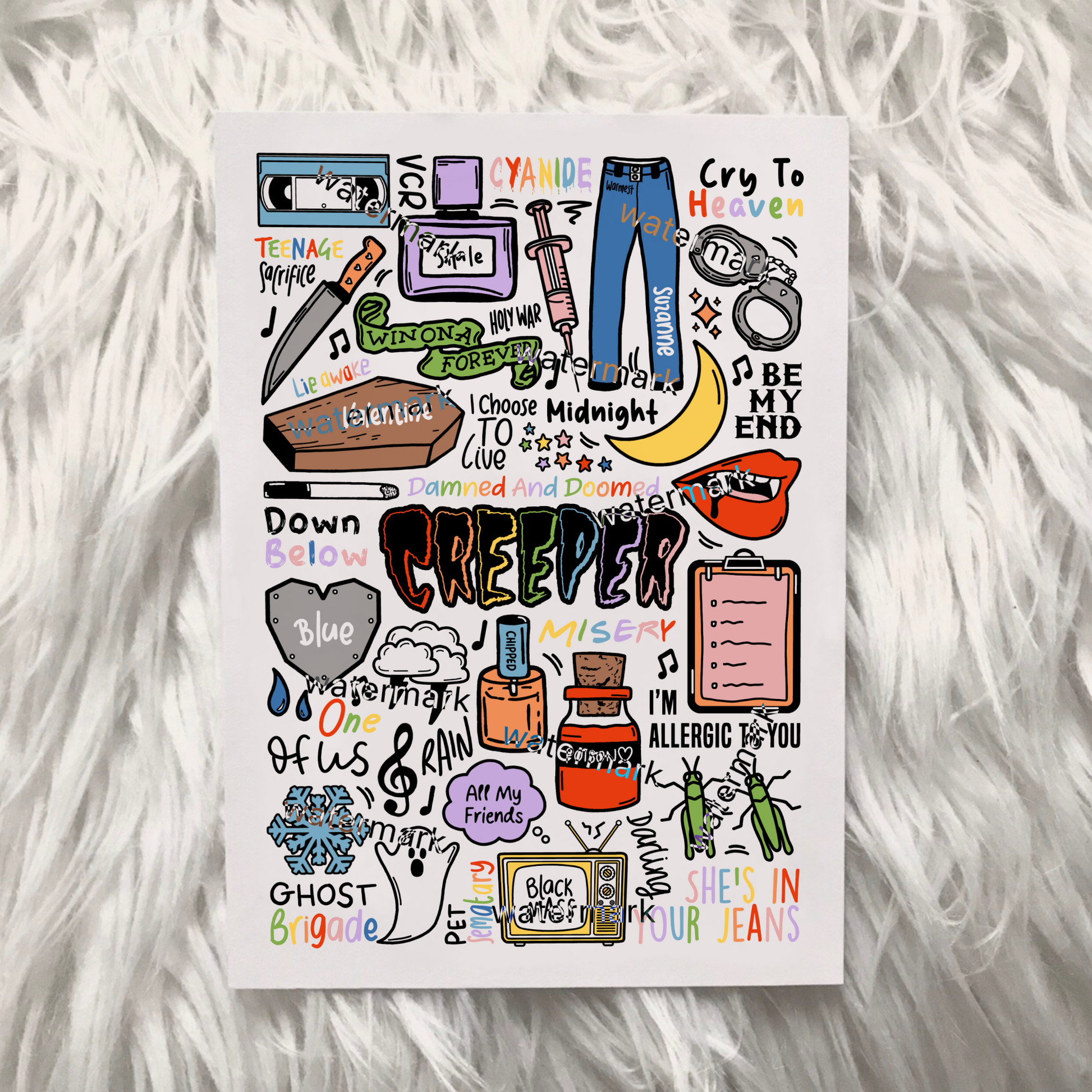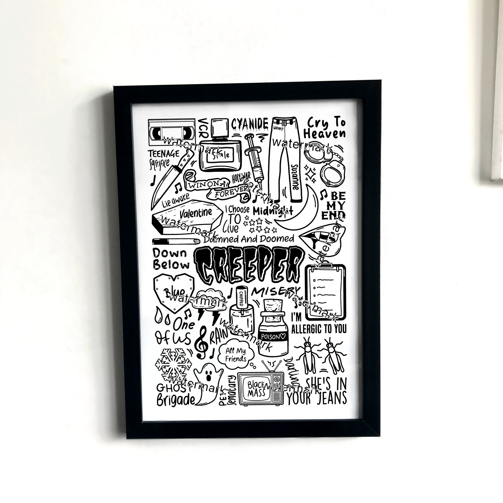 🎶 Art mural Creeper comprenant des images, des paroles et des titres de chansons de leurs albums.