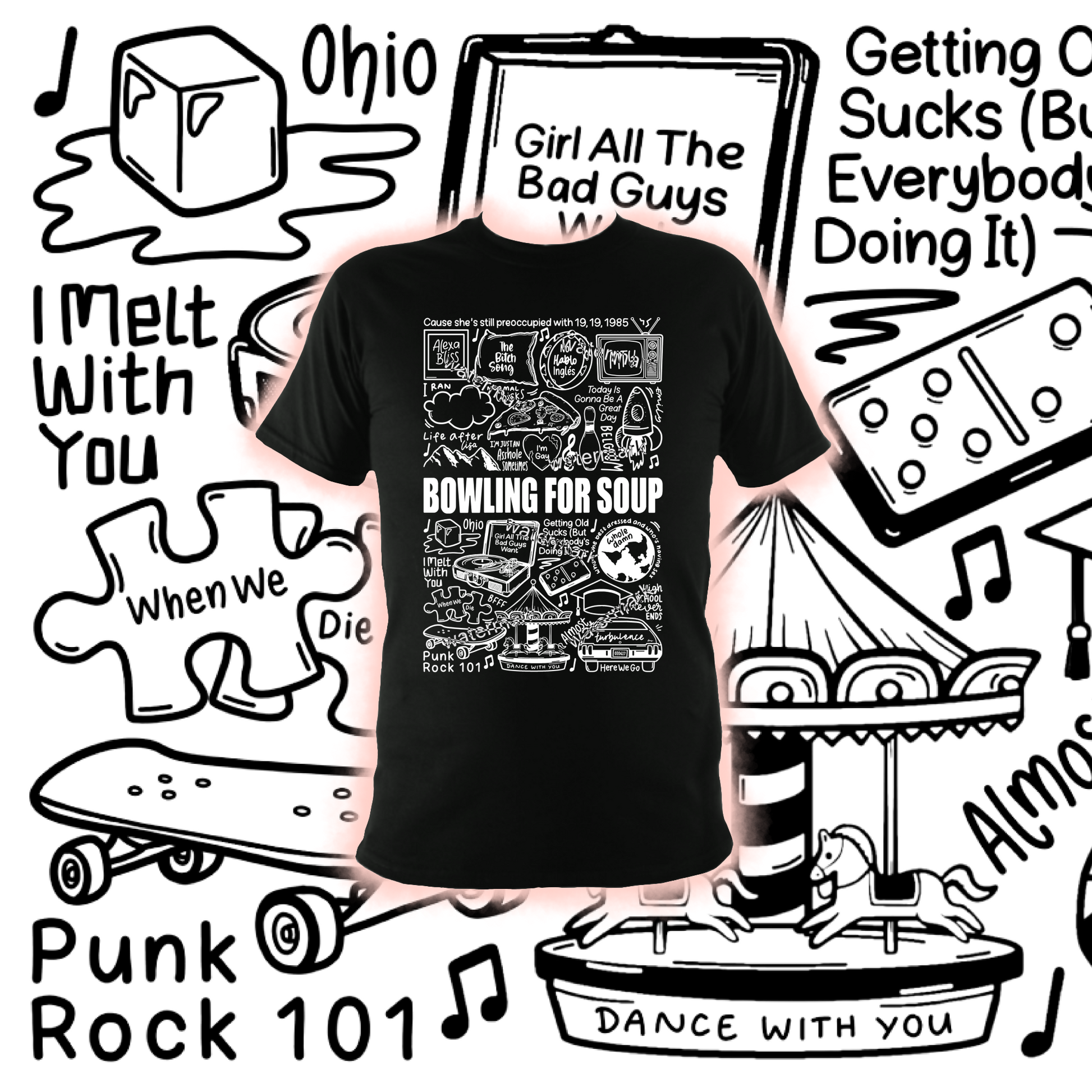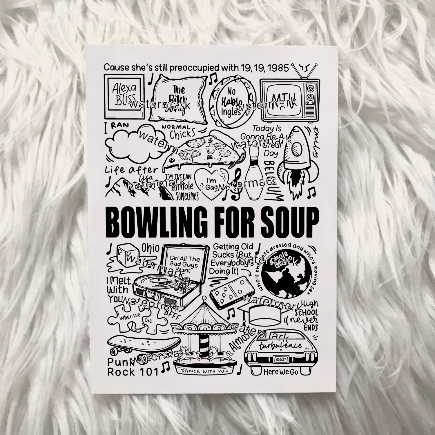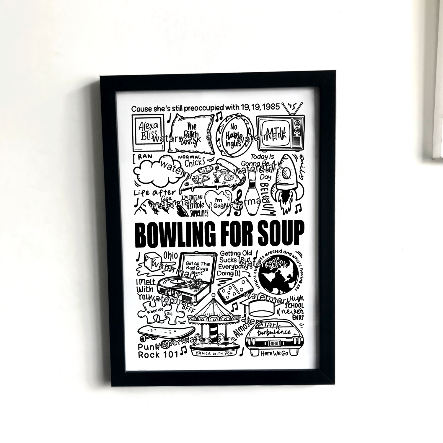 🎶 Affiche imprimée Bowling For Soup créée à l'aide d'un iPad et d'un Apple Pencil. Elle comprend des images et des paroles de chansons de leurs albums.