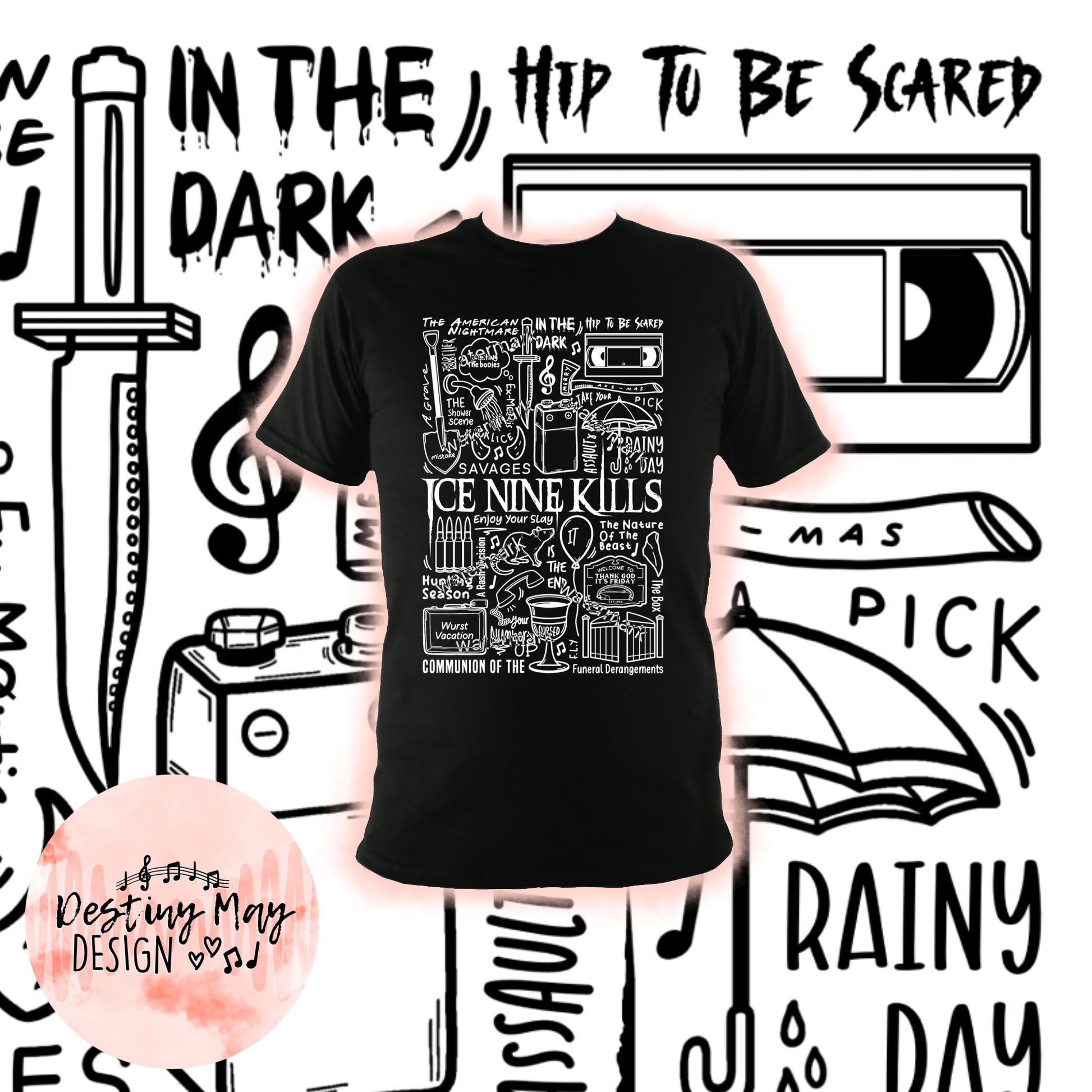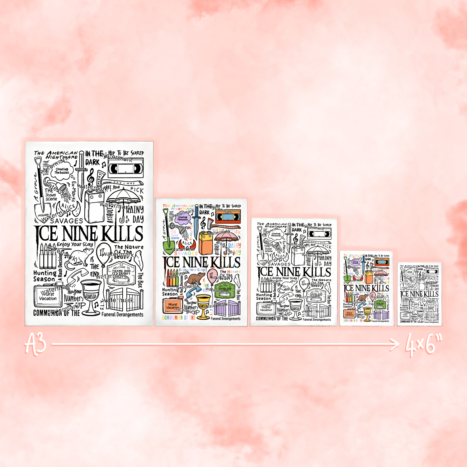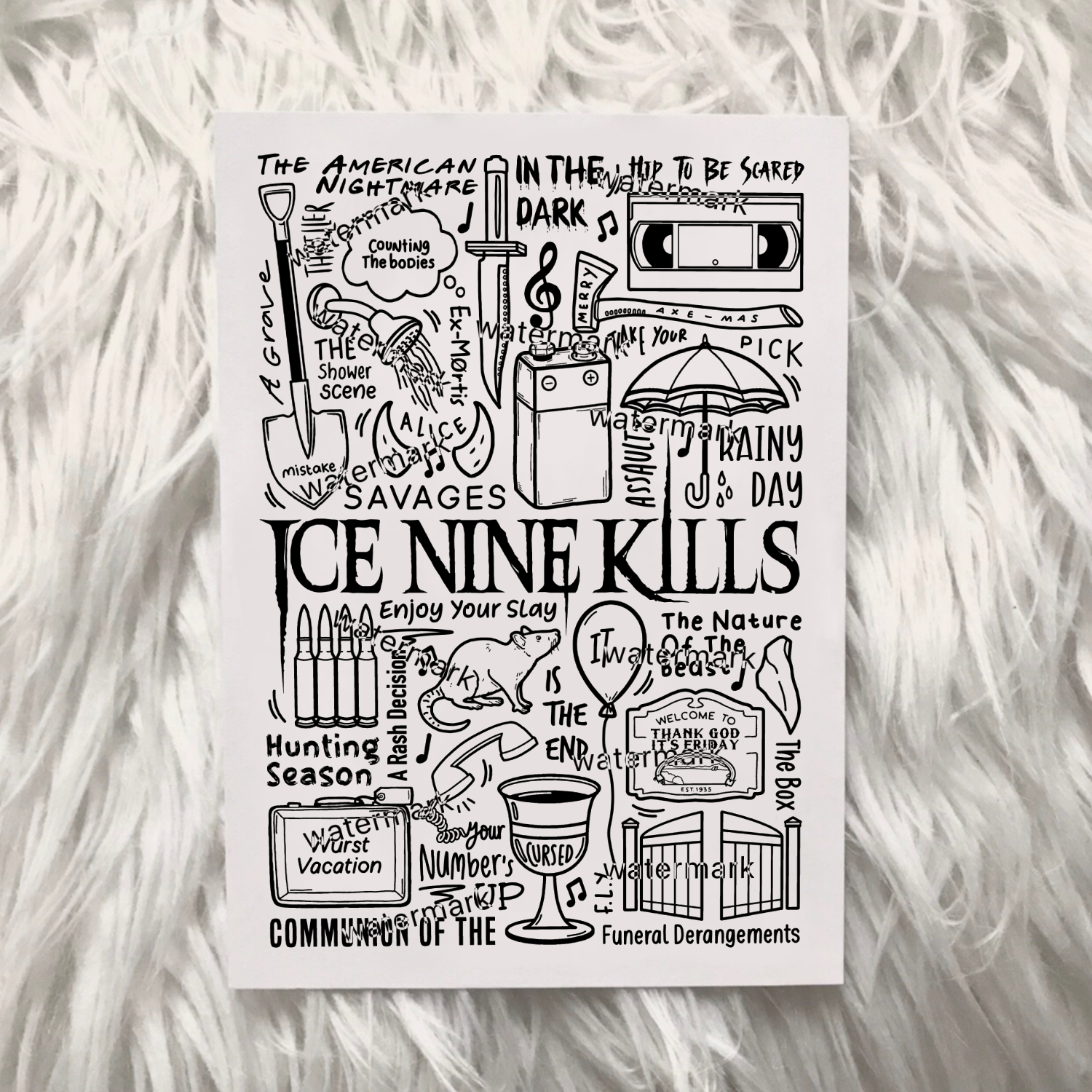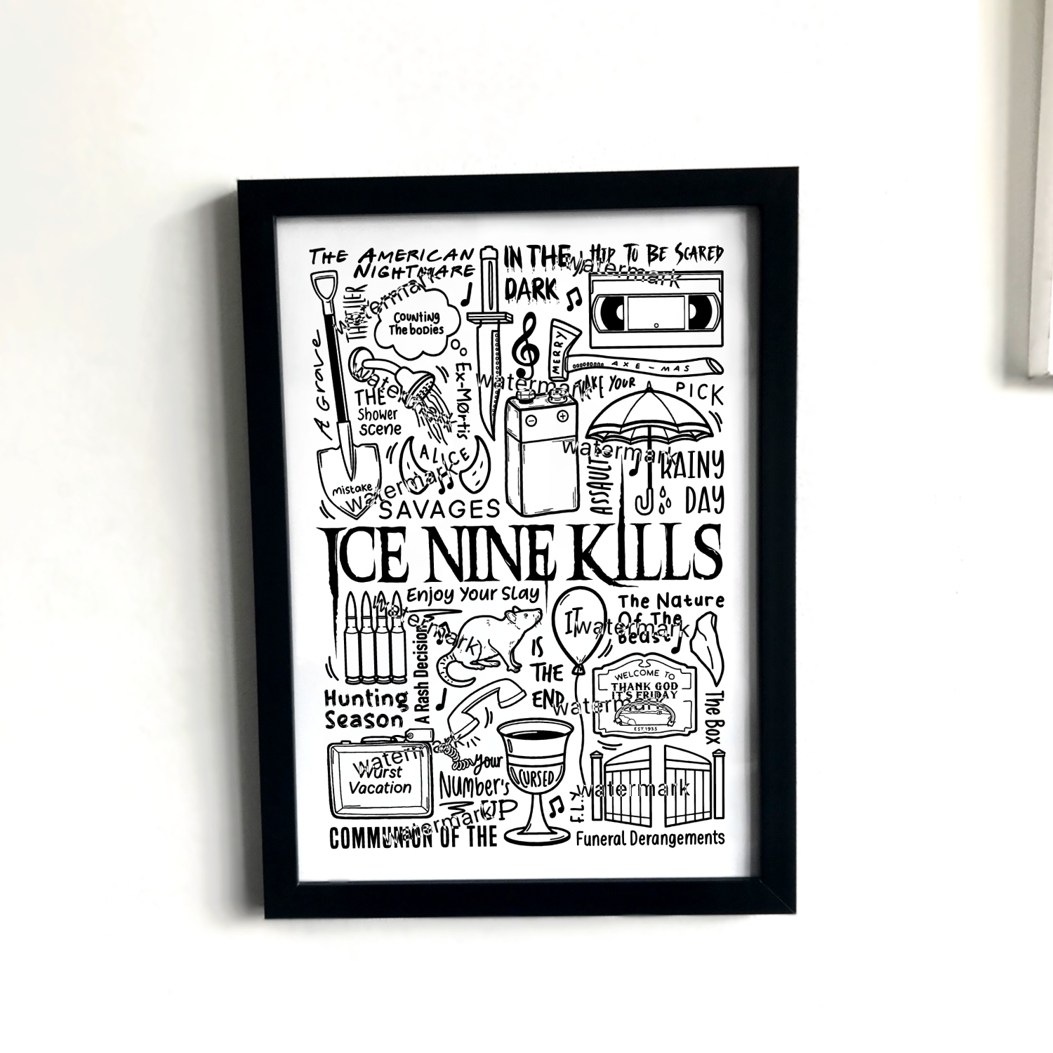 Affiche Ice Nine Kills comprenant des images et des paroles de chansons de leurs albums.