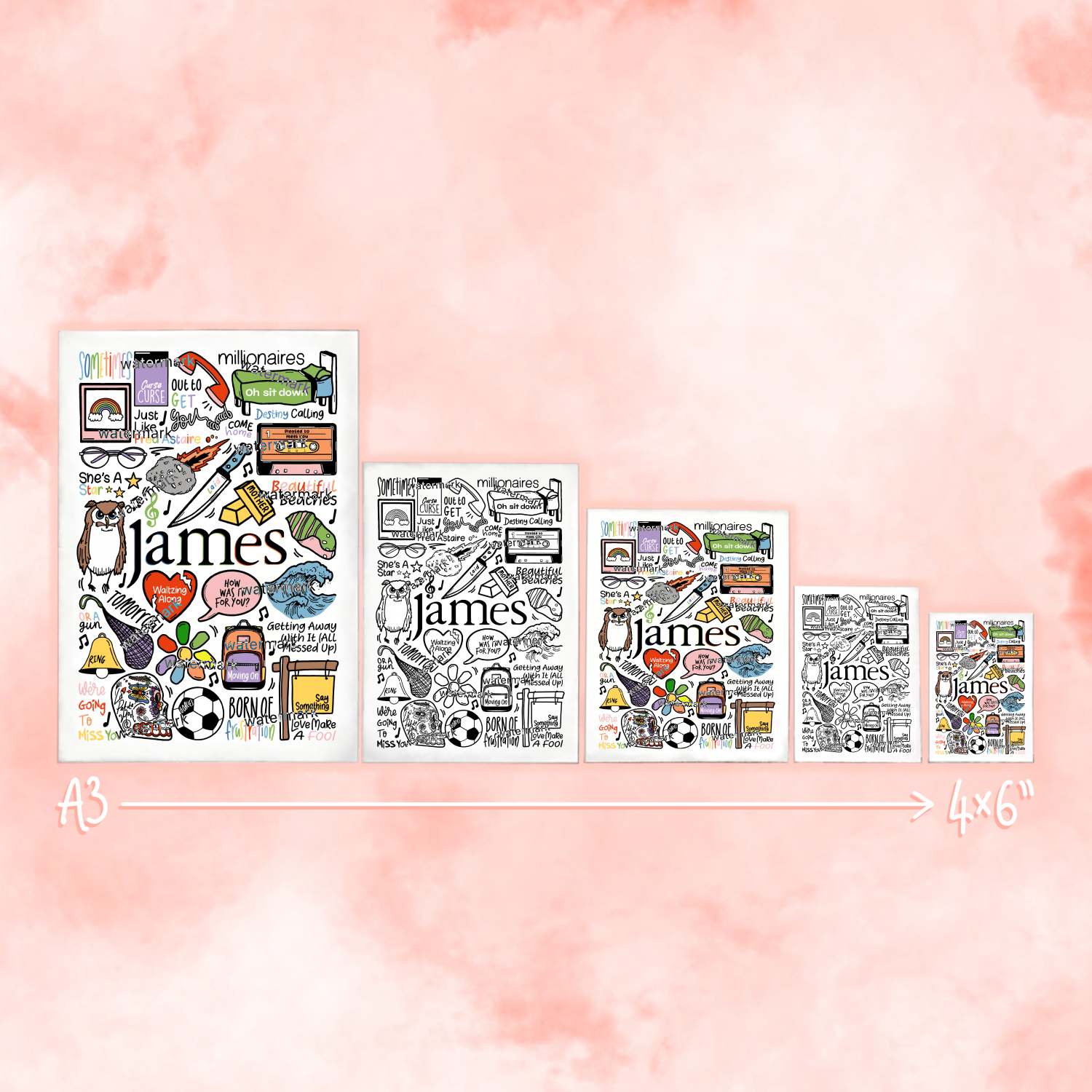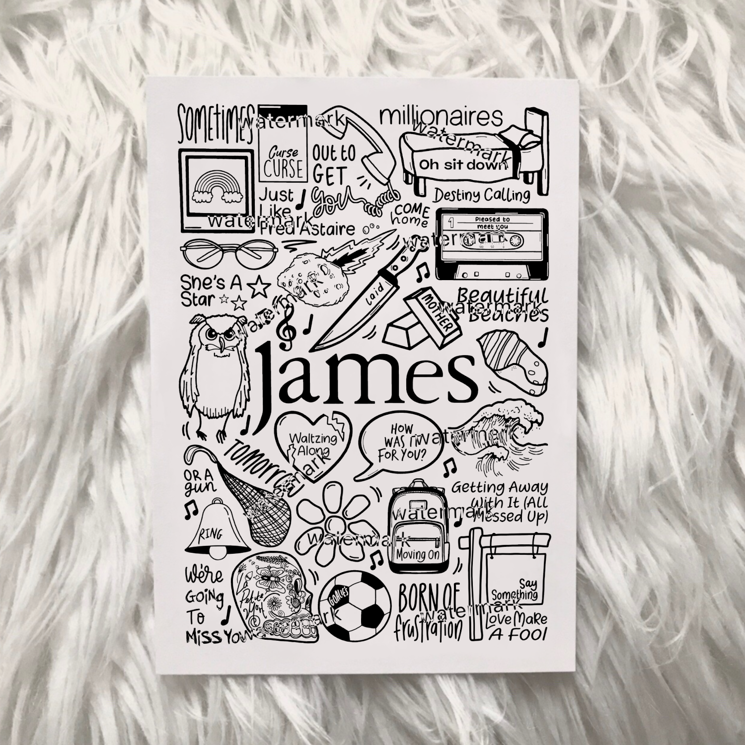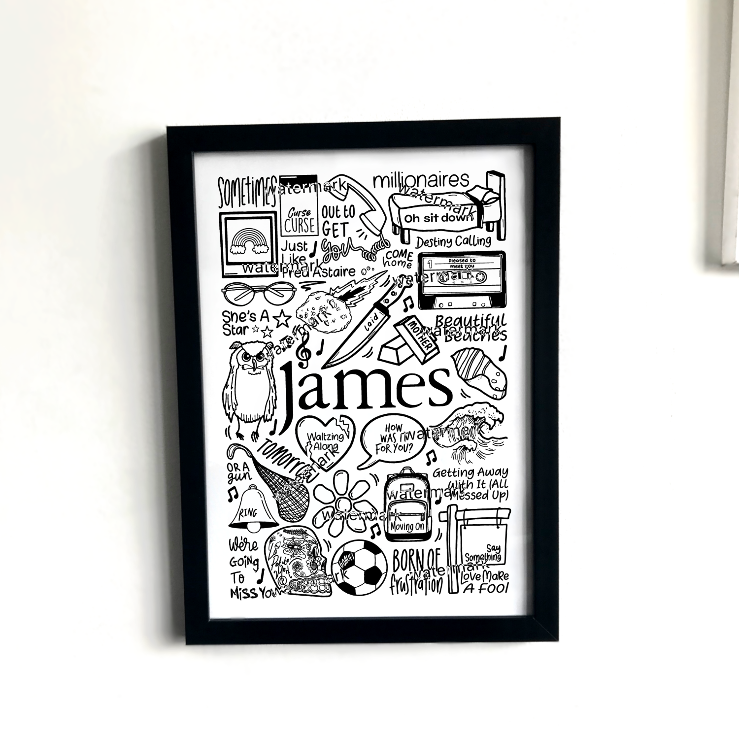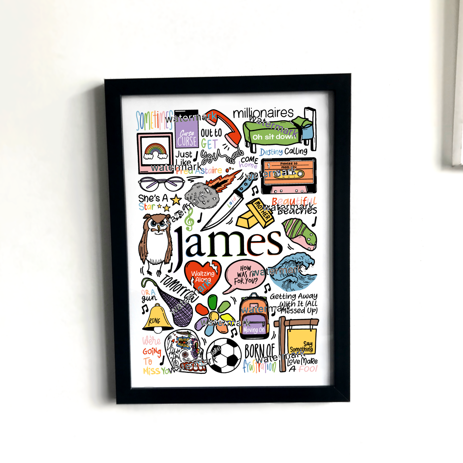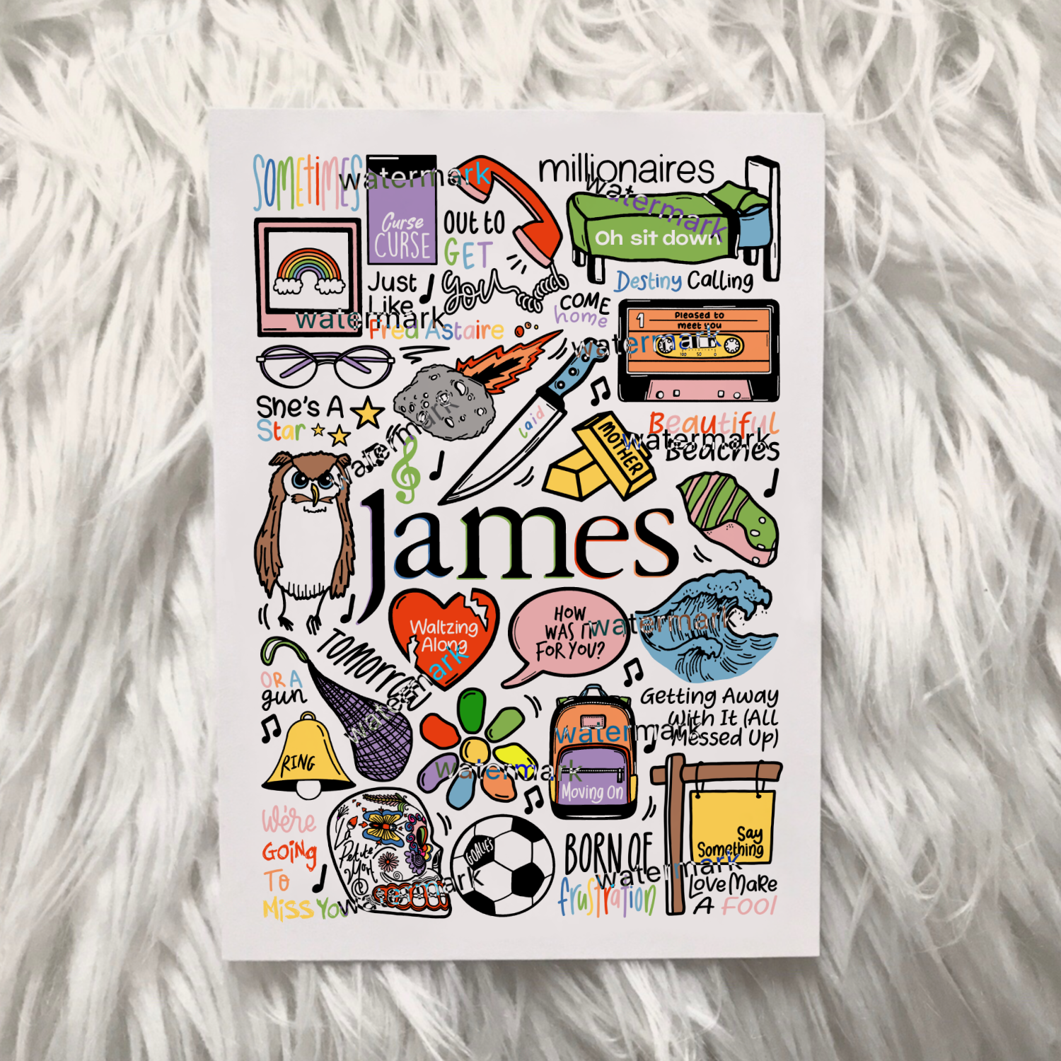 🎶 Affiche imprimée de James créée à l'aide d'un iPad et d'un Apple Pencil. Elle comprend des images et des paroles de chansons de leurs albums.