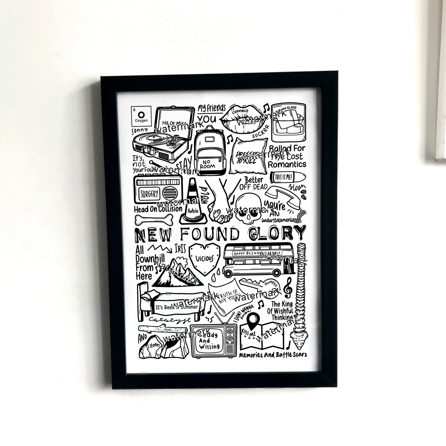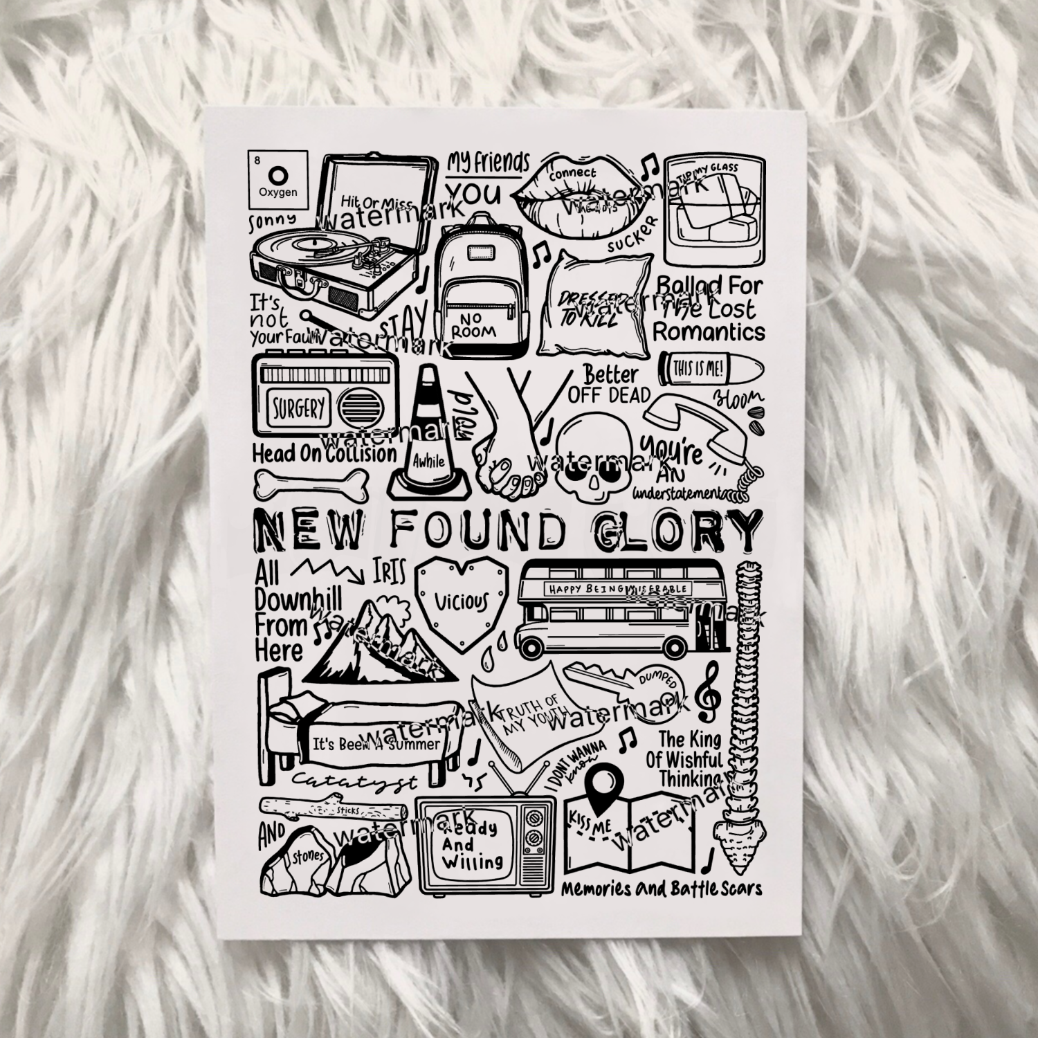 🎶 Affiche imprimée New Found Glory créée à l'aide d'un iPad et d'un Apple Pencil. Elle comprend des images et des paroles de chansons de leurs albums.