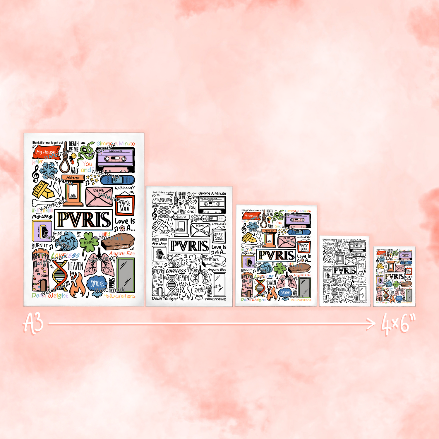 Affiche Pvris comprenant des images et des paroles de chansons de leurs albums.