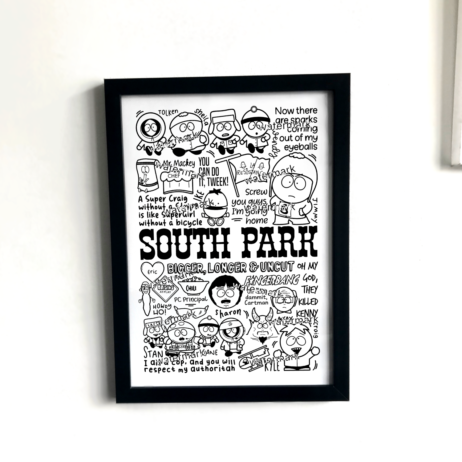 🎥 Affiche de South Park qui comprend des images, des personnages et des citations de la série et du film.
