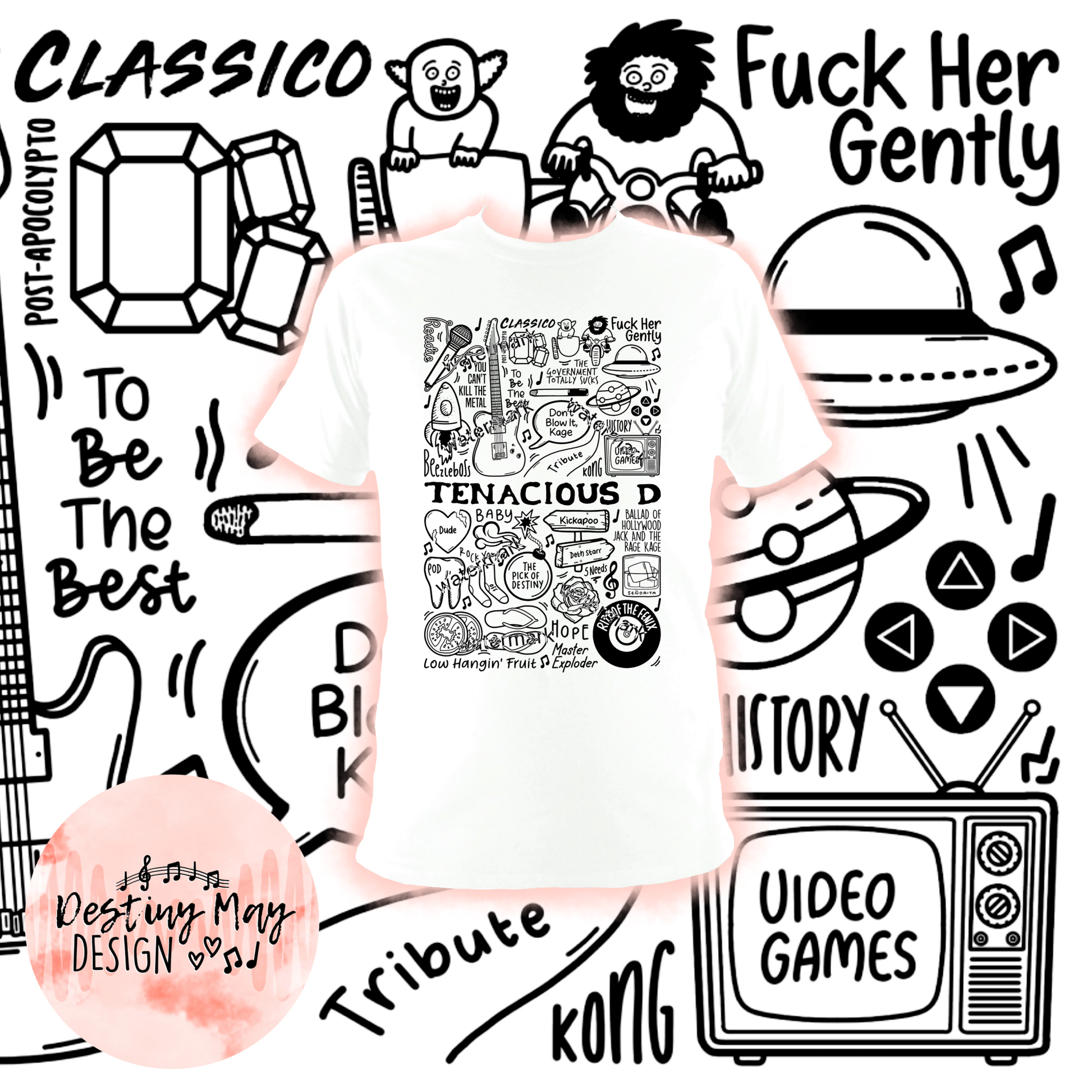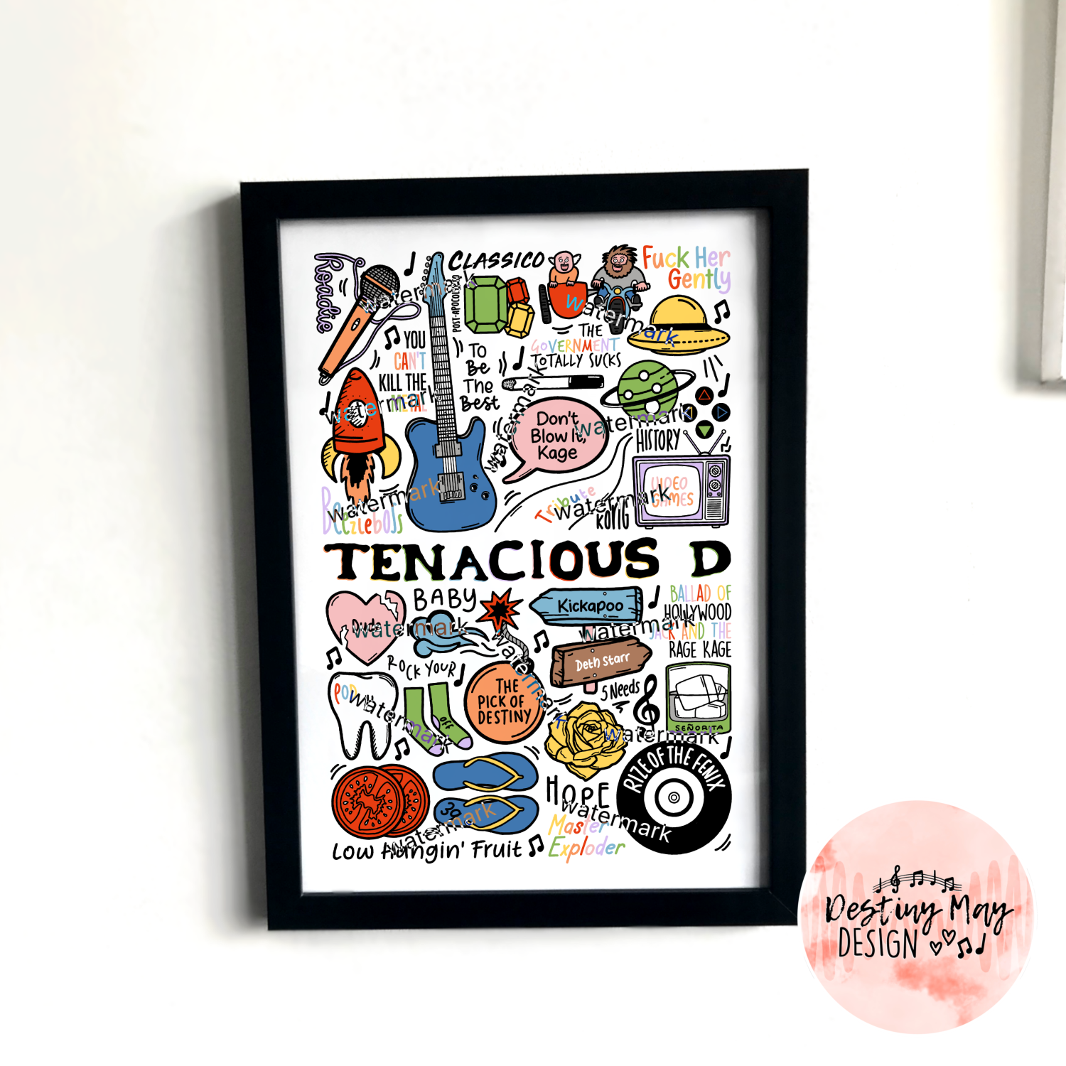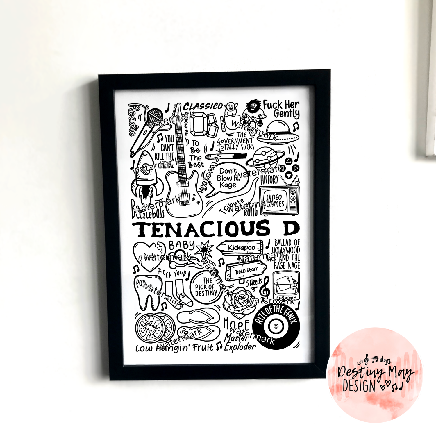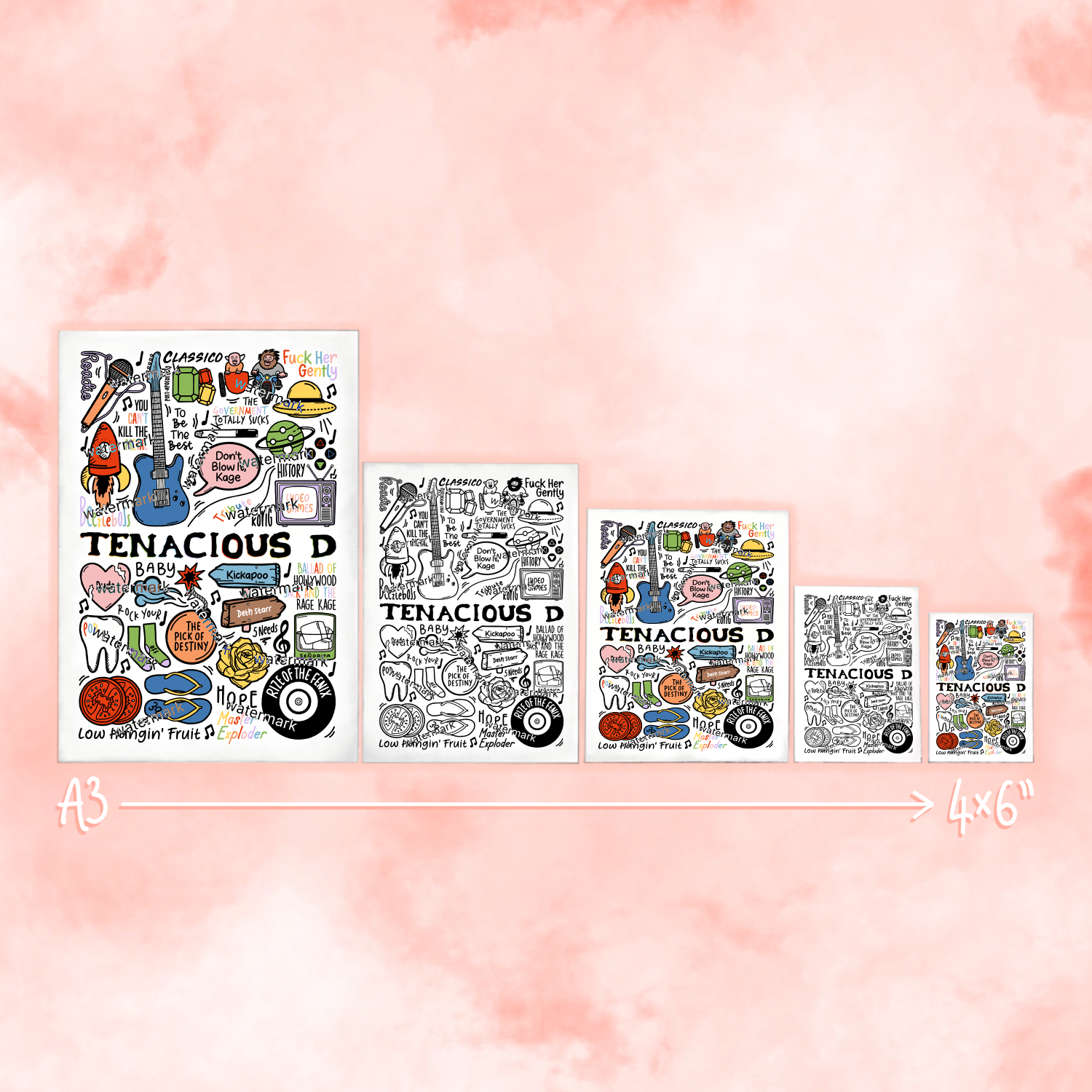 🎶 Affiche imprimée de Tenacious D créée à l'aide d'un iPad et d'un Apple Pencil. Elle comprend des images et des paroles de chansons de leurs albums.