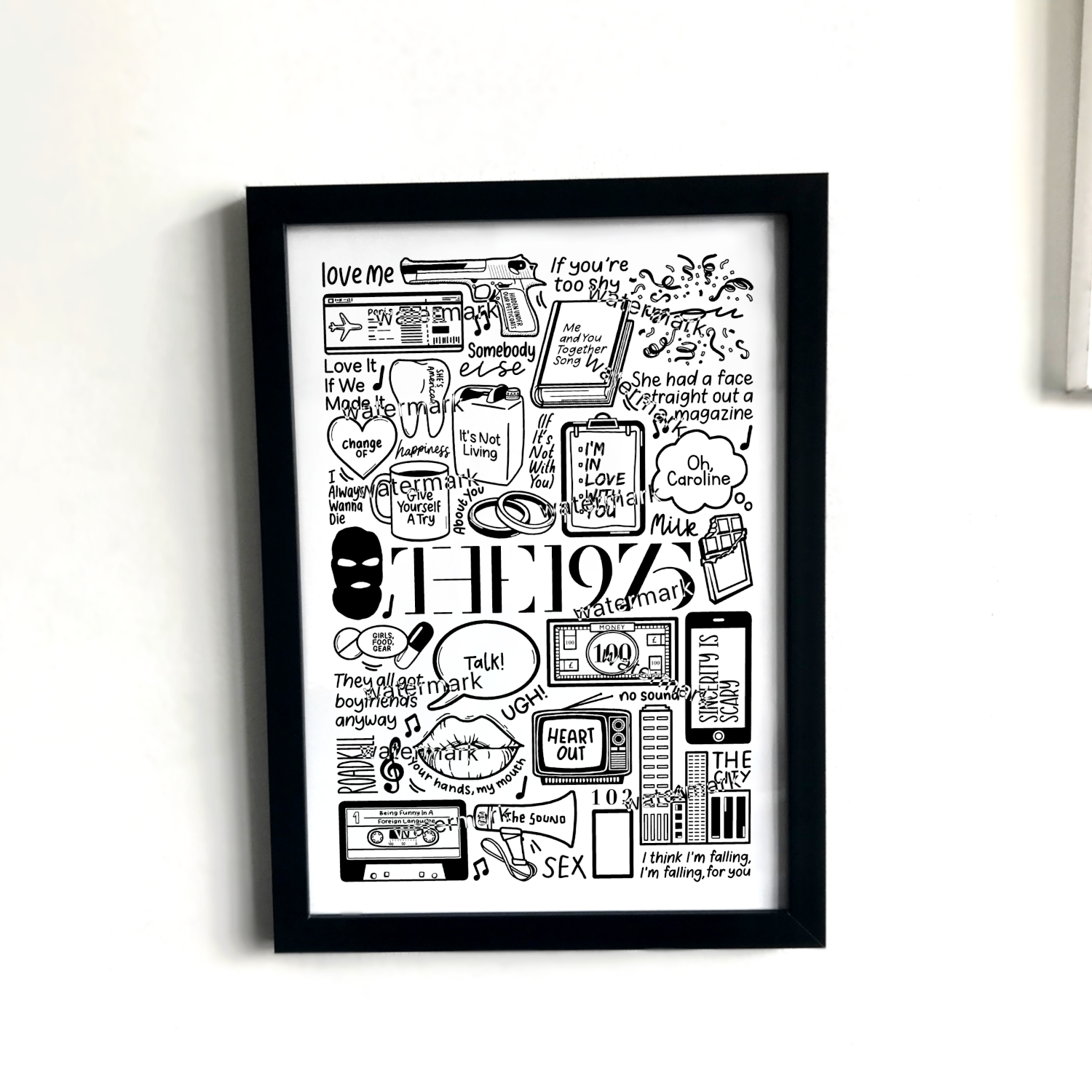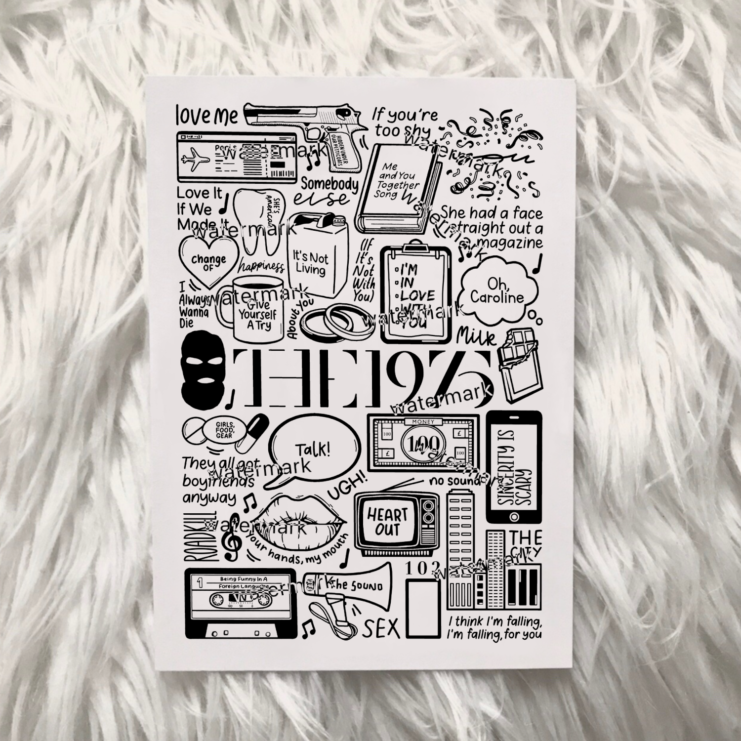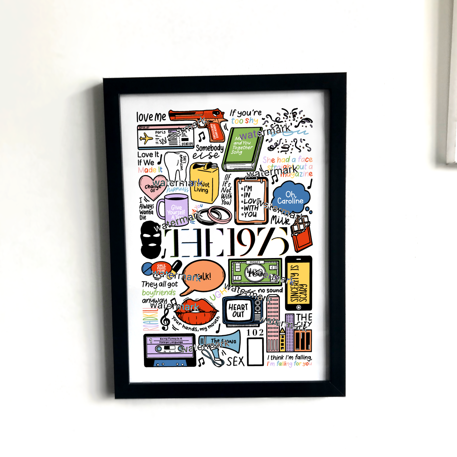 🎶 L'affiche de 1975 a été créée à l'aide d'un iPad et d'un Apple Pencil. Elle comprend des images plus récentes et à jour liées aux titres et aux paroles de leurs chansons.