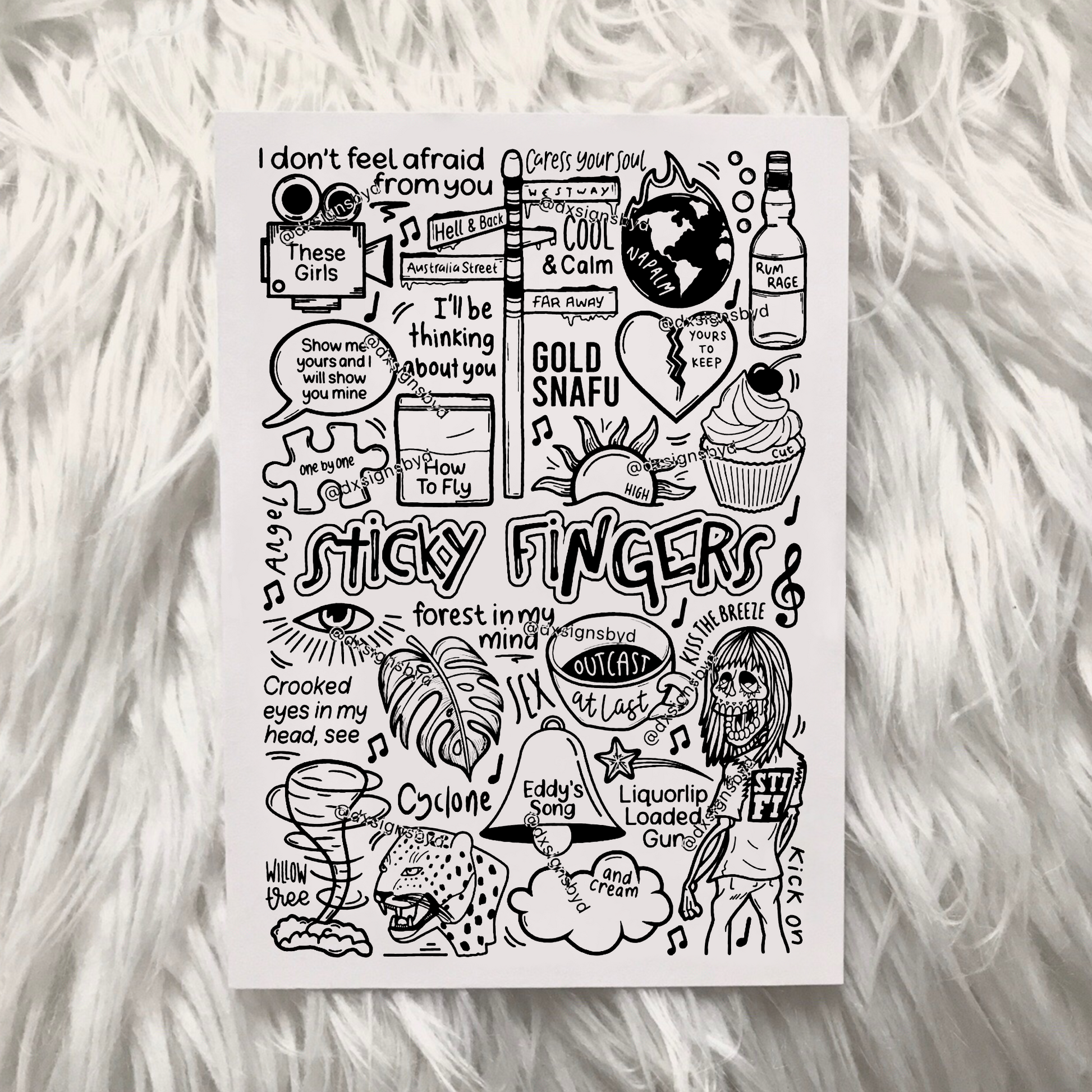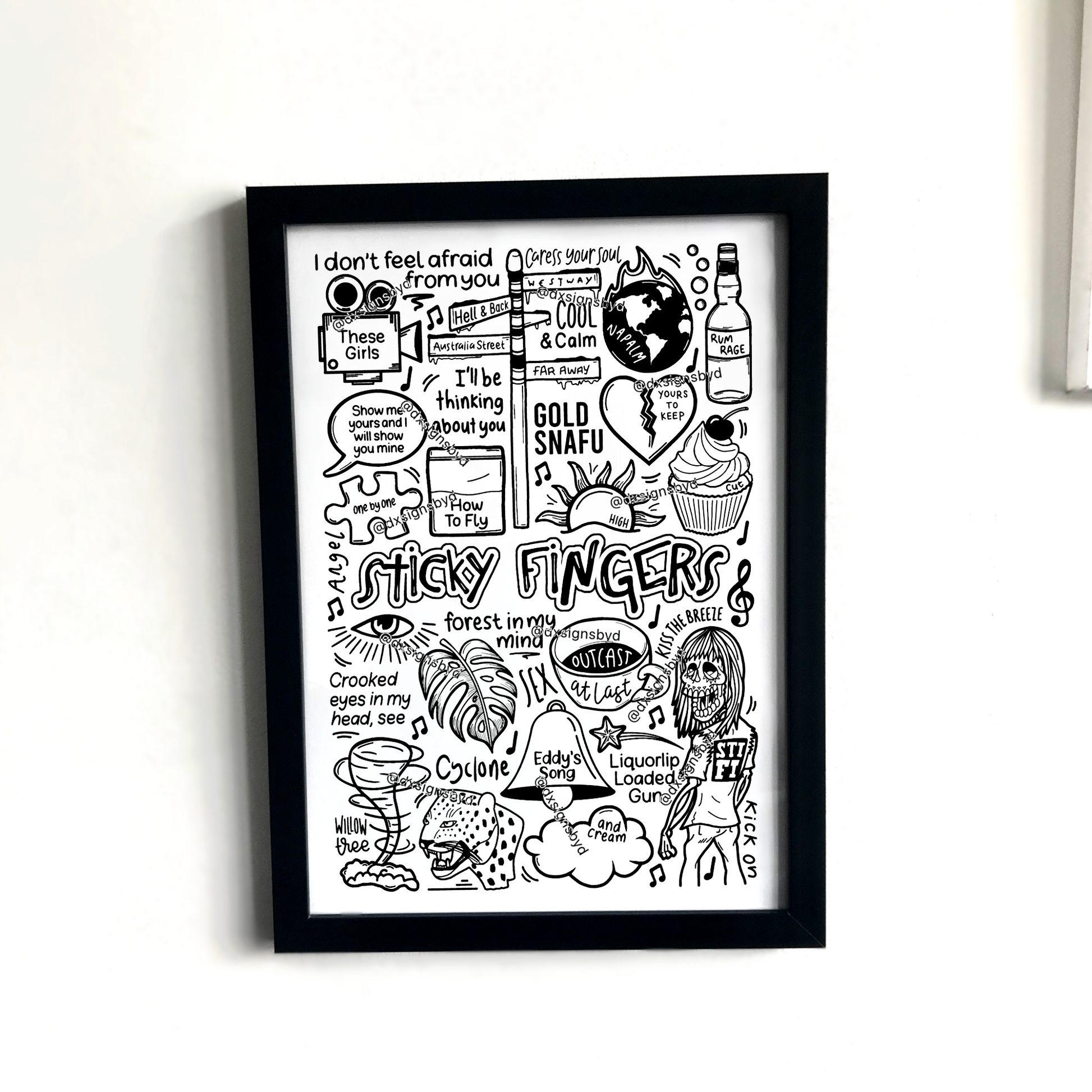 🎶Affiche Sticky Fingers avec des images et des paroles de chansons de leurs albums tels que Yours To Keep, Westway (The glitter & the slums) et Land Of Pleasure, avec des chansons telles que One By One, Outcast At Last et Sad Songs.