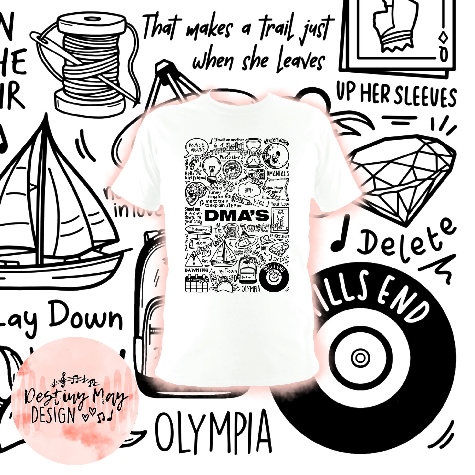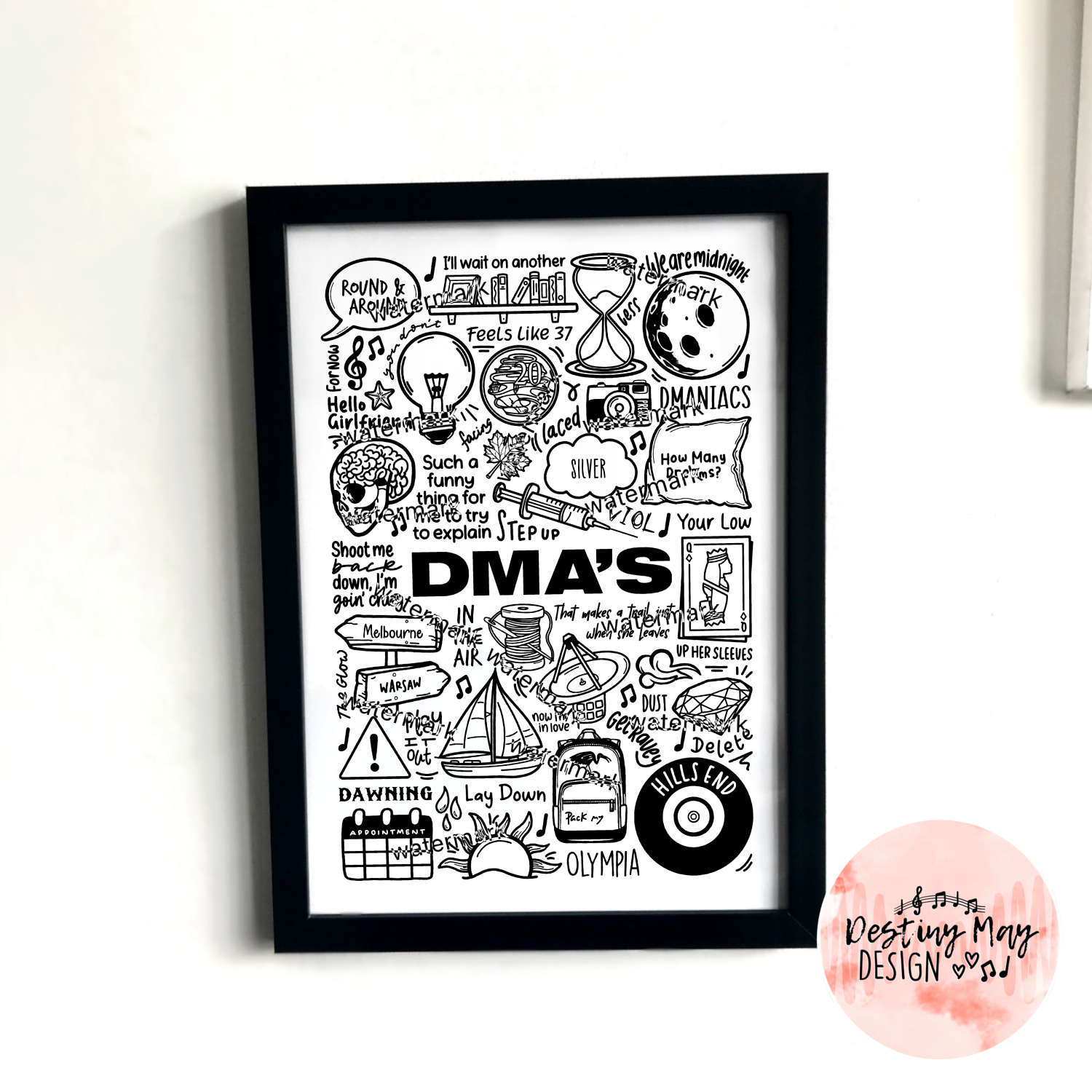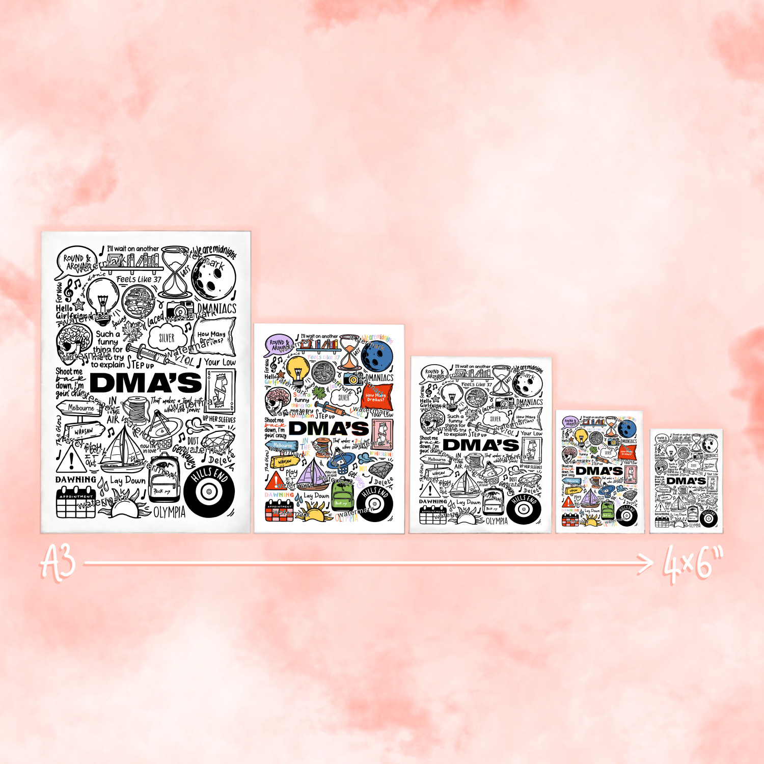 Affiche de DMA comprenant des images et des paroles de chansons de leurs albums.