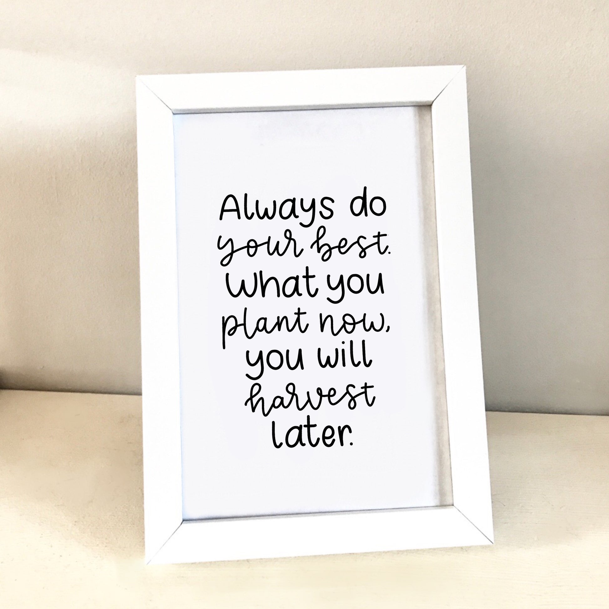 🖤« Faites toujours de votre mieux, ce que vous plantez maintenant sera récolté plus tard » citation dans une variété de polices manuscrites.