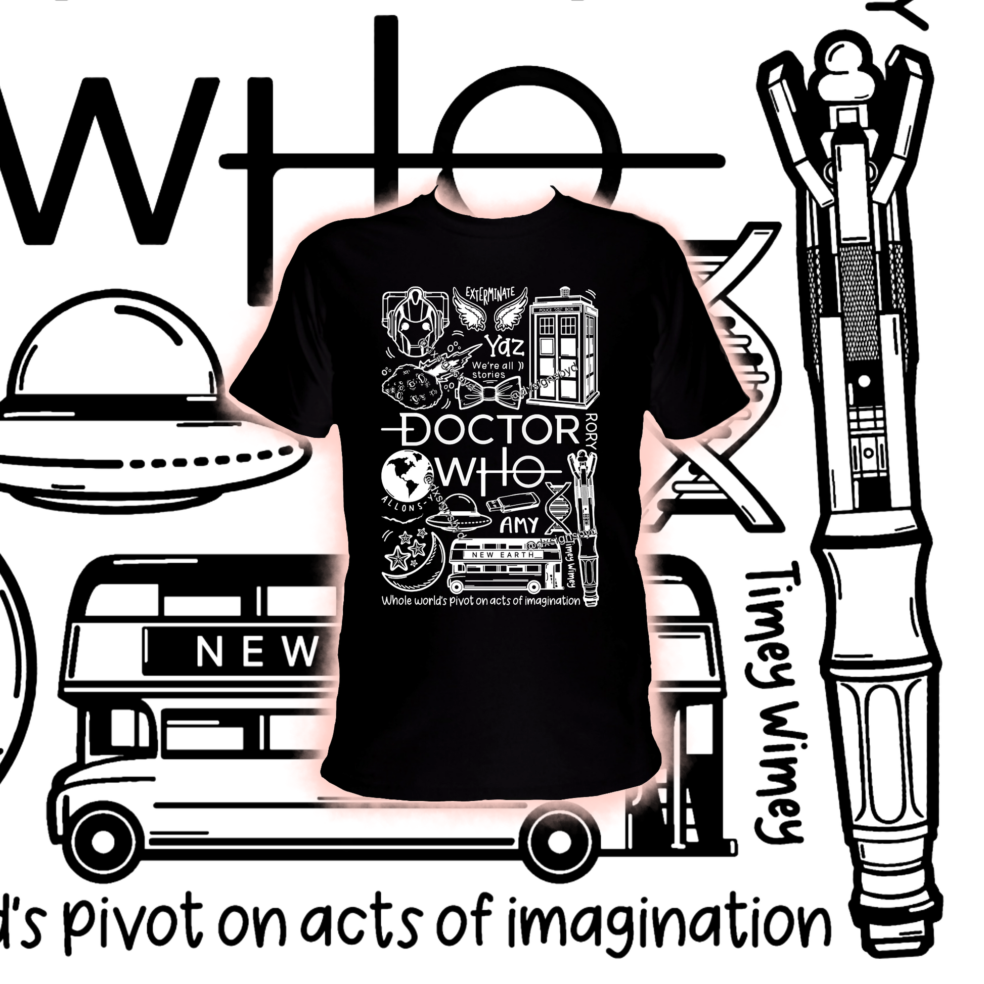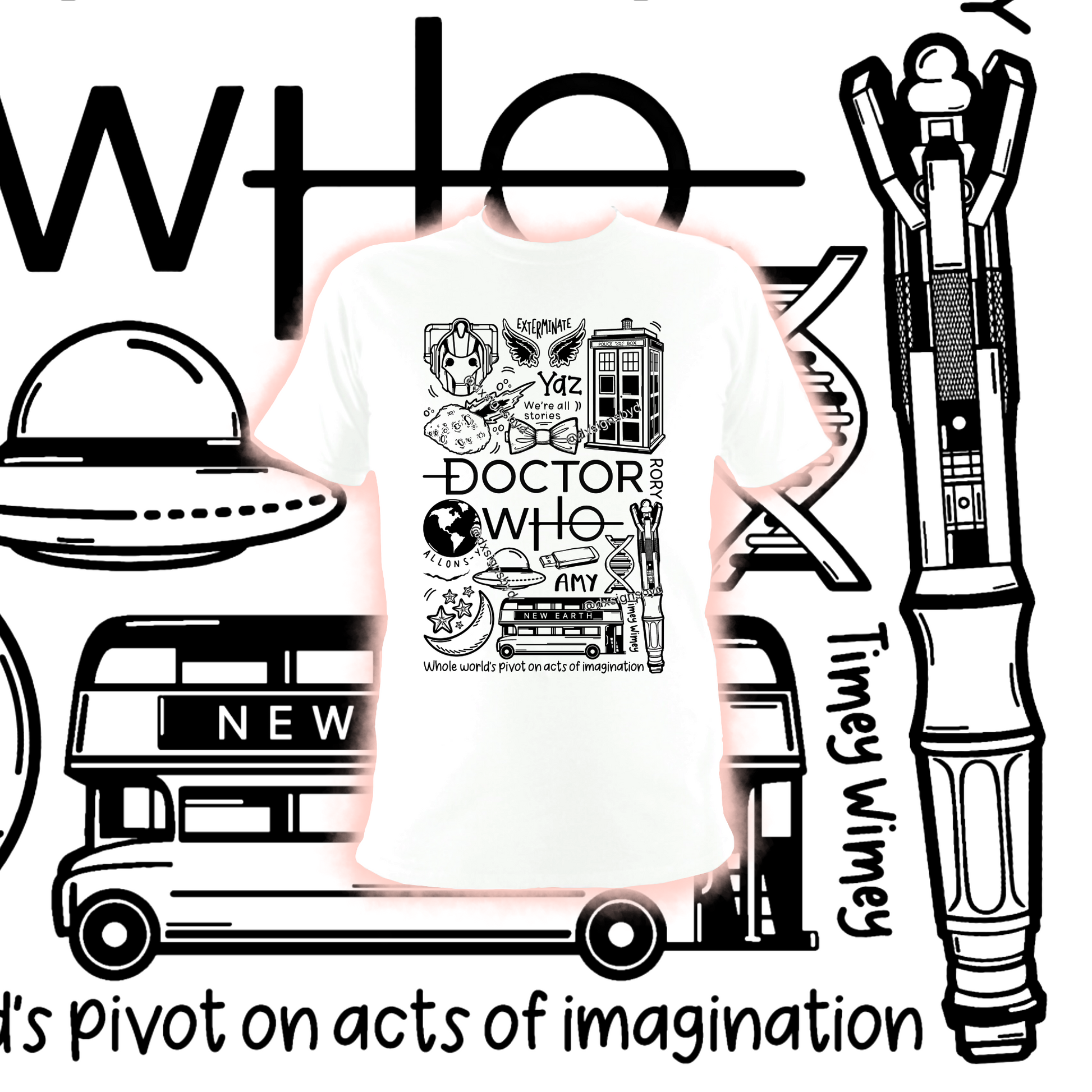 T-shirt unisexe Doctor Who en coton imprimé professionnellement en noir ou blanc.