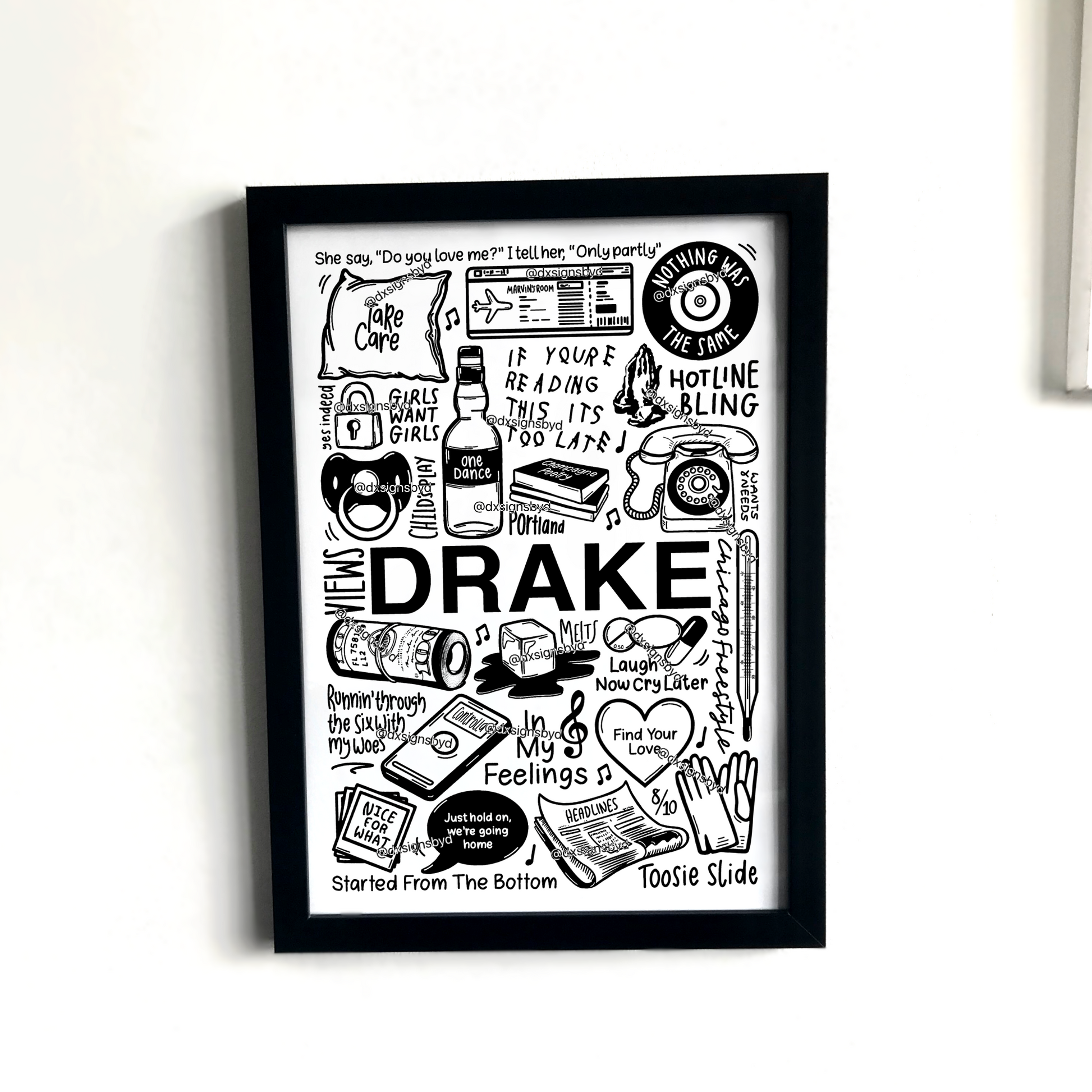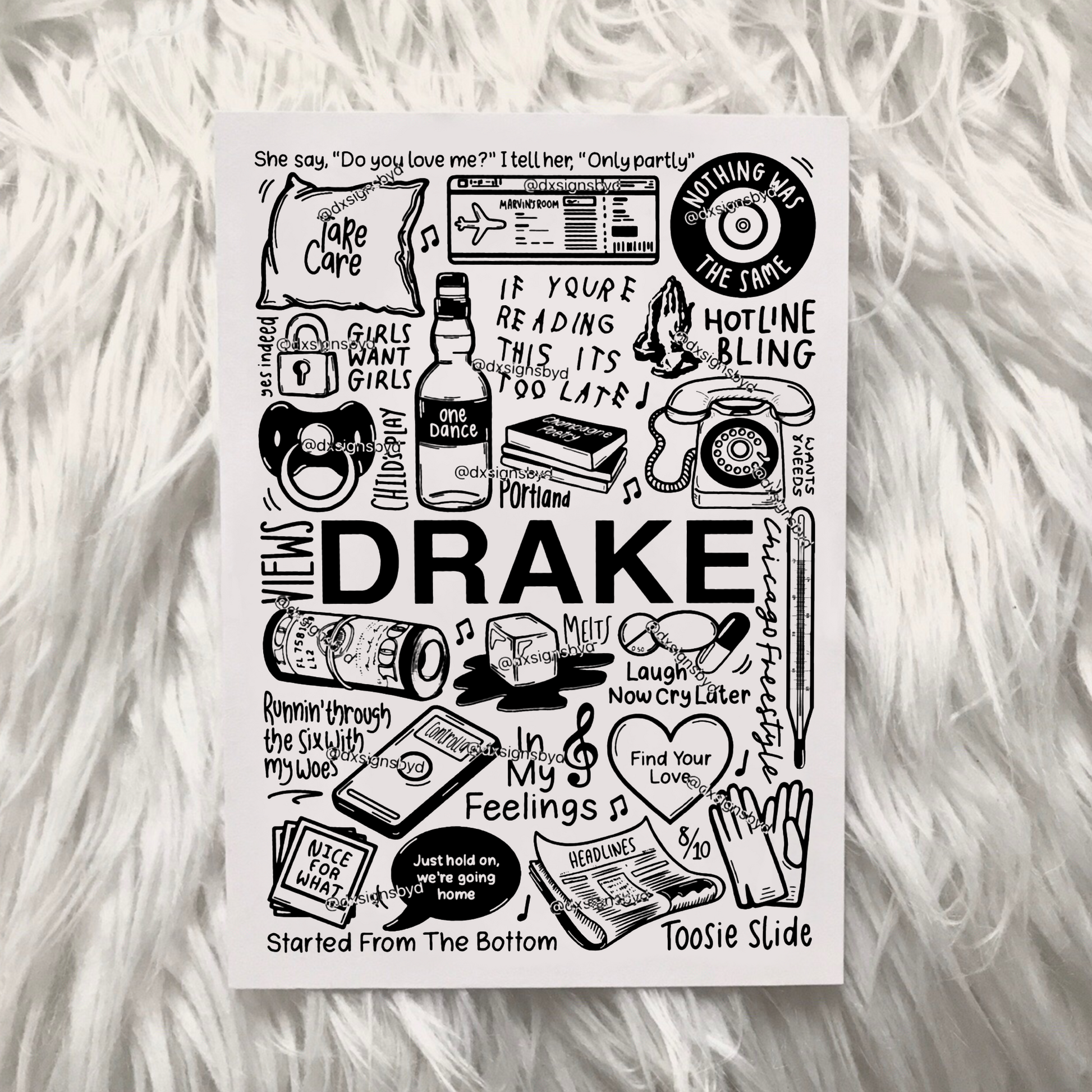 🎶Affiche de Drake qui comprend des images et des paroles de chansons de son album.