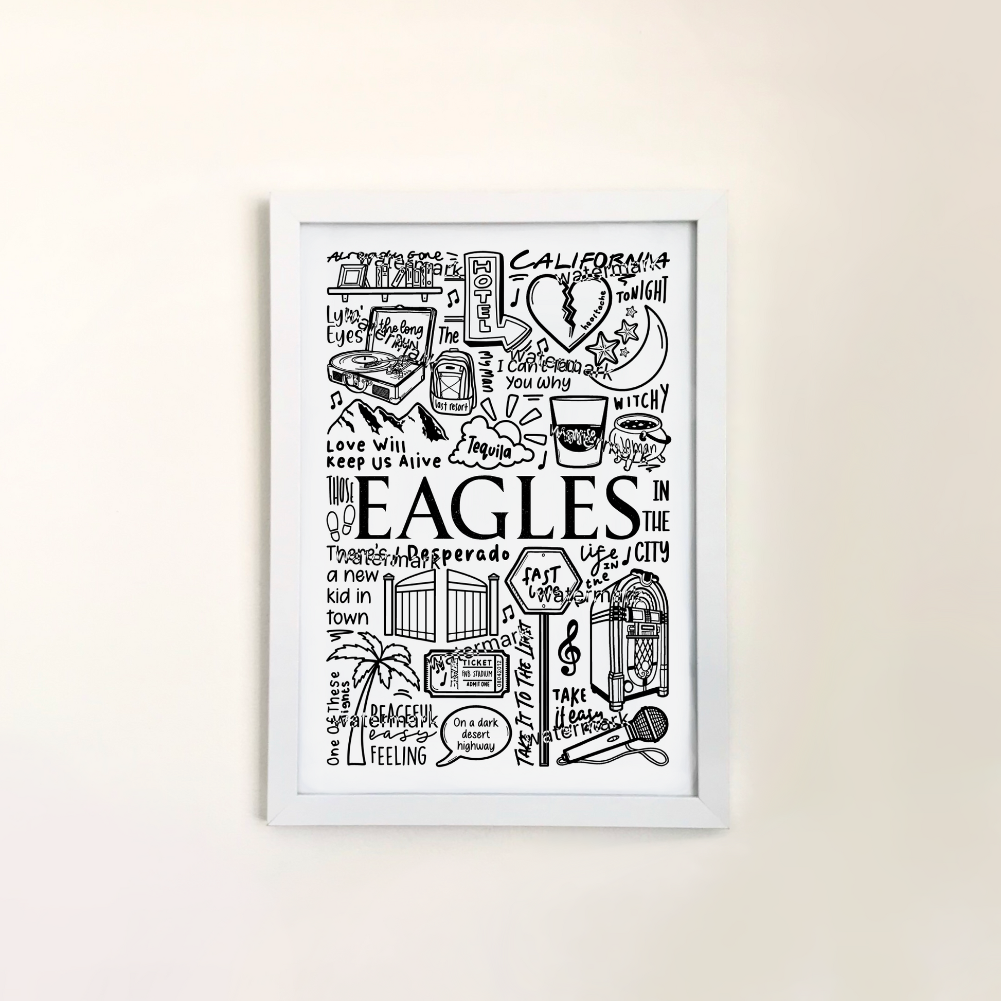 🎶 Art mural des Eagles comprenant des images, des paroles et des titres de chansons de leurs albums.