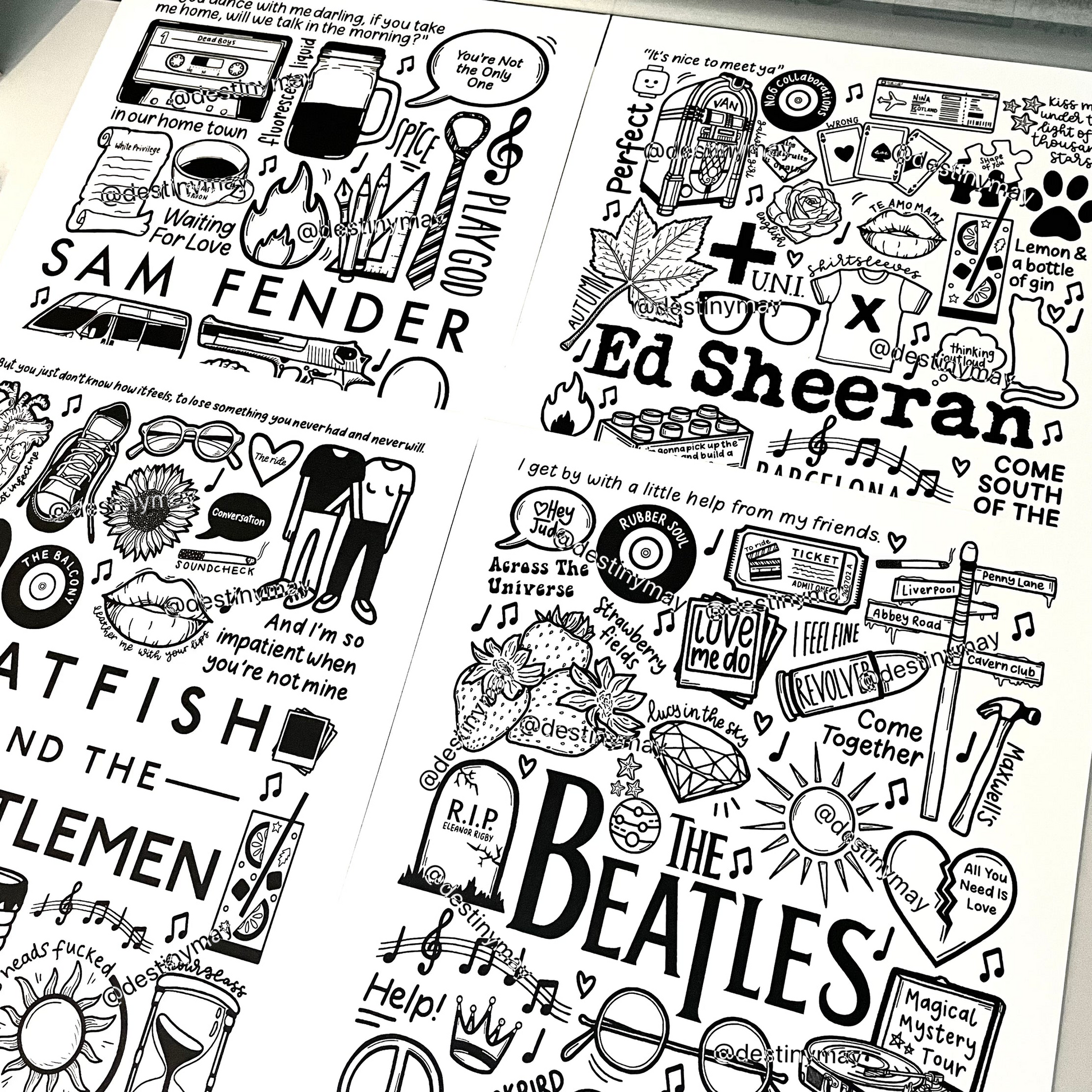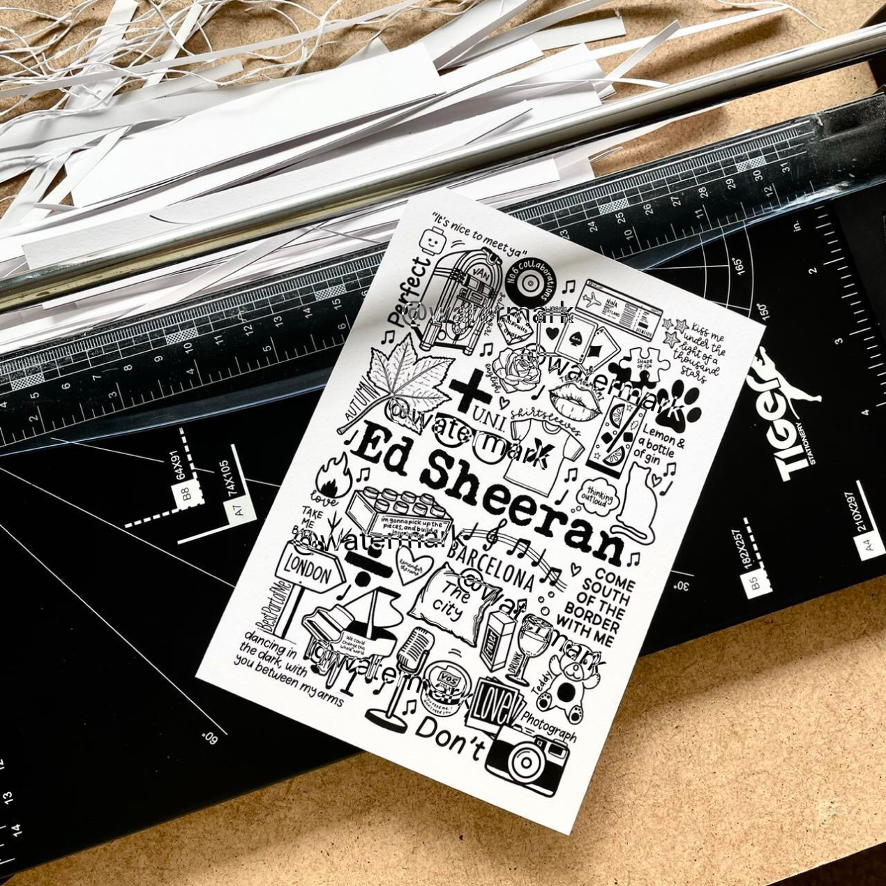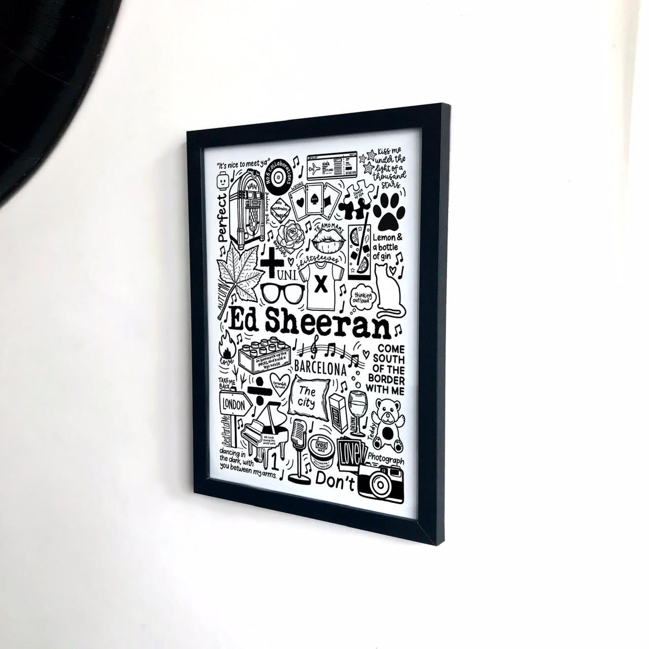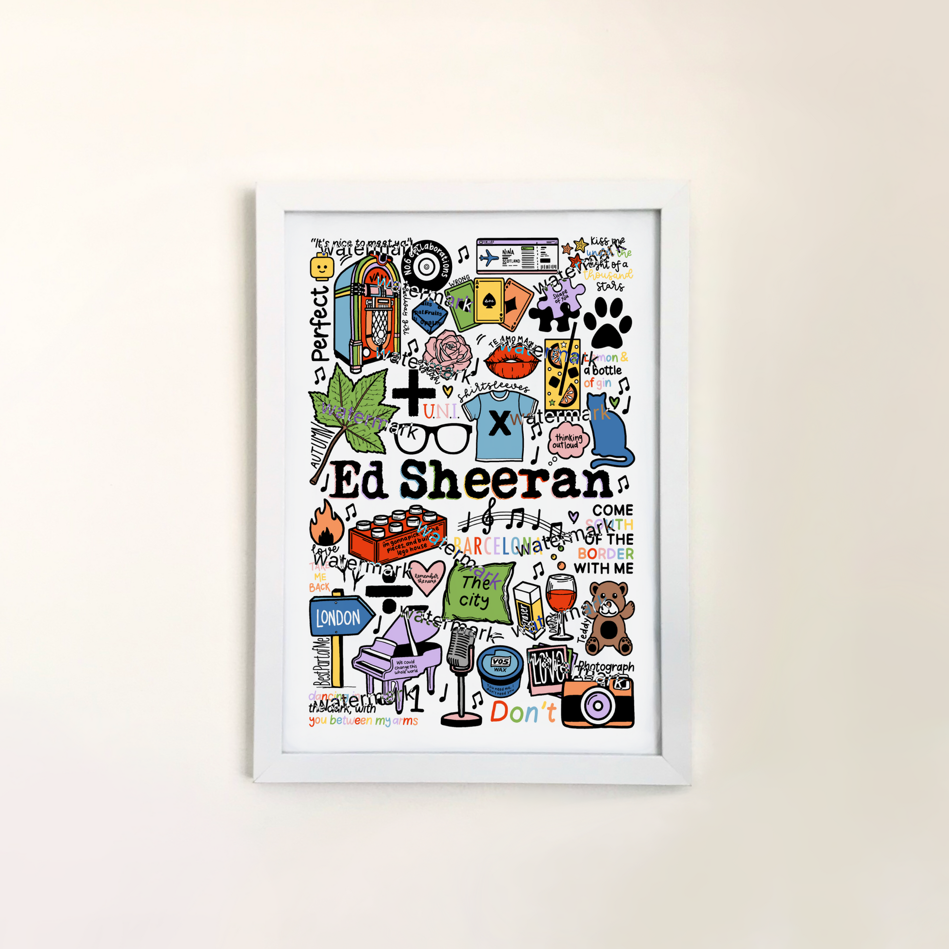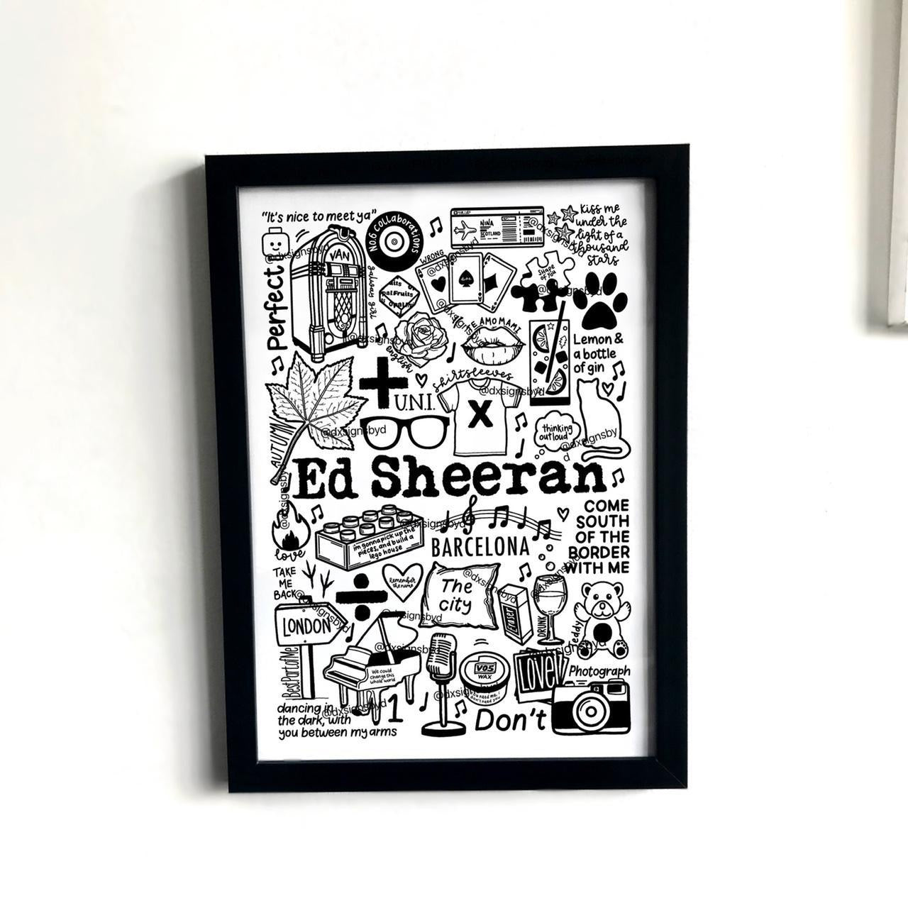 🎶Affiche d'Ed Sheeran avec des images et des paroles de chansons de leurs albums tels que =, +, Divide, Multiply et No. 6 Collaborations.