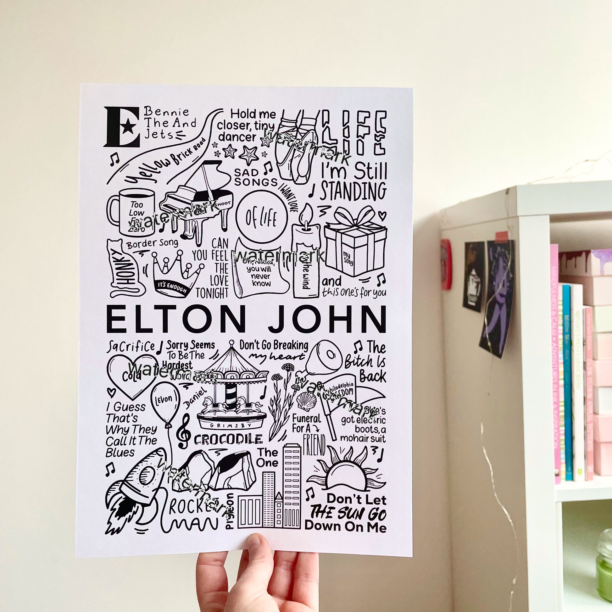 T-shirt unisexe Elton John en coton imprimé professionnellement en noir ou blanc.