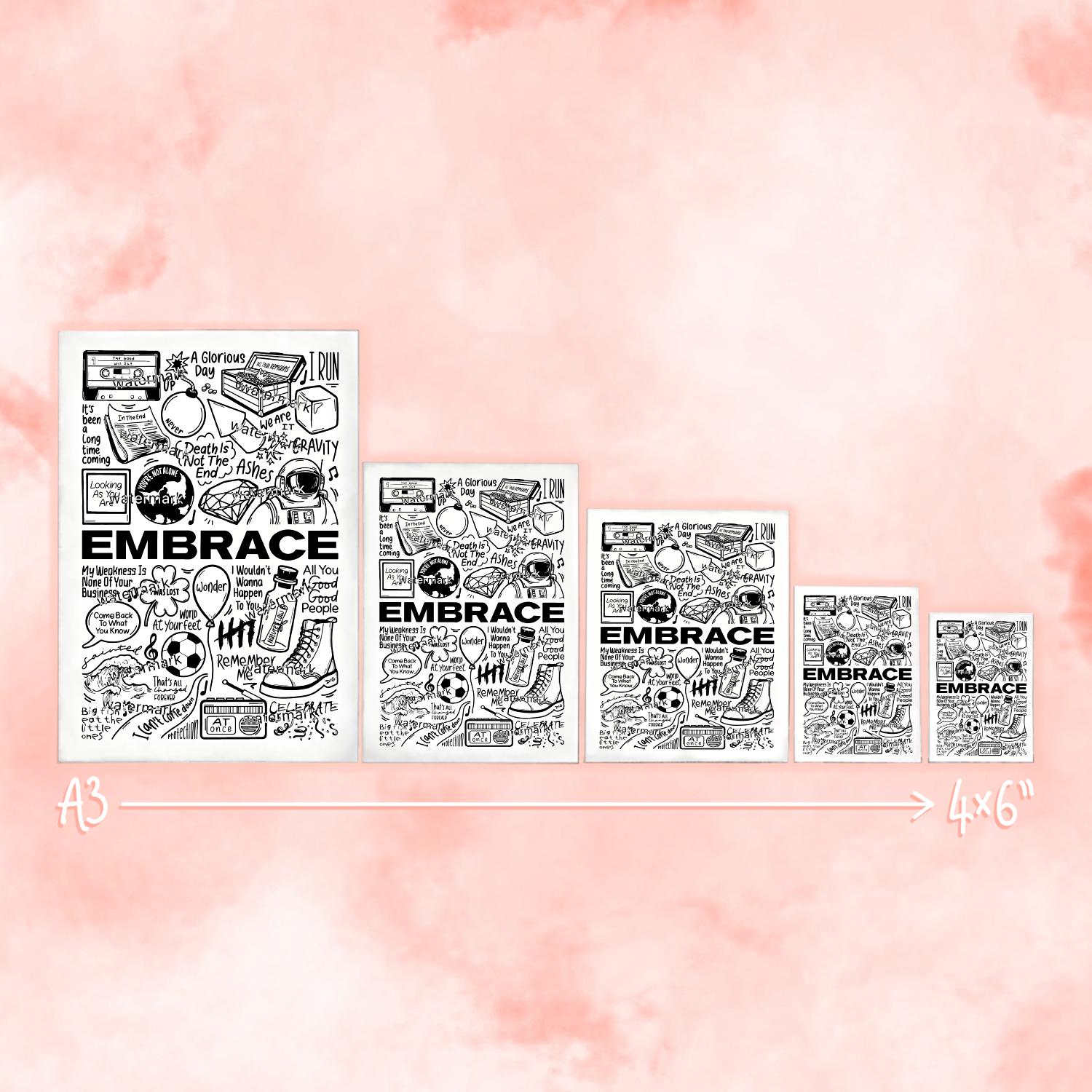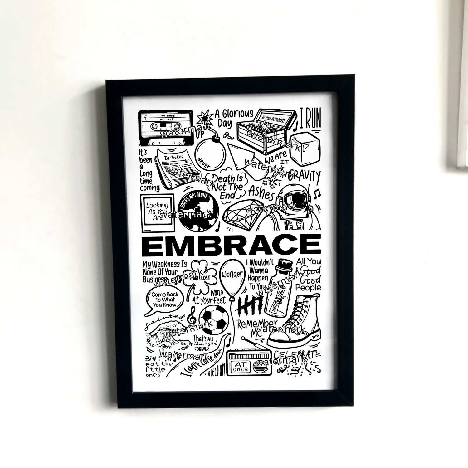 🎶Affiche imprimée Embrace créée à l'aide d'un iPad et d'un crayon Apple. Elle comprend des images et des paroles de chansons de leurs albums