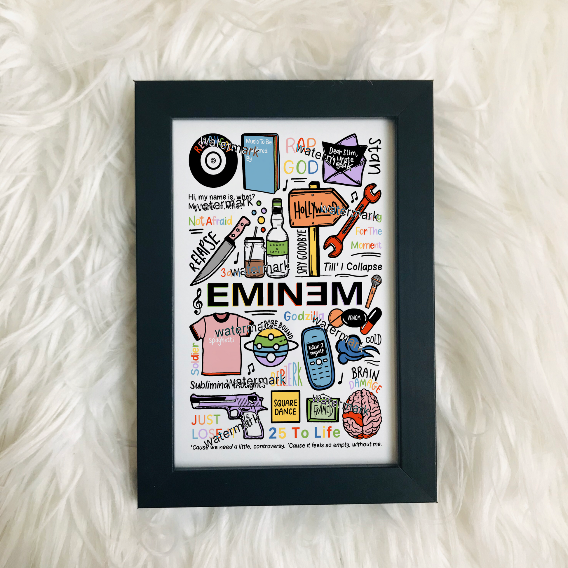 🎶Affiche imprimée d'Eminem créée à l'aide d'un iPad et d'un Apple Pencil. Elle comprend des images et des paroles de chansons de ses albums tels que The Eminem Show, Recovery, Relapse, Encore et Music To Be Murdered By.