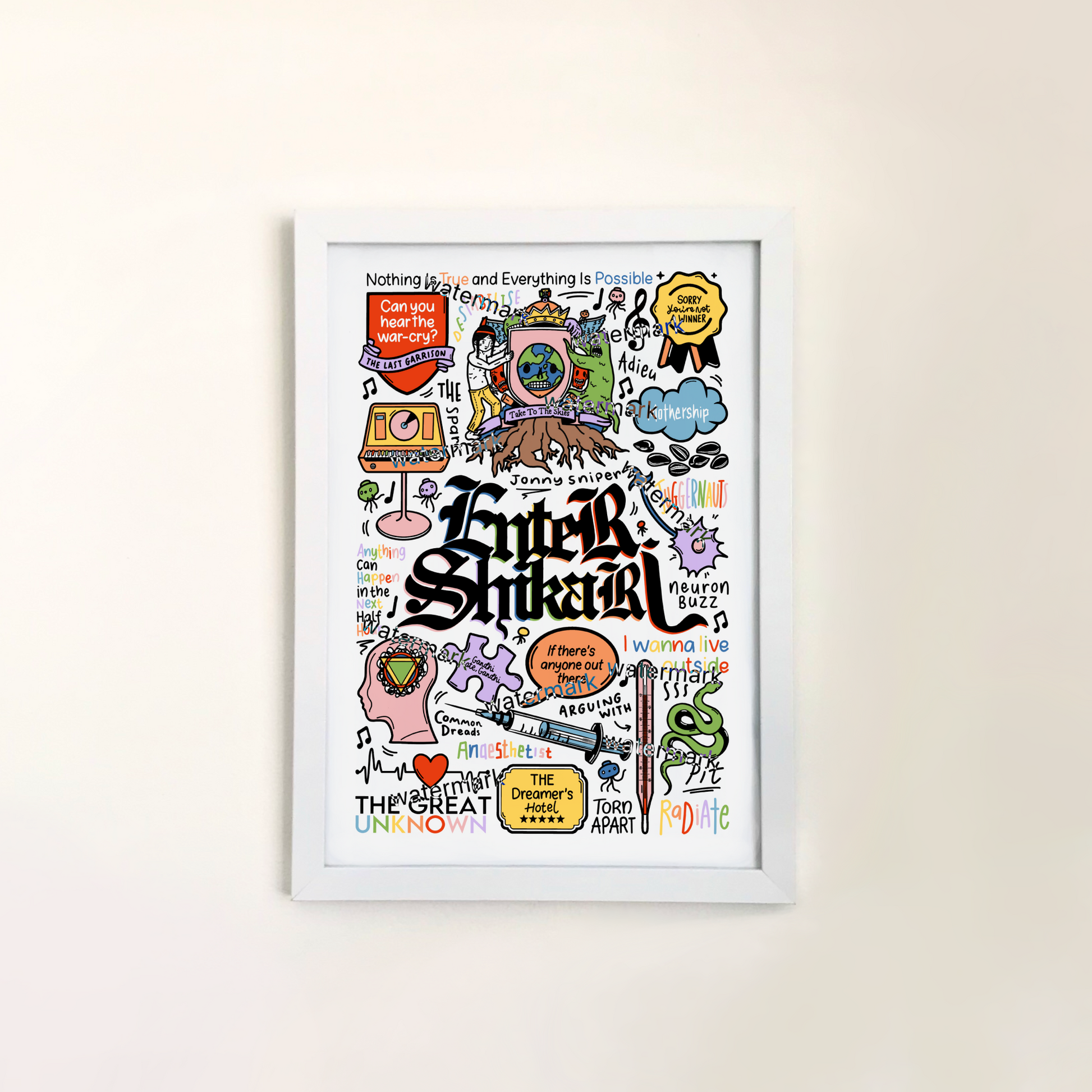 🎶Entrez dans l'affiche de Shikari avec des images et des paroles de chansons de leurs albums tels que Take To The Skies, Common Dreads, The Mindsweep, The Spark et Nothing Is True & Everything Is Possible.