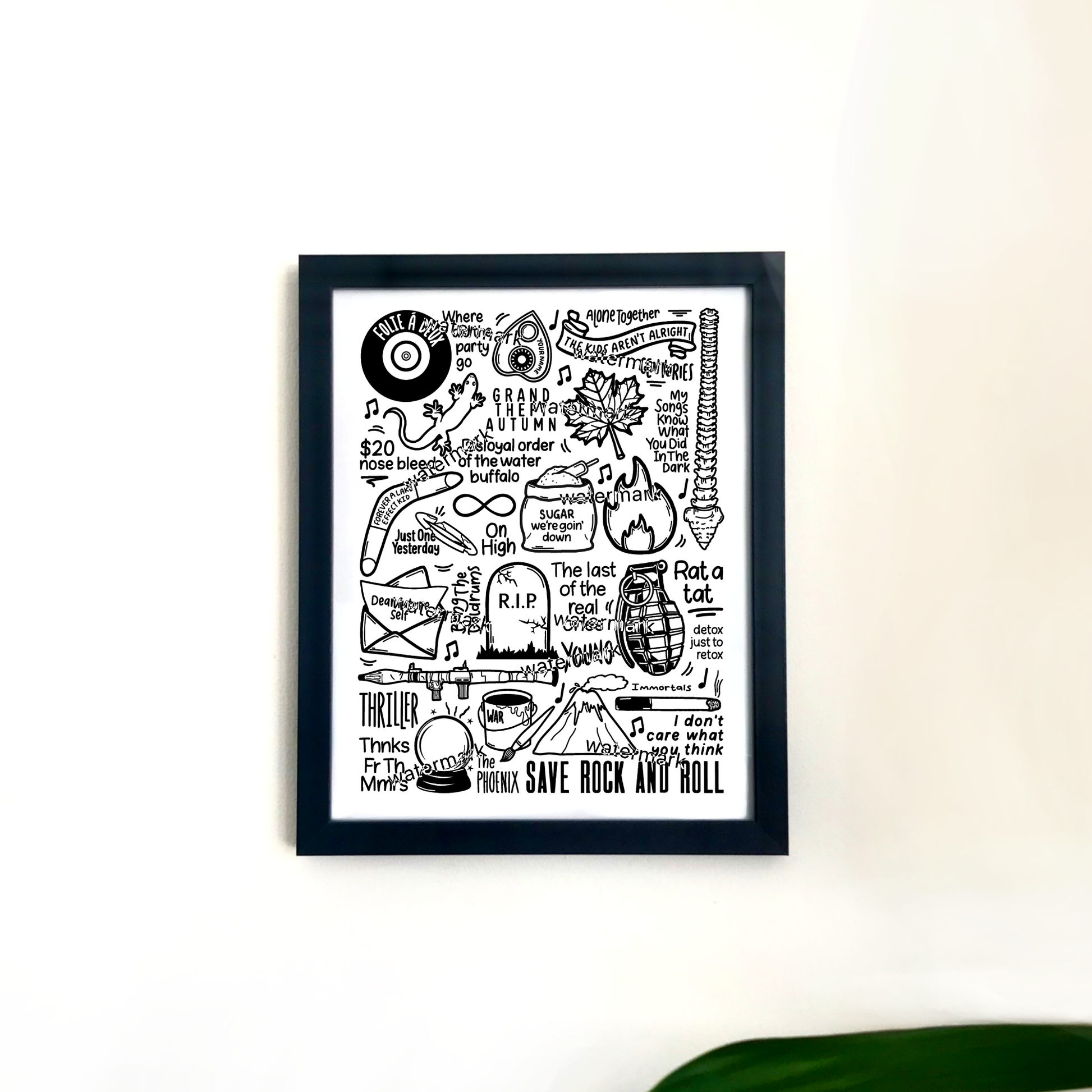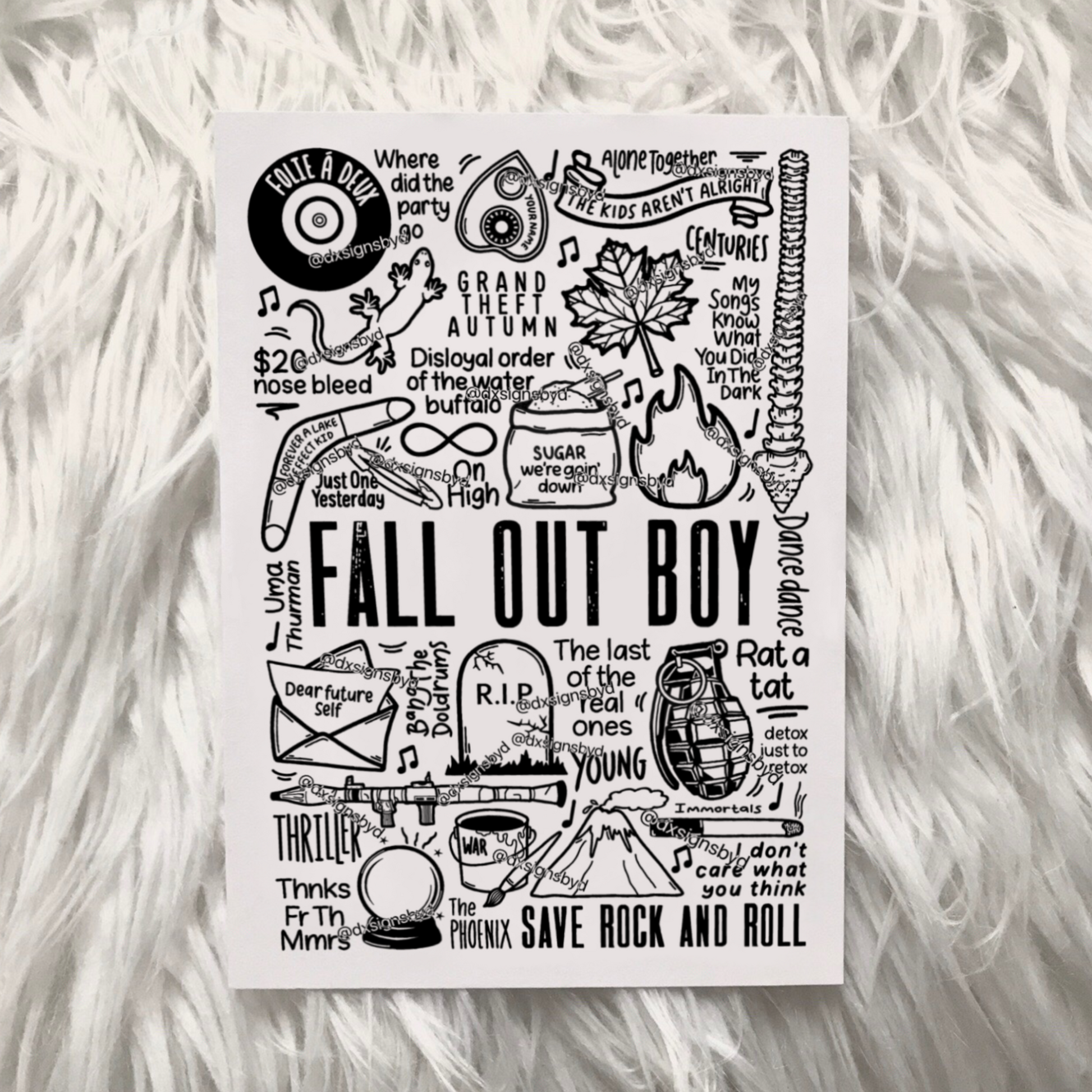 🎶Affiche de Fall Out Boy qui comprend des images et des paroles de chansons de leurs albums tels que Save Rock And Roll, From Under The Cork Tree, Mania et Folie a Deux.
