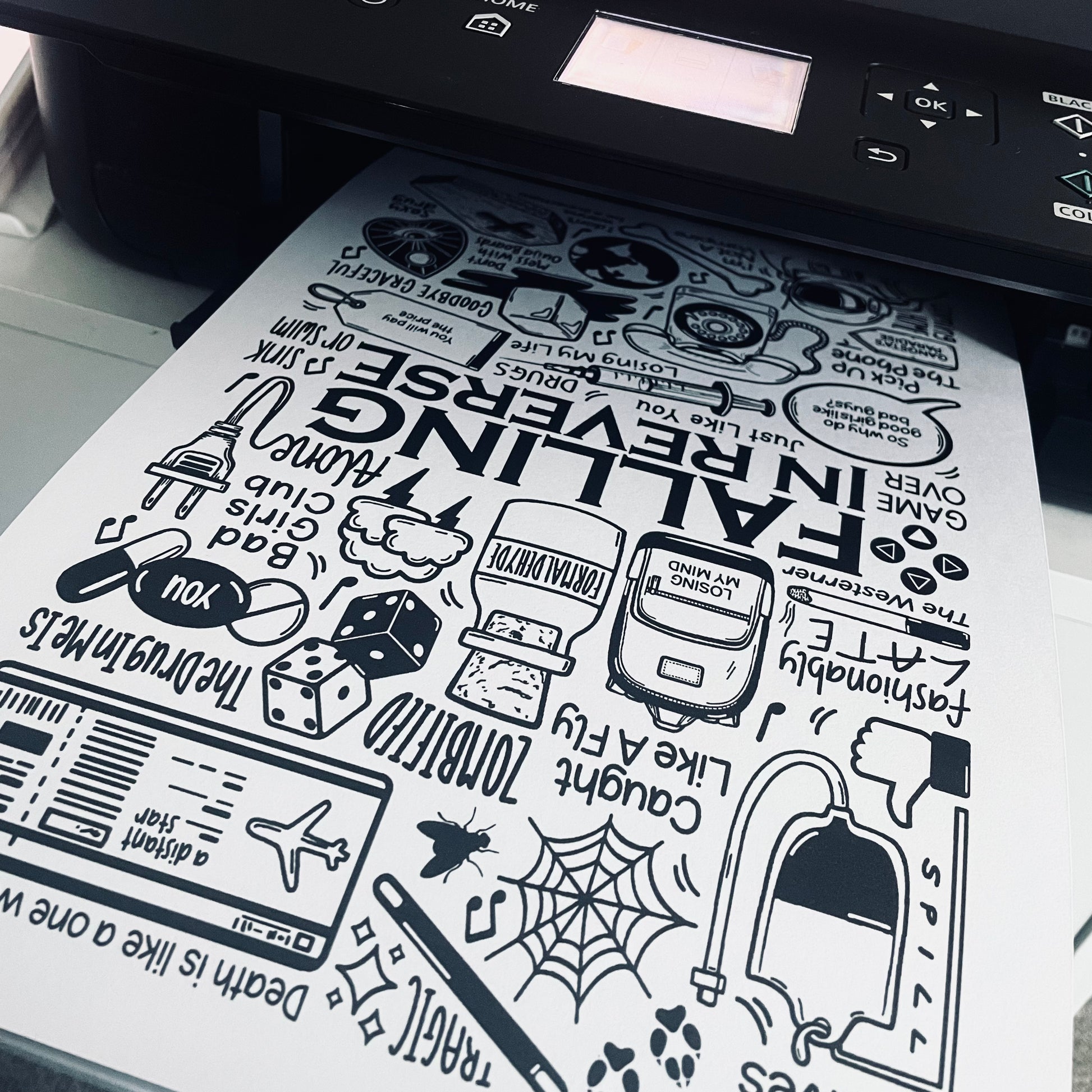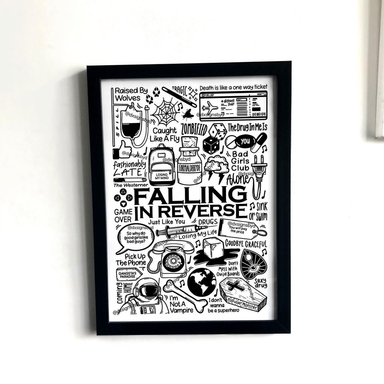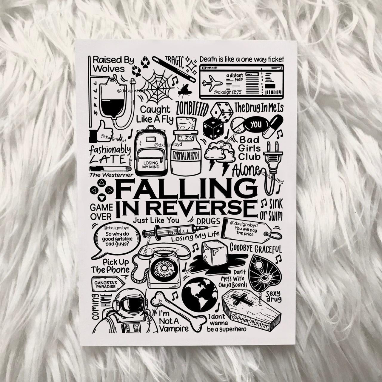 🎶Affiche Falling In Reverse créée à l'aide d'un iPad et d'un Apple Pencil. Elle comprend des images et des paroles de chansons de leurs albums tels que The Drug In Me Is You, Coming Home, Fashionably Late et Just Like You.