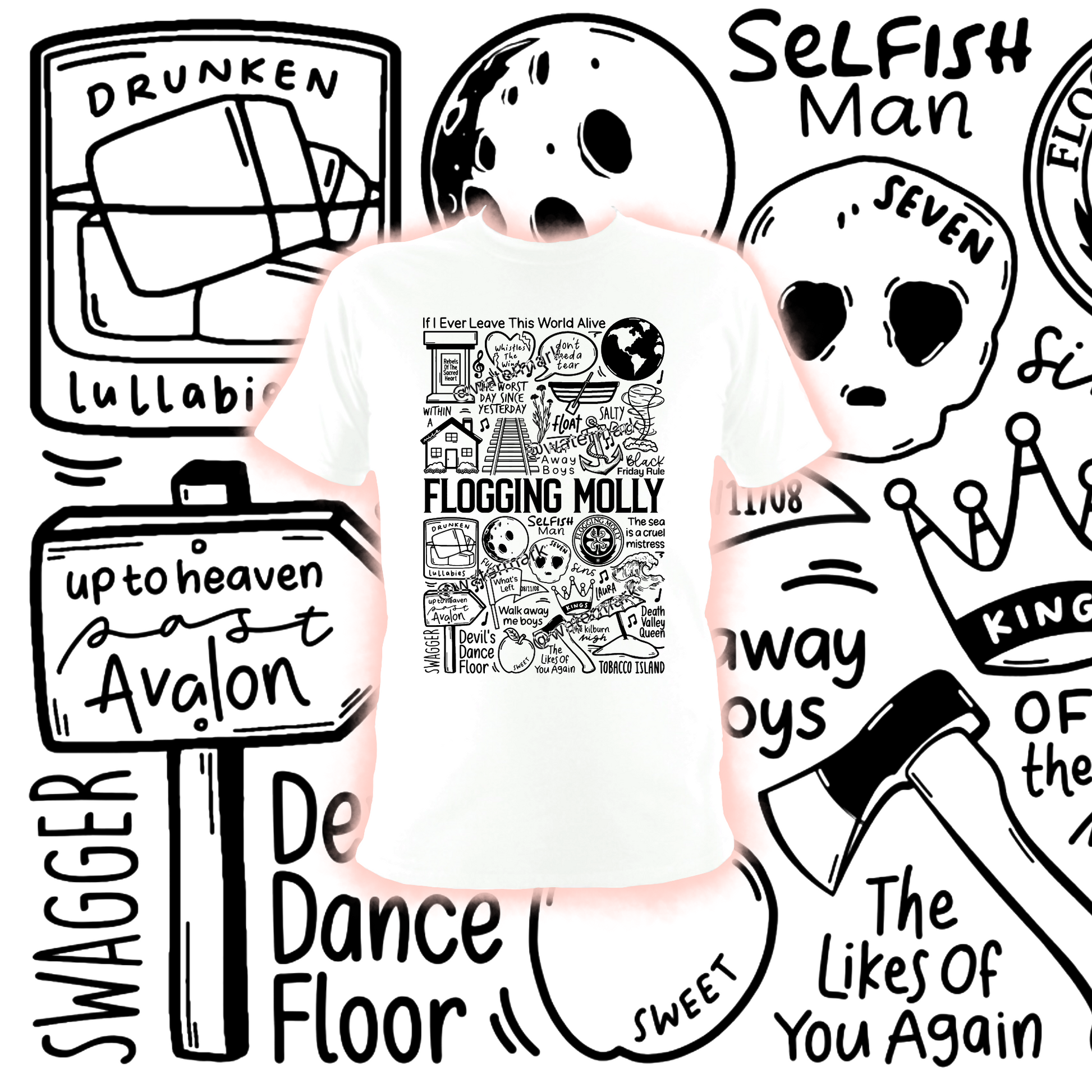 T-shirt unisexe Flogging Molly en coton imprimé professionnellement en noir ou blanc.