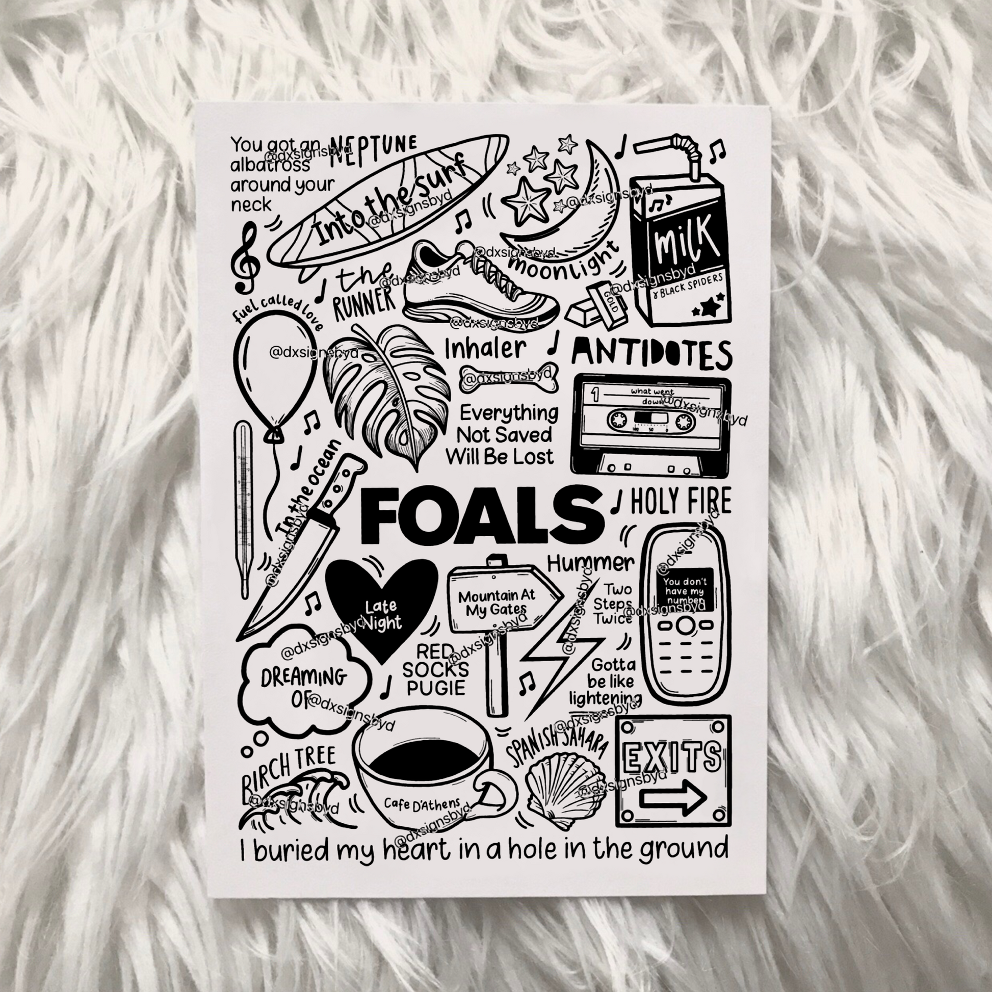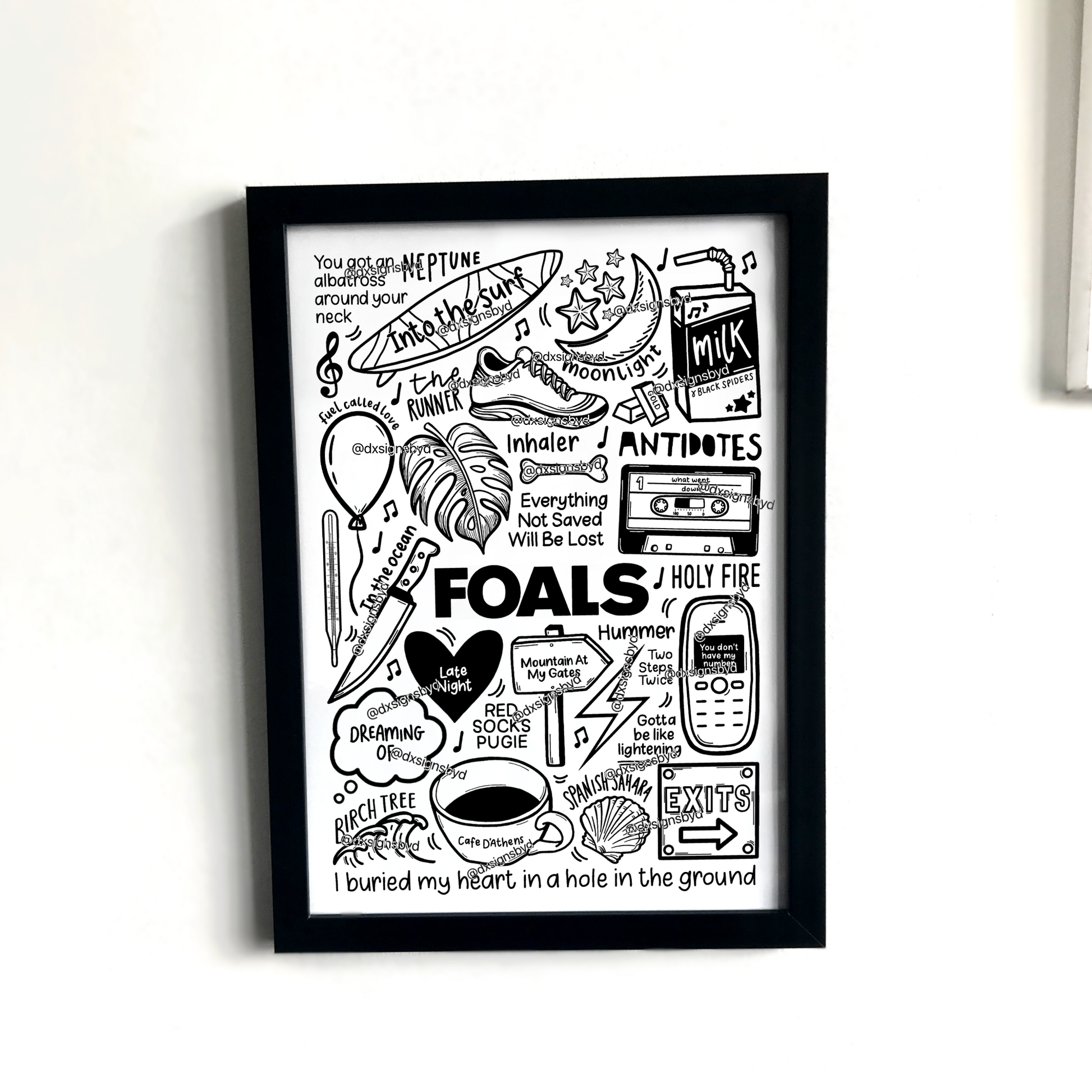 🎶Affiche des Foals qui comprend des images et des paroles de chansons de leurs albums tels que What Went Down, Antidotes et Holy Fire
