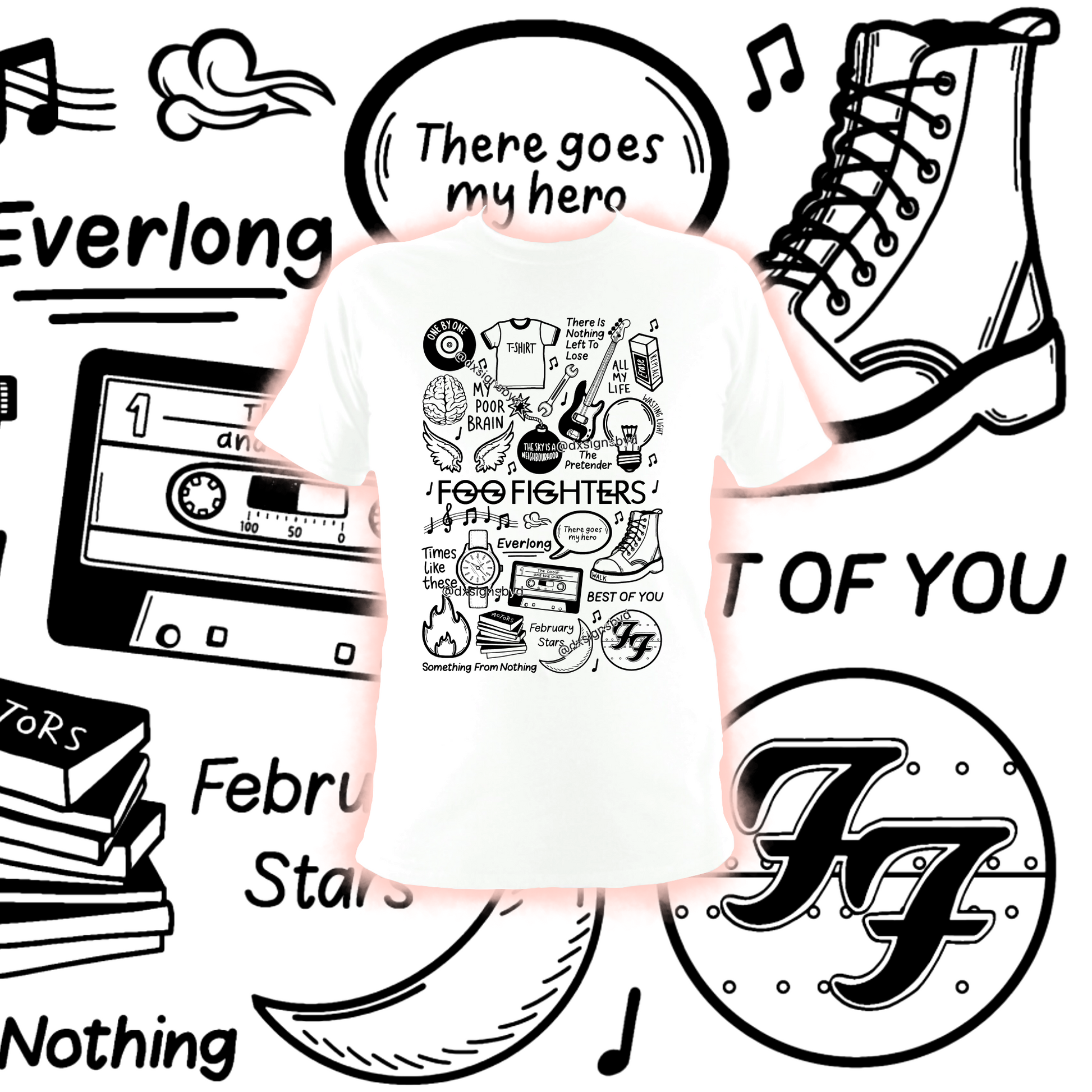 T-shirt unisexe Foo Fighters en coton imprimé professionnellement en noir ou blanc.