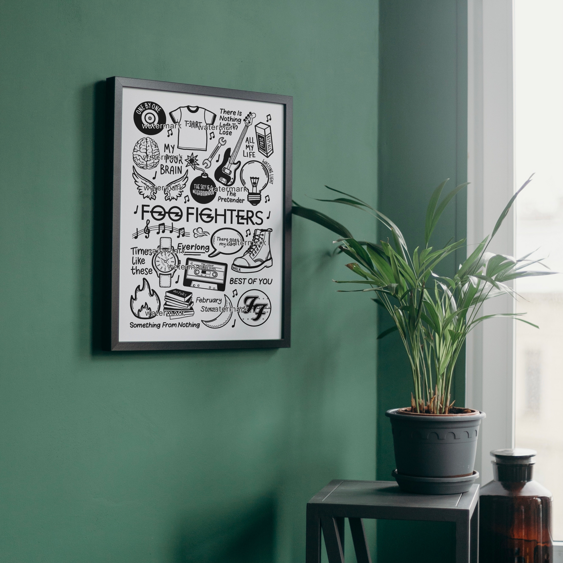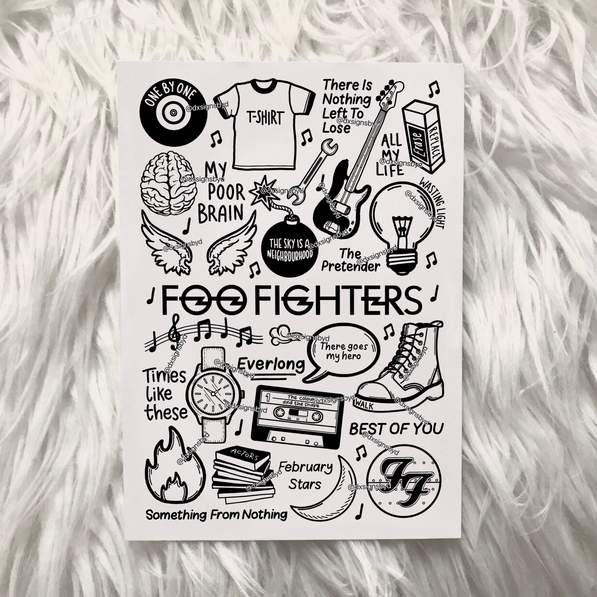 🎶Affiche des Foo Fighters avec des images et des paroles de chansons de leurs albums tels que The Colour And The Shape ; One By One ; Echoes, Silence, Patience, & Grace ; et There Is Nothing Left To Lose.