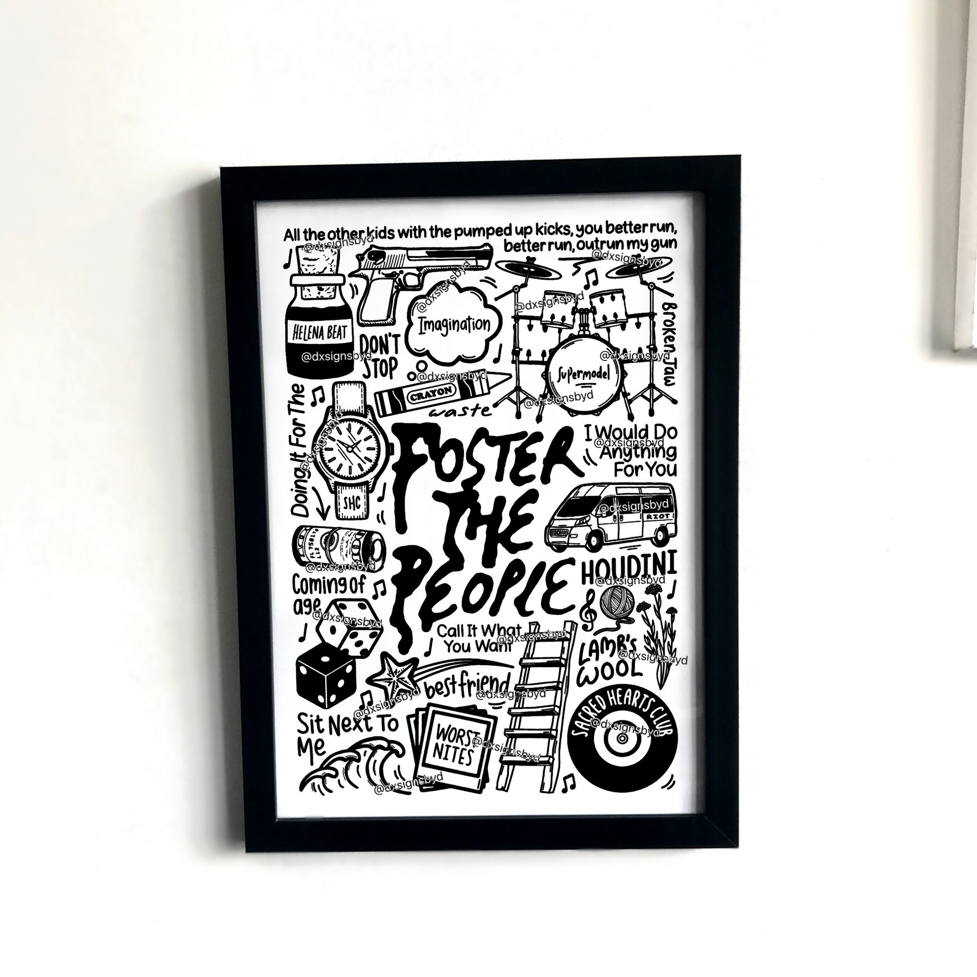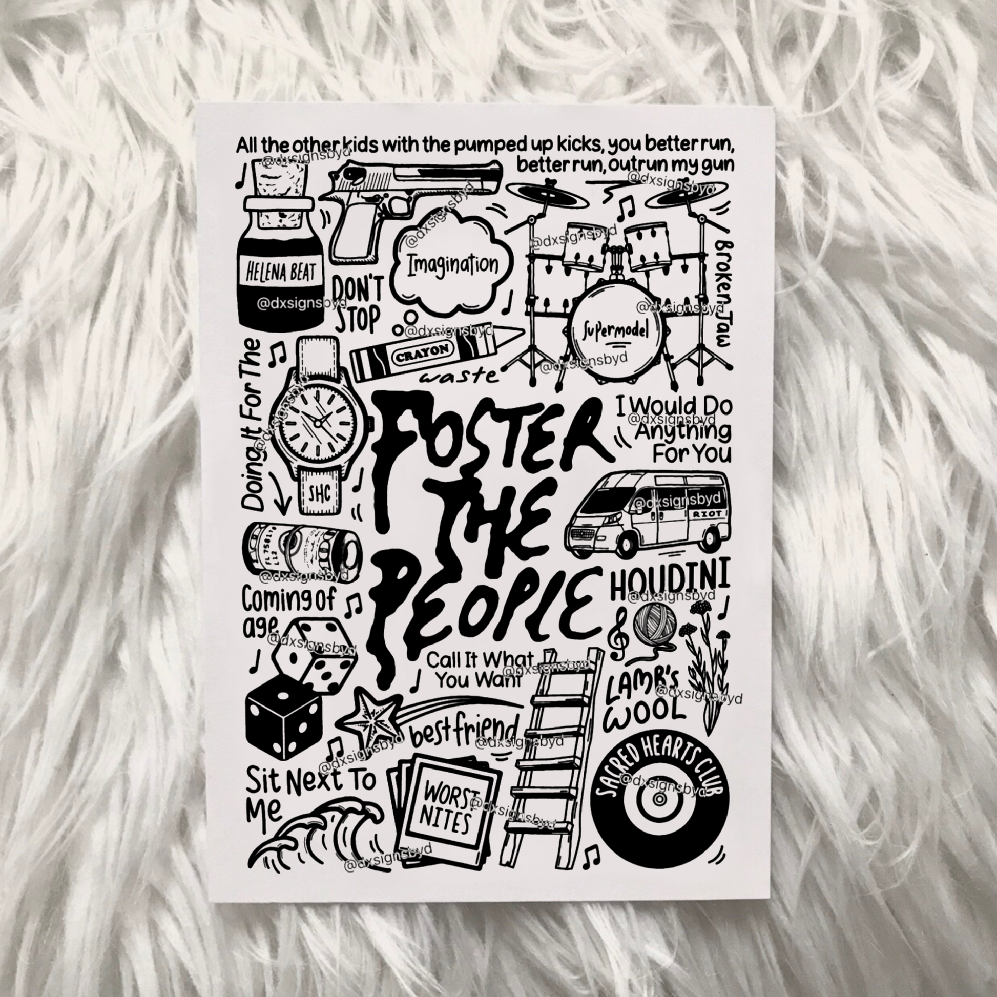 🎶Affiche Foster The People qui comprend des images et des paroles de chansons de leurs albums tels que Torches, Supermodel et Sacred Hearts Club.