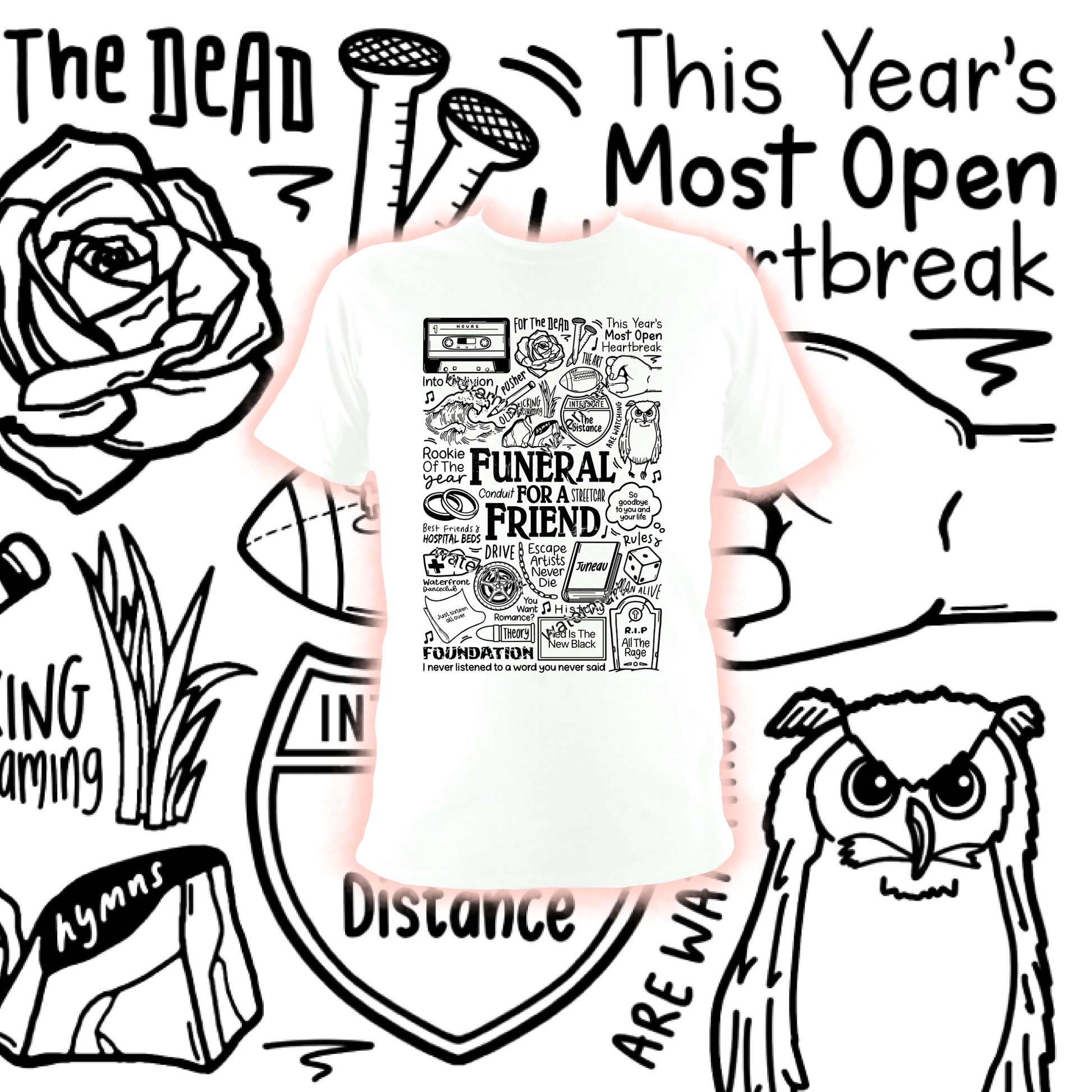 T-shirt unisexe en coton imprimé professionnellement Funeral For A Friend en noir ou blanc.