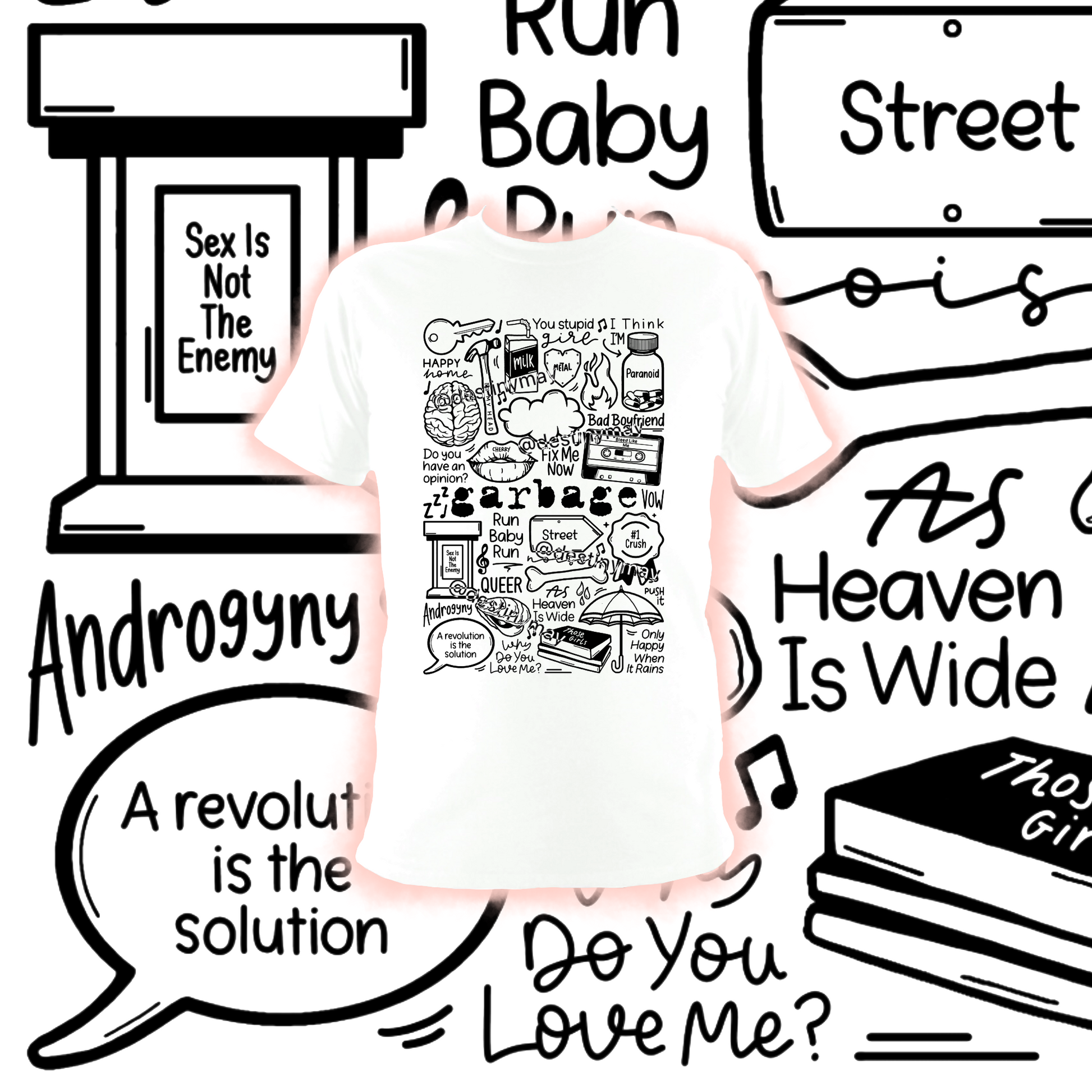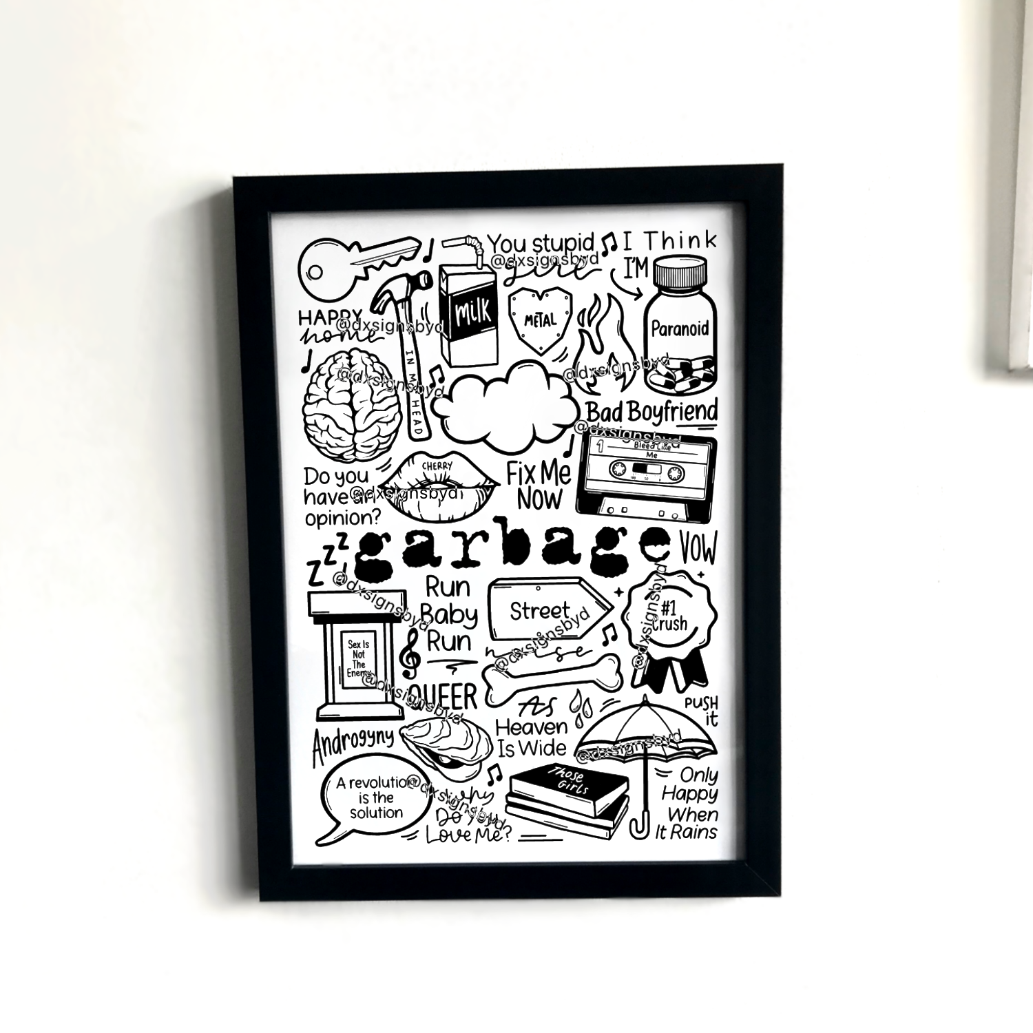 🎶Affiche imprimée Garbage créée à l'aide d'un iPad et d'un Apple Pencil. Elle comprend des images et des paroles de chansons de leurs albums tels que Bleed Like Me et Beautiful Garbage