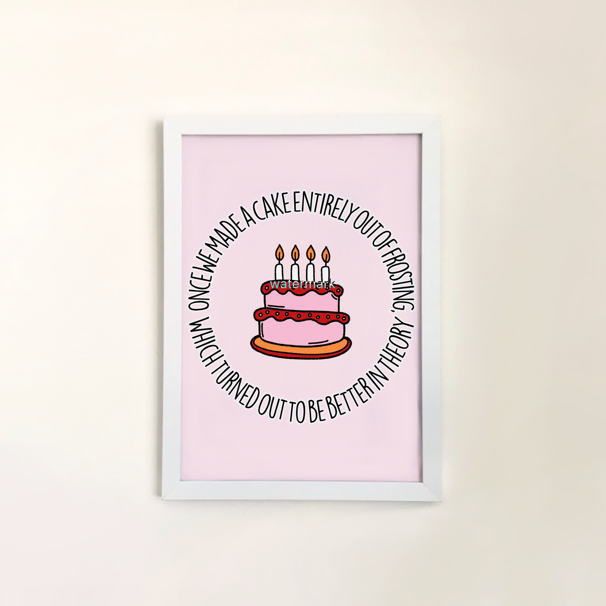 🎂Citation de Rory de Gilmore Girls « Un jour, nous avons fait un gâteau entièrement avec du glaçage, ce qui s'est avéré être meilleur en théorie » sur un fond rose.