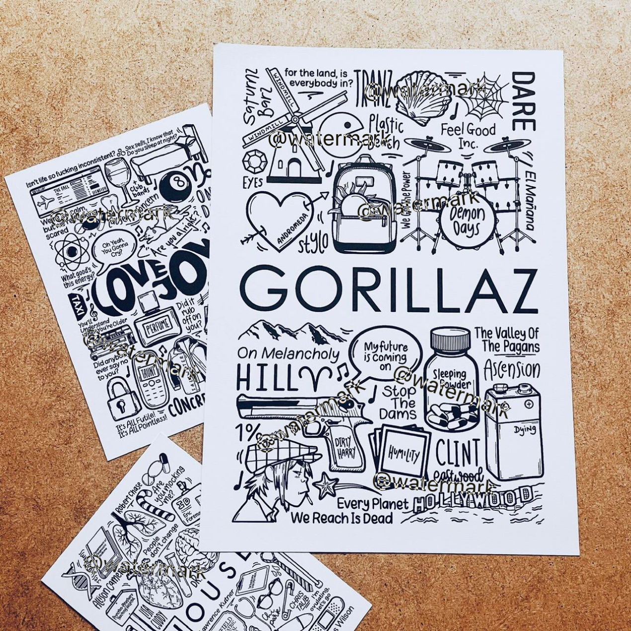 T-shirt unisexe Gorillaz en coton imprimé professionnellement en noir ou blanc.