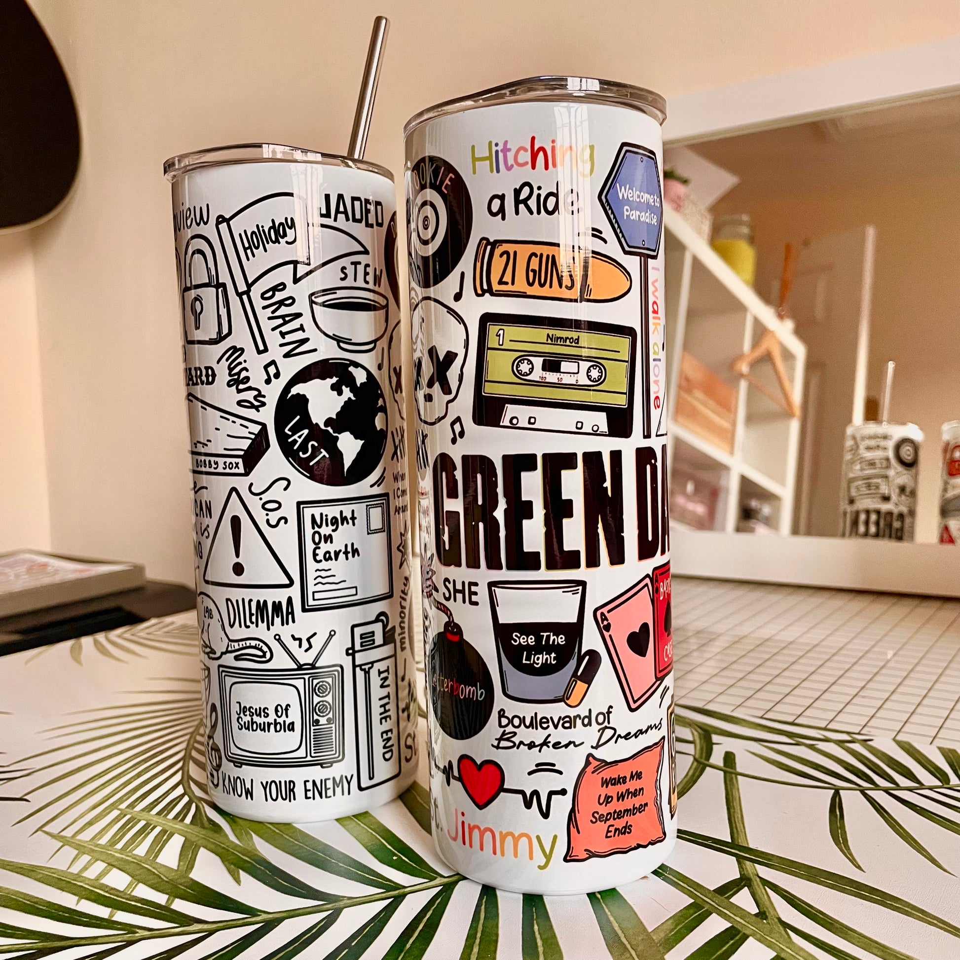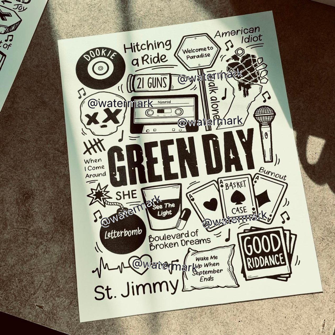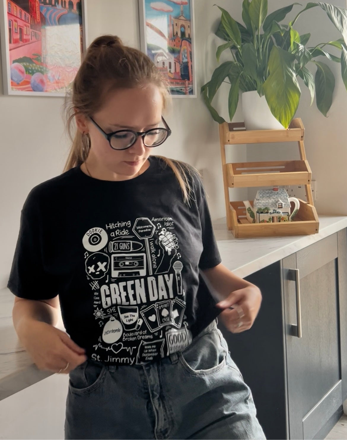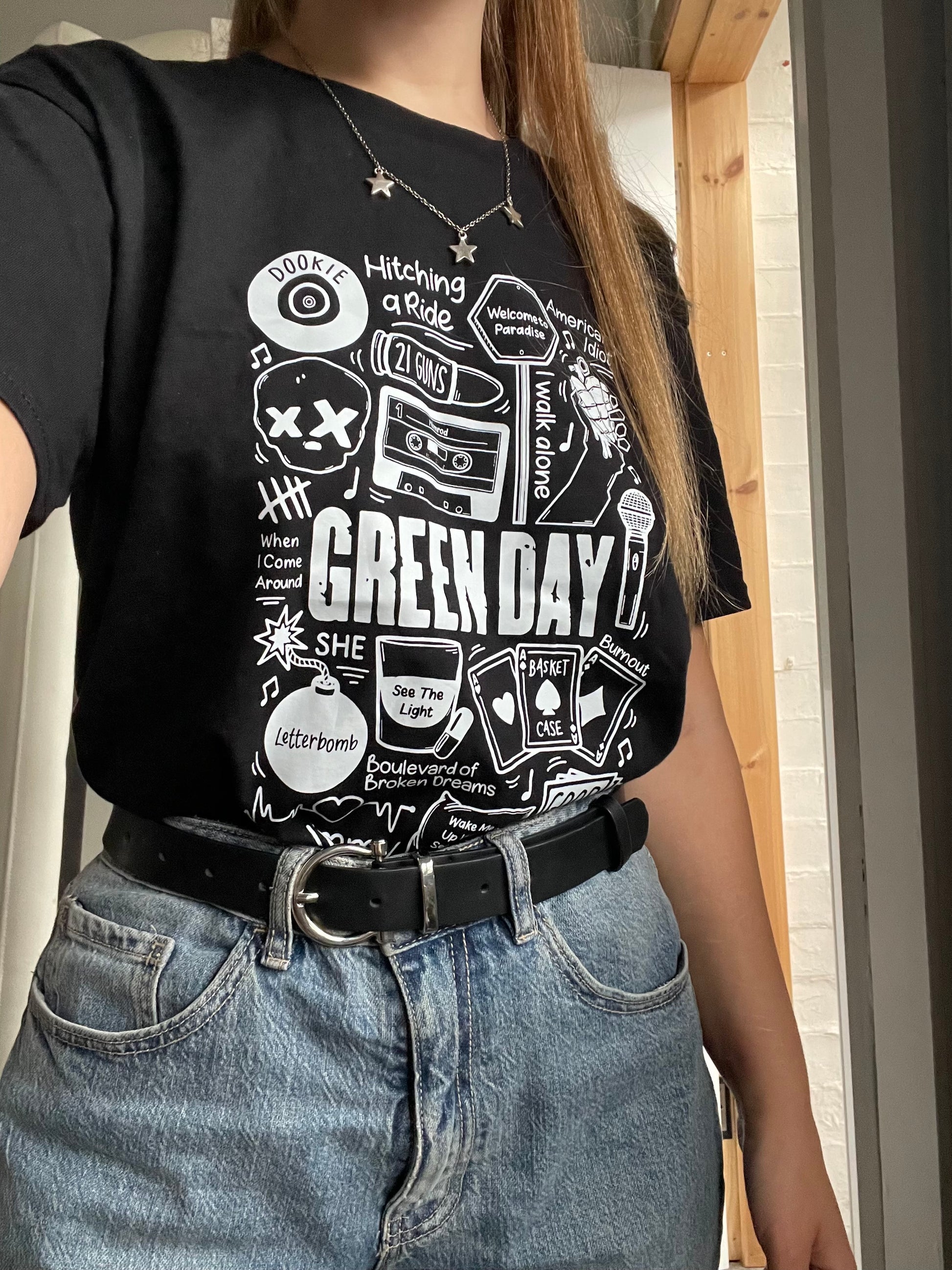 T-shirt unisexe Green Day en coton imprimé professionnellement en noir ou blanc.