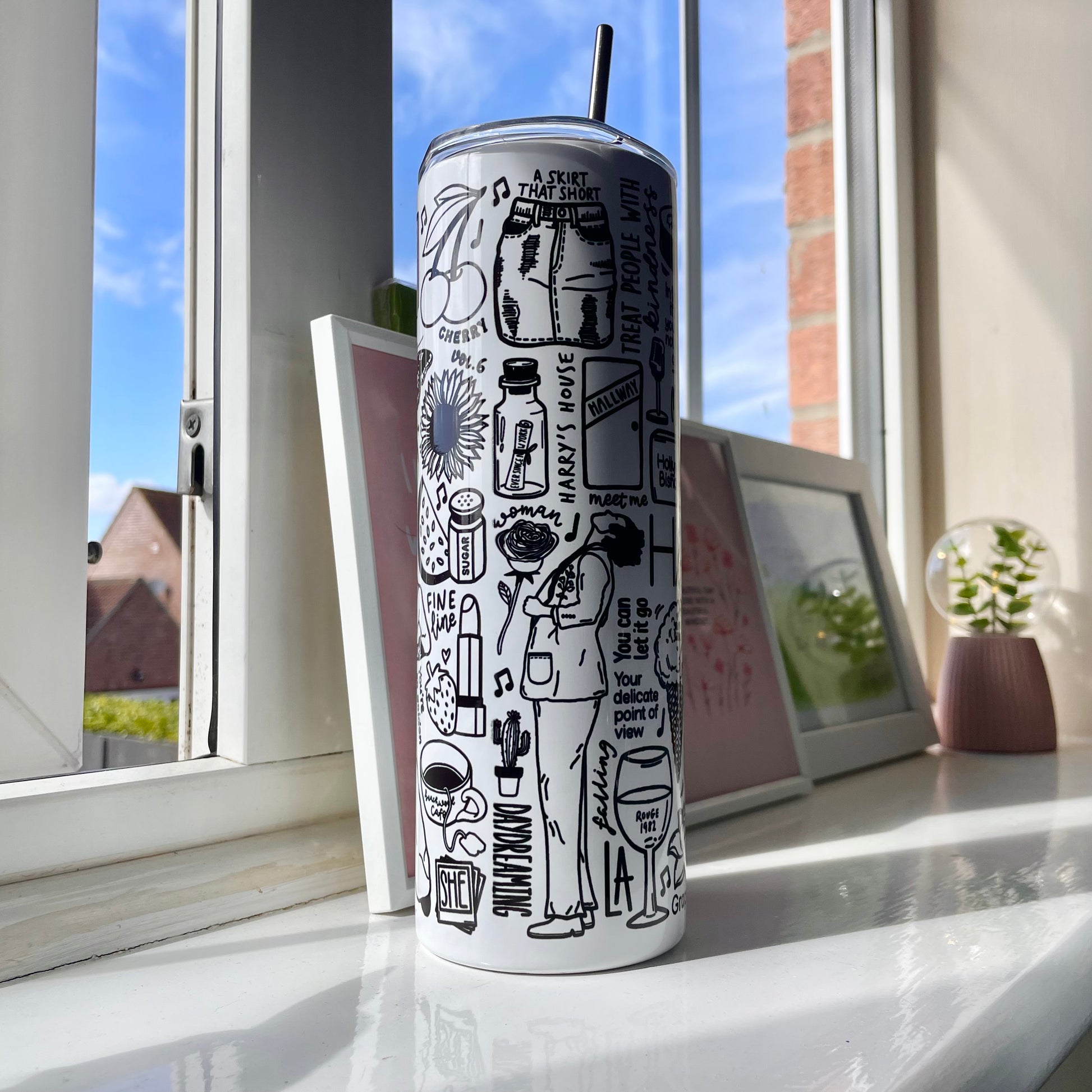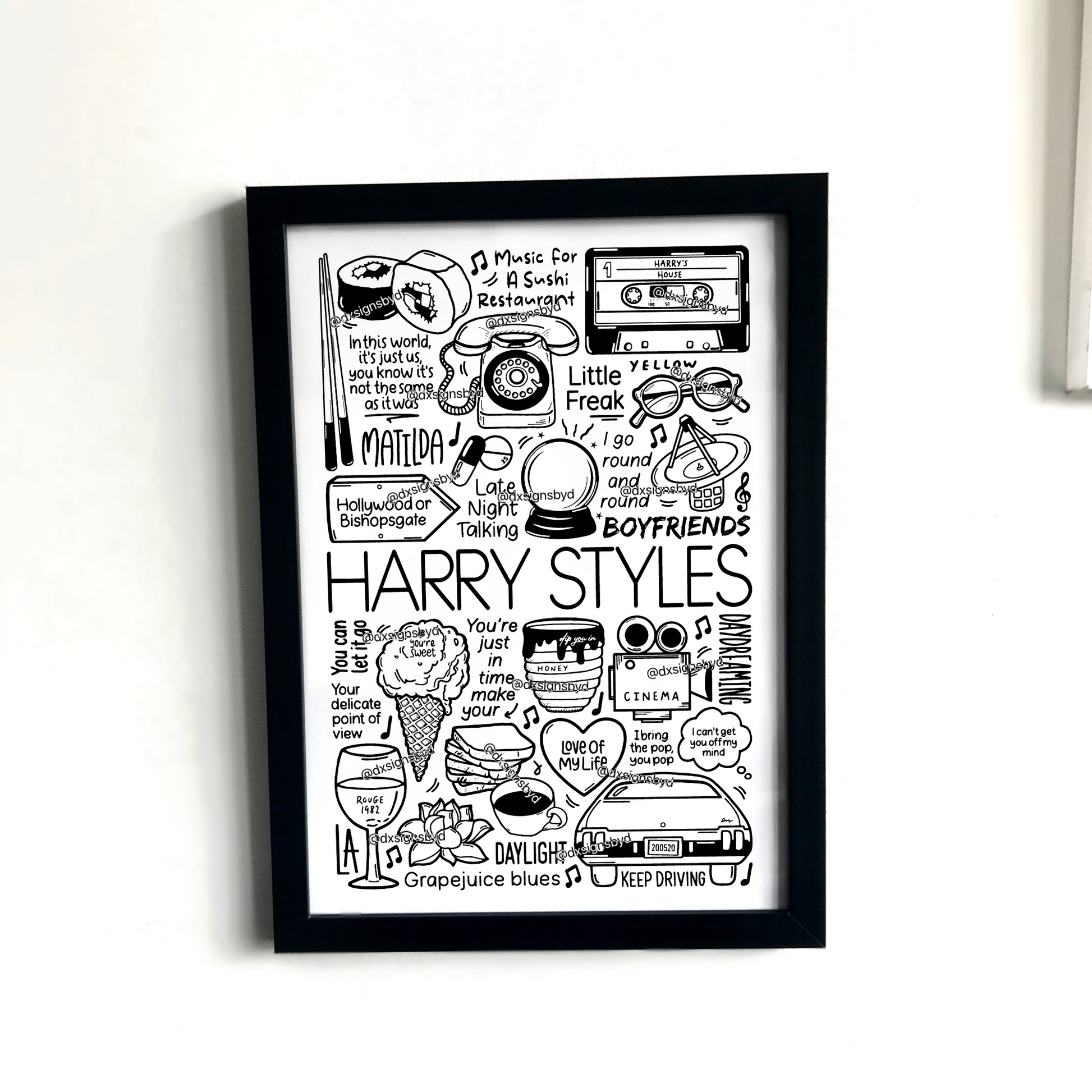 Affiche imprimée de Harry Styles présentant des images et des paroles de chansons de son album Harry's House, avec des chansons telles que Matilda, Boyfriends, As It Was et Music For A Sushi Restaurant.