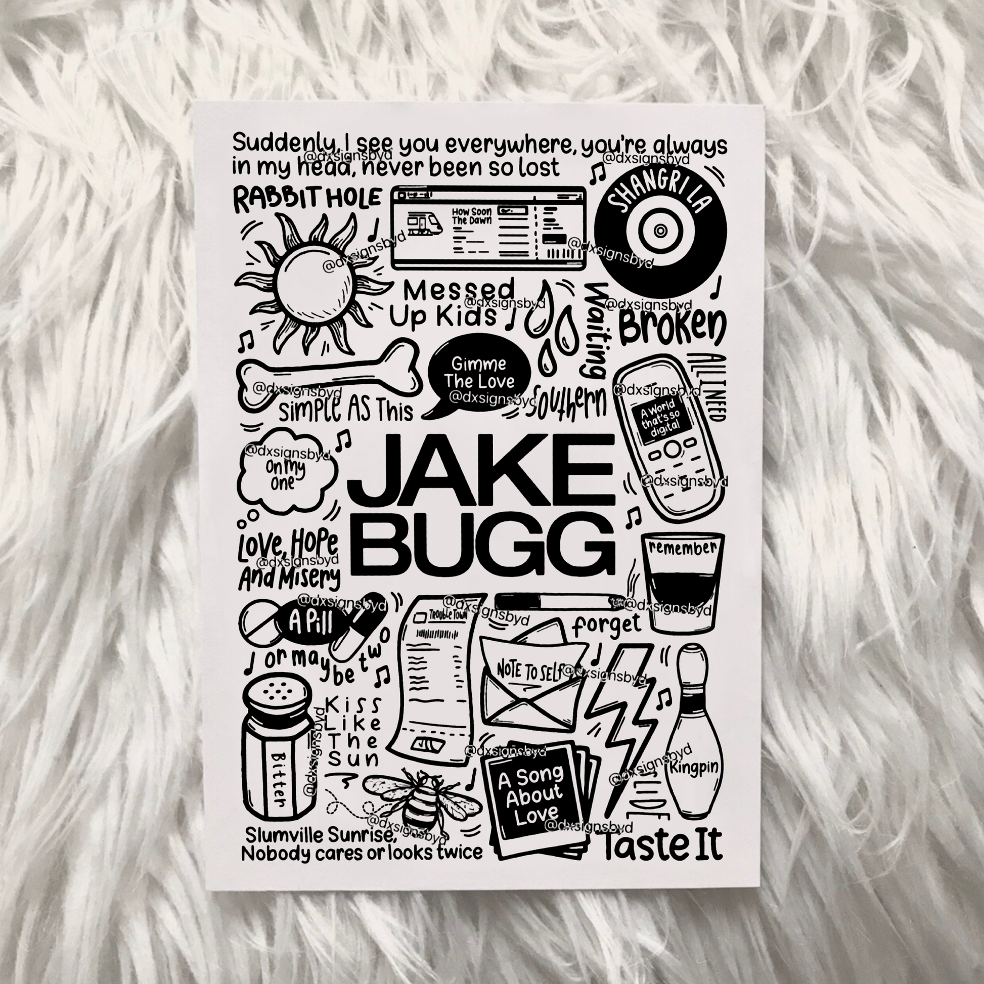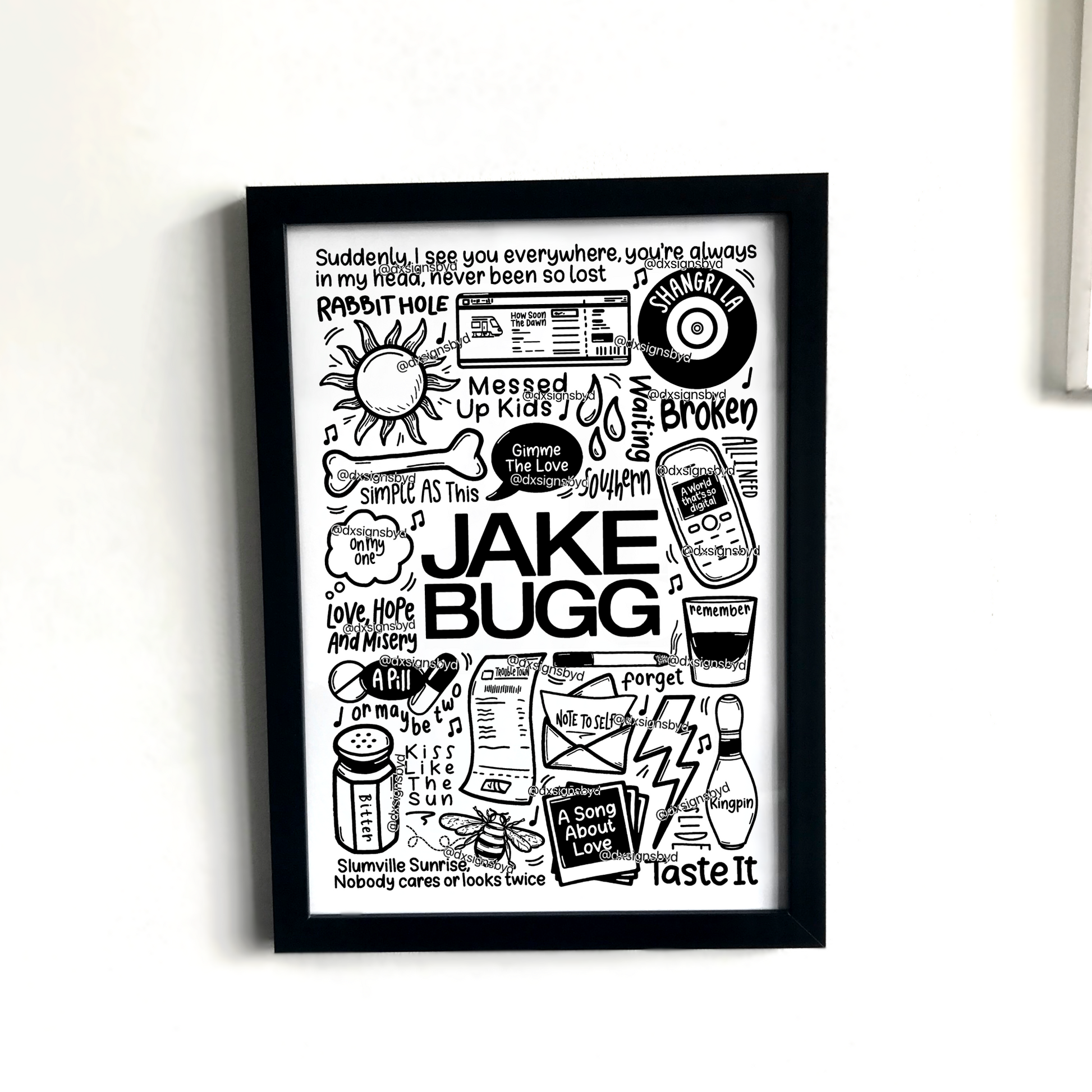 🎶Affiche de Jake Bugg comprenant des images et des paroles de chansons de ses albums tels que Shangri La, On My One et Hearts That Strain.