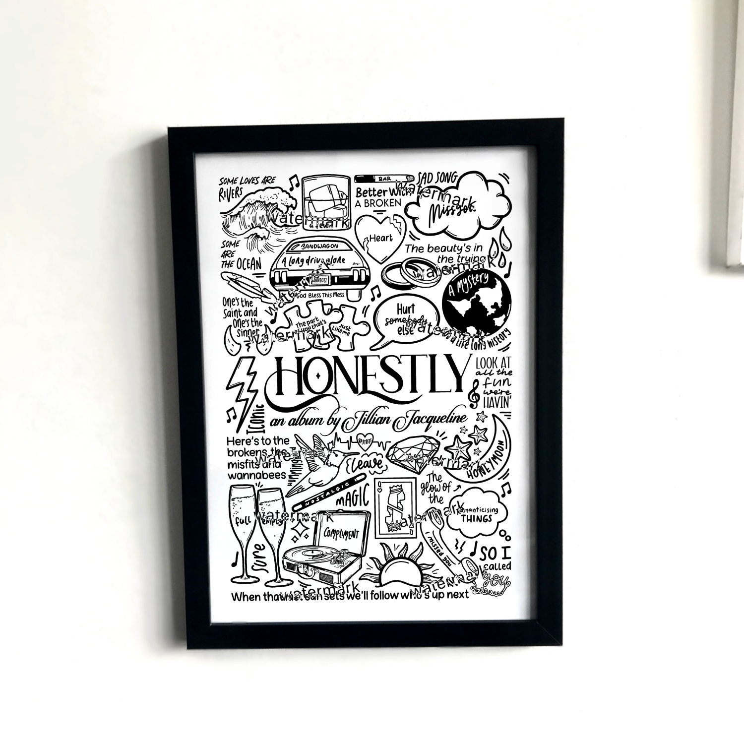 🎶 Affiche imprimée de Jillian Jacqueline créée à l'aide d'un iPad et d'un Apple Pencil. Elle comprend des images et des paroles de chansons de son album Honestly.