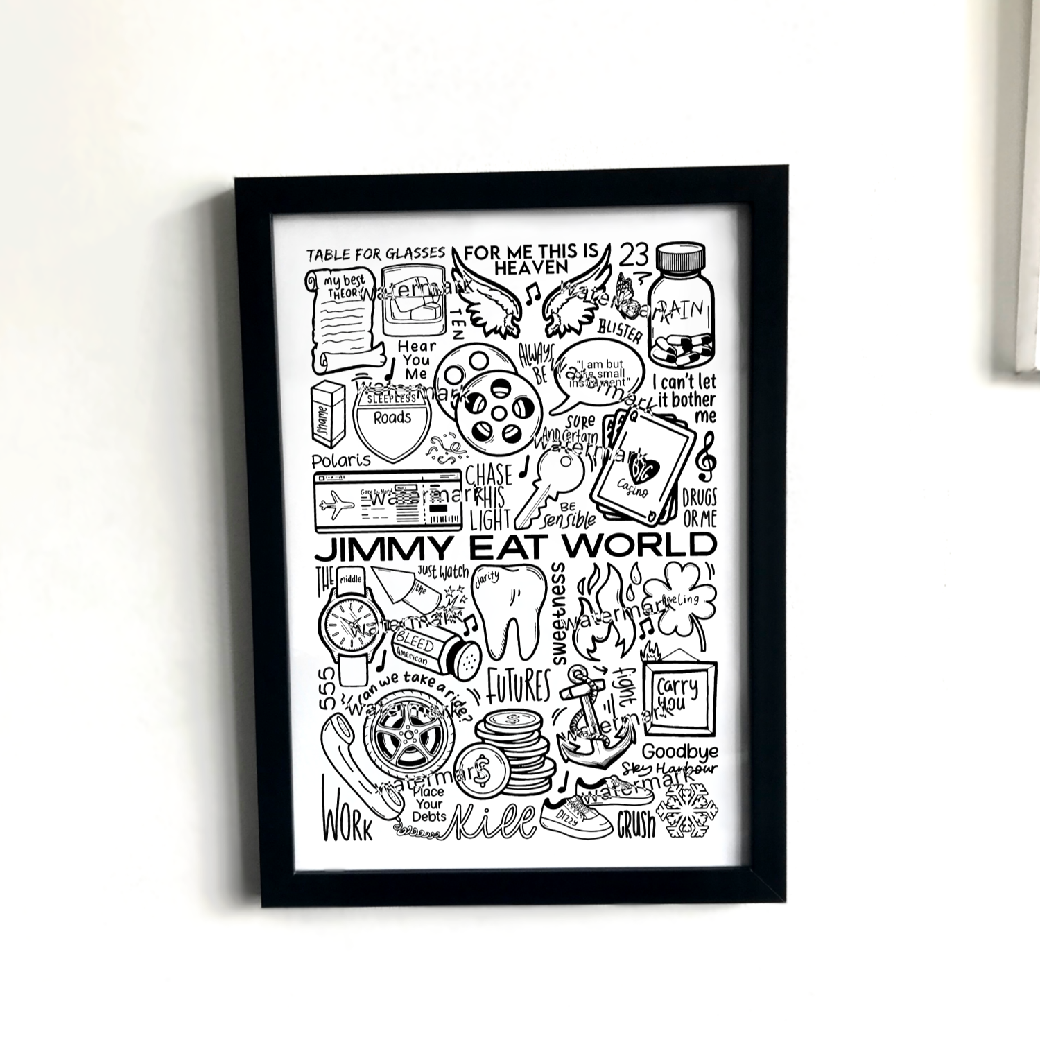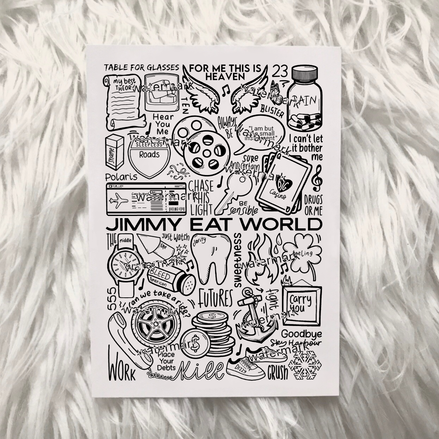 🎶Affiche imprimée de Jimmy Eat World créée à l'aide d'un iPad et d'un Apple Pencil. Elle comprend des images et des paroles de chansons de leurs albums.
