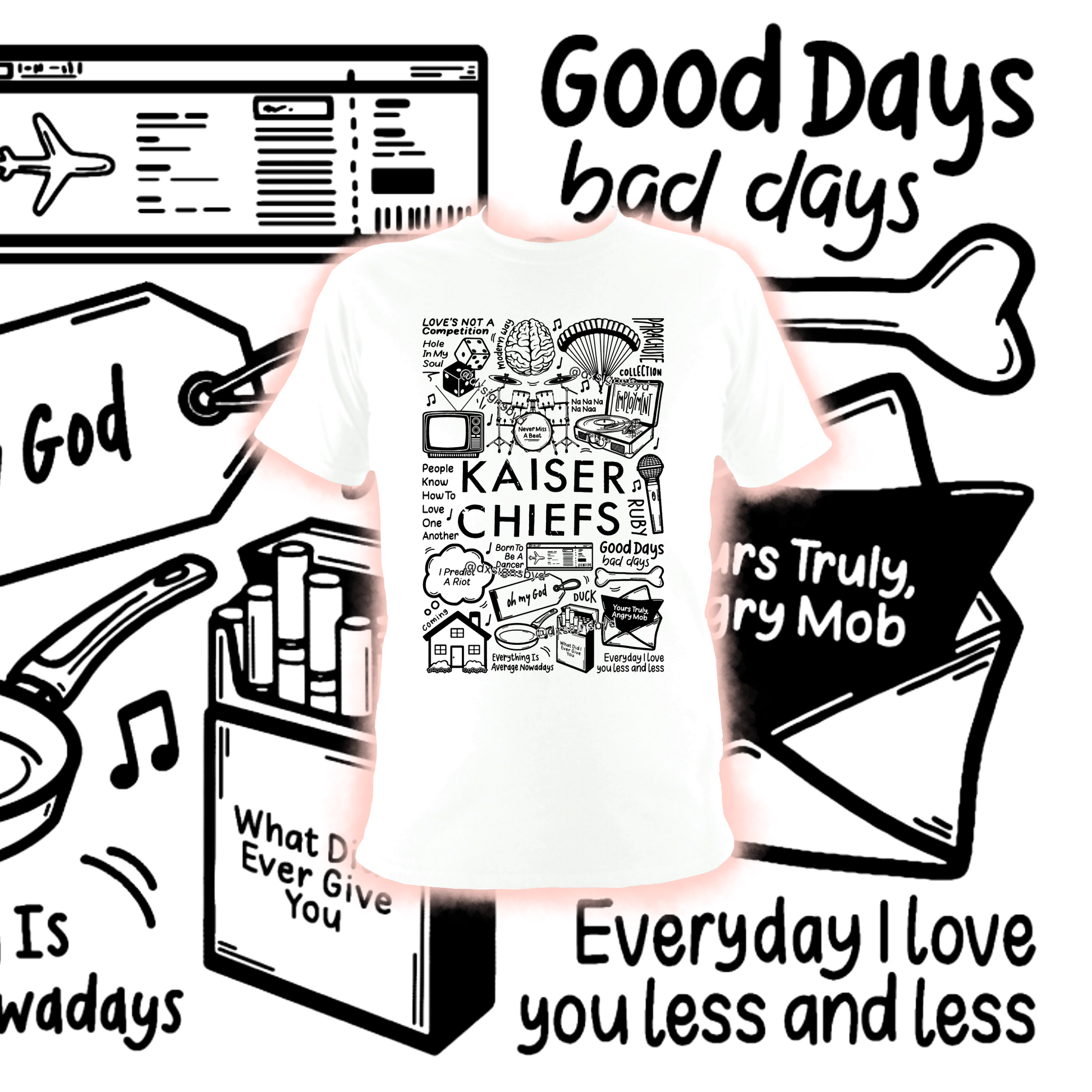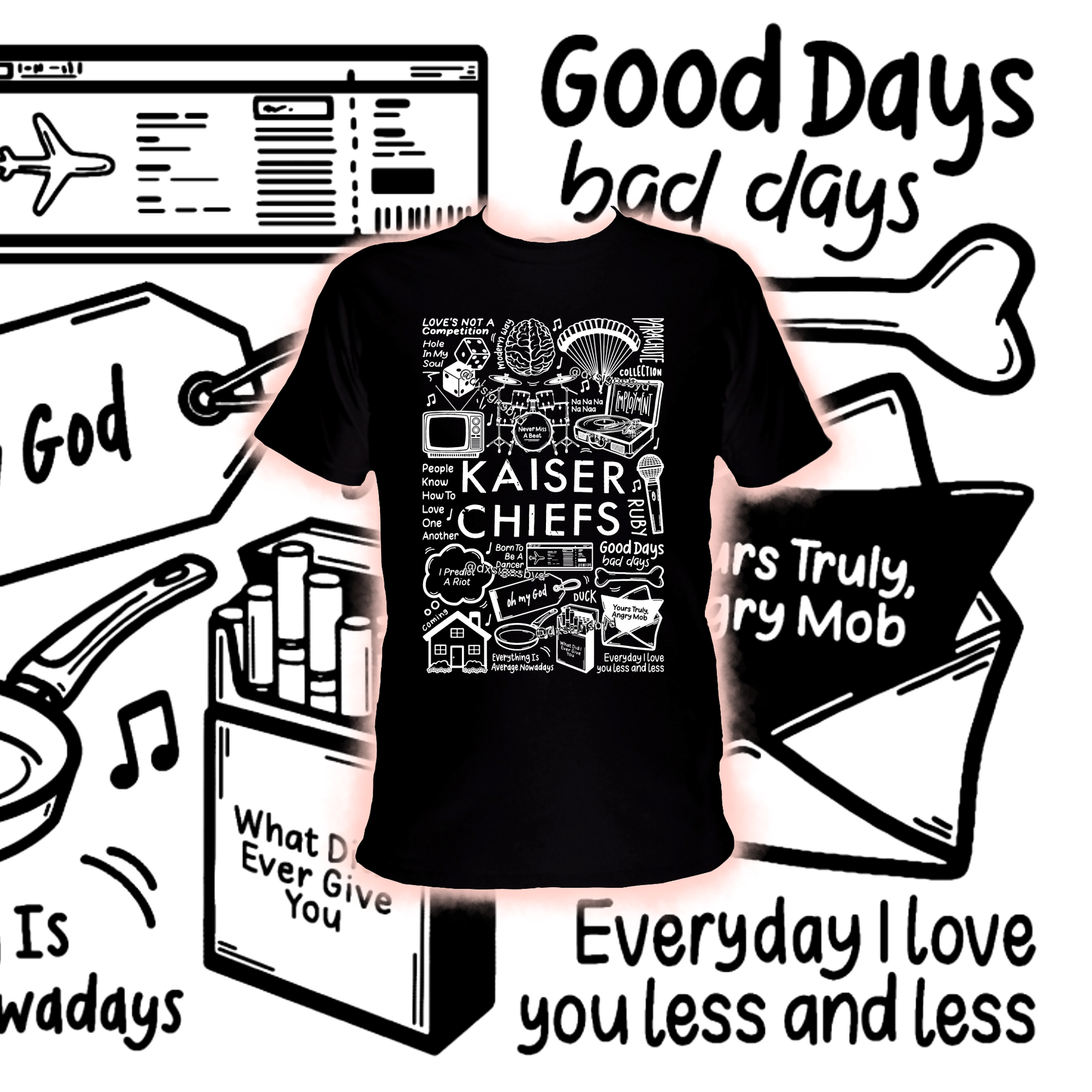 T-shirt unisexe en coton imprimé professionnellement des Kaiser Chiefs en noir ou blanc.