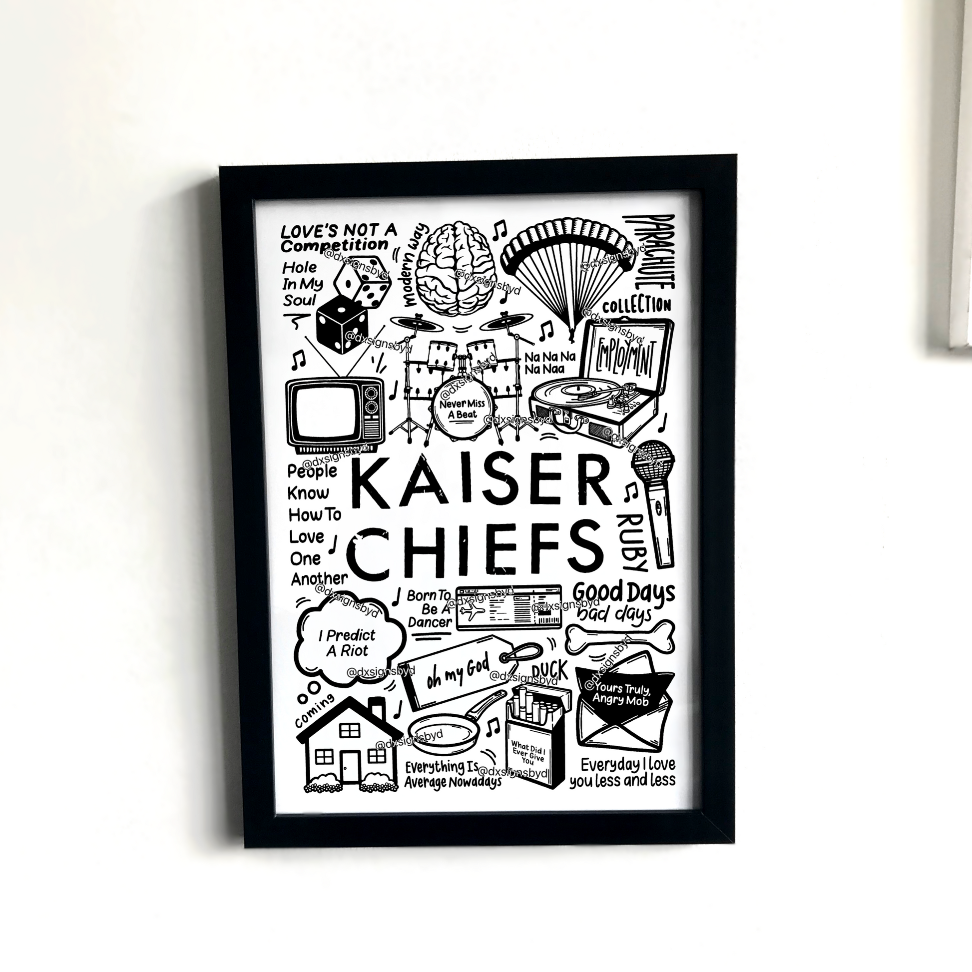 🎶Affiche des Kaiser Chiefs comprenant des images et des paroles de chansons de leurs albums tels que Employment, Yours Truly, Angry Mob, Duck et Off With Their Heads.