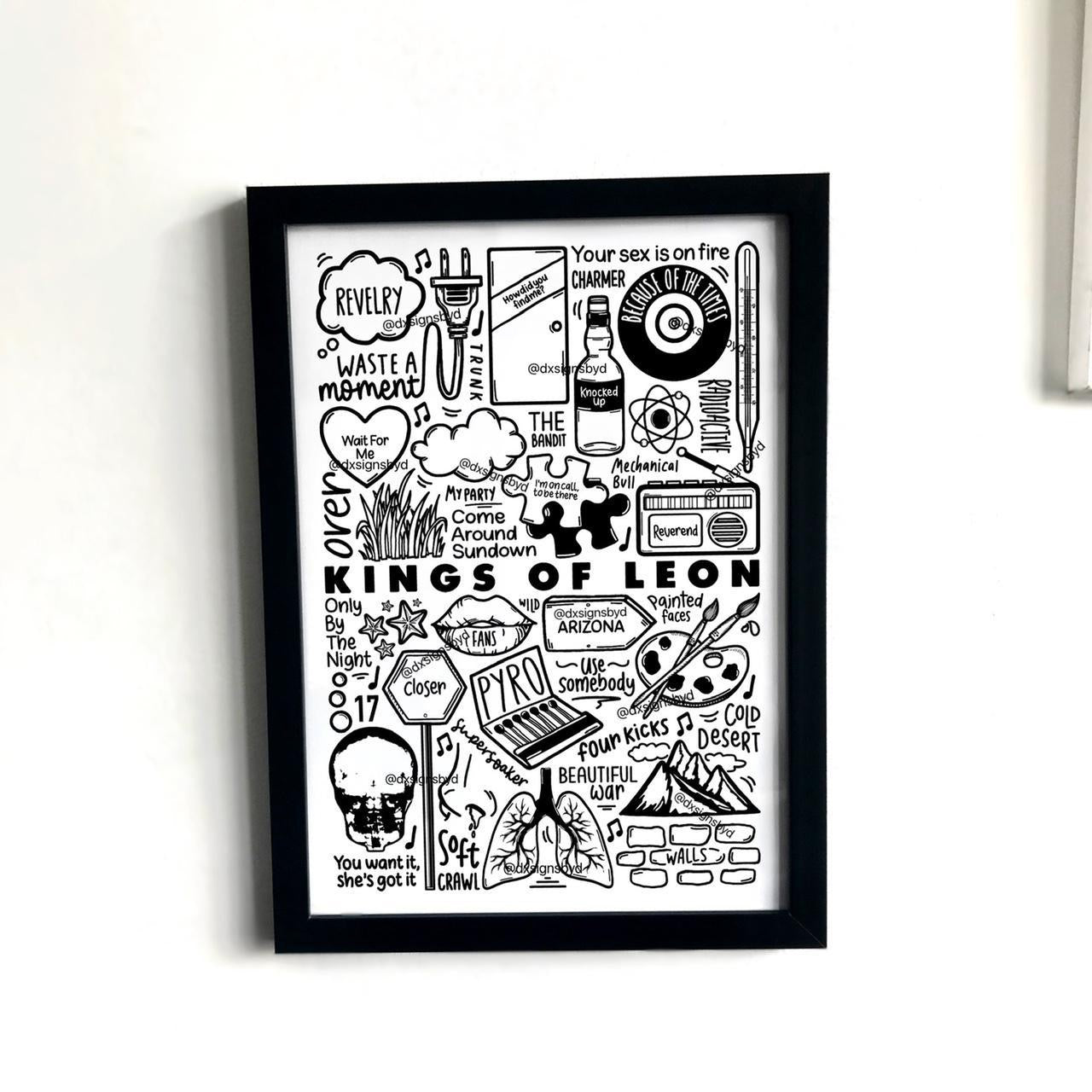 🎶Affiche Kings Of Leon avec des images et des paroles de chansons de leurs albums tels que Walls, Mechanical Bull, Only By The Night et When You See Yourself.