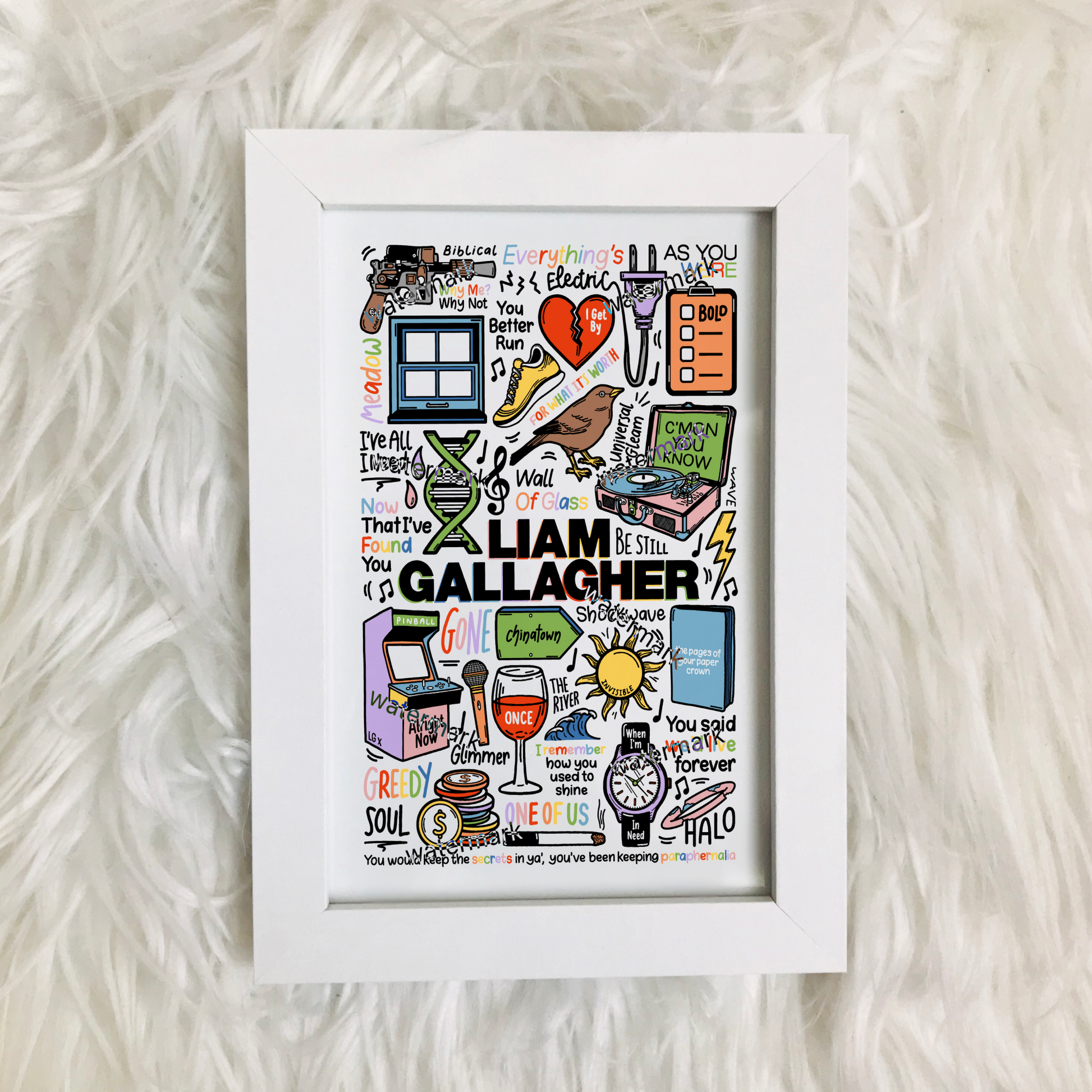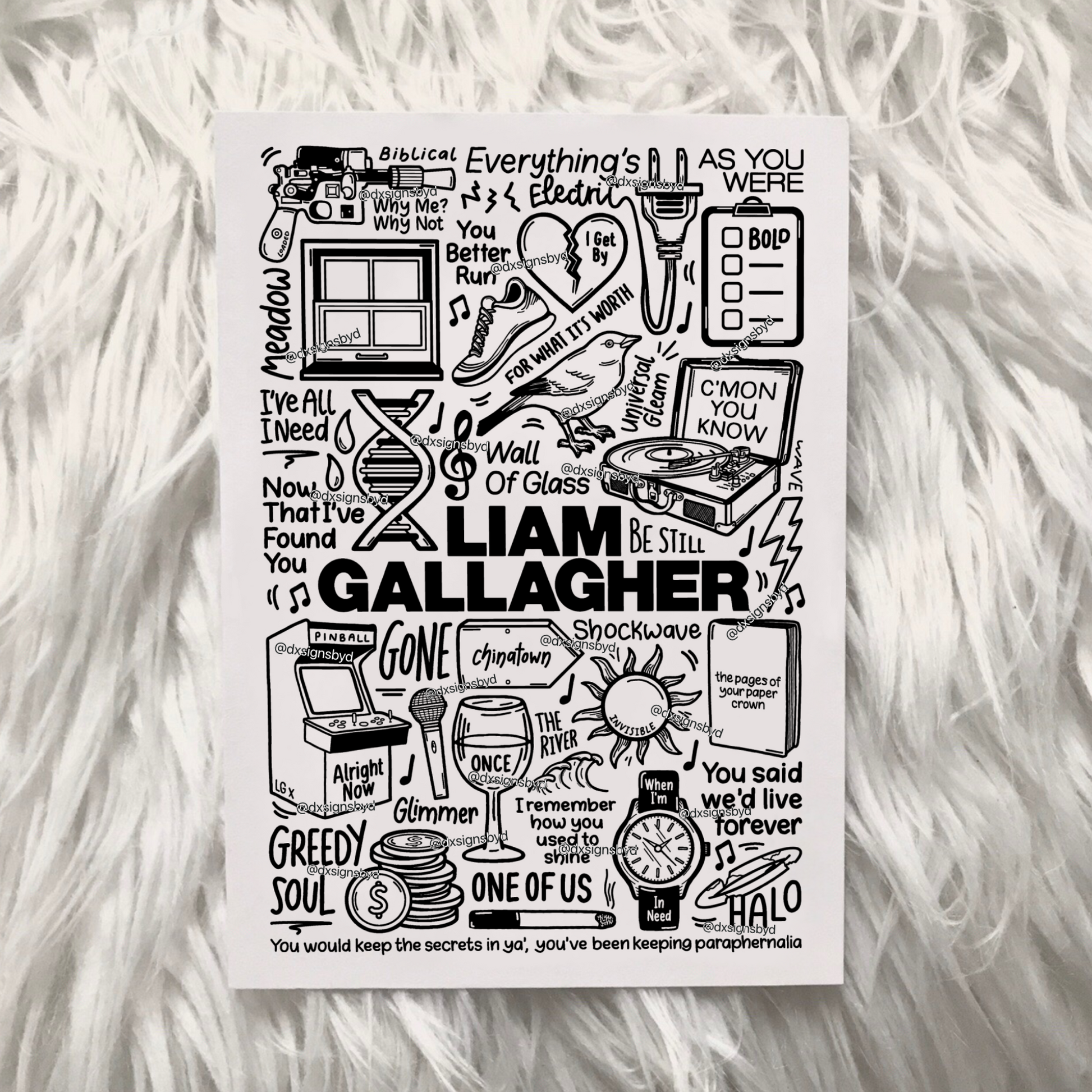 🎶Affiche de Liam Gallagher comprenant des images et des paroles de chansons de ses albums tels que As You Were, Why Me? Why Not? et C'mon You Know. Ainsi que des chansons telles que Wall Of Glass, Greedy Soul, For What It's Worth et Paper Crown.