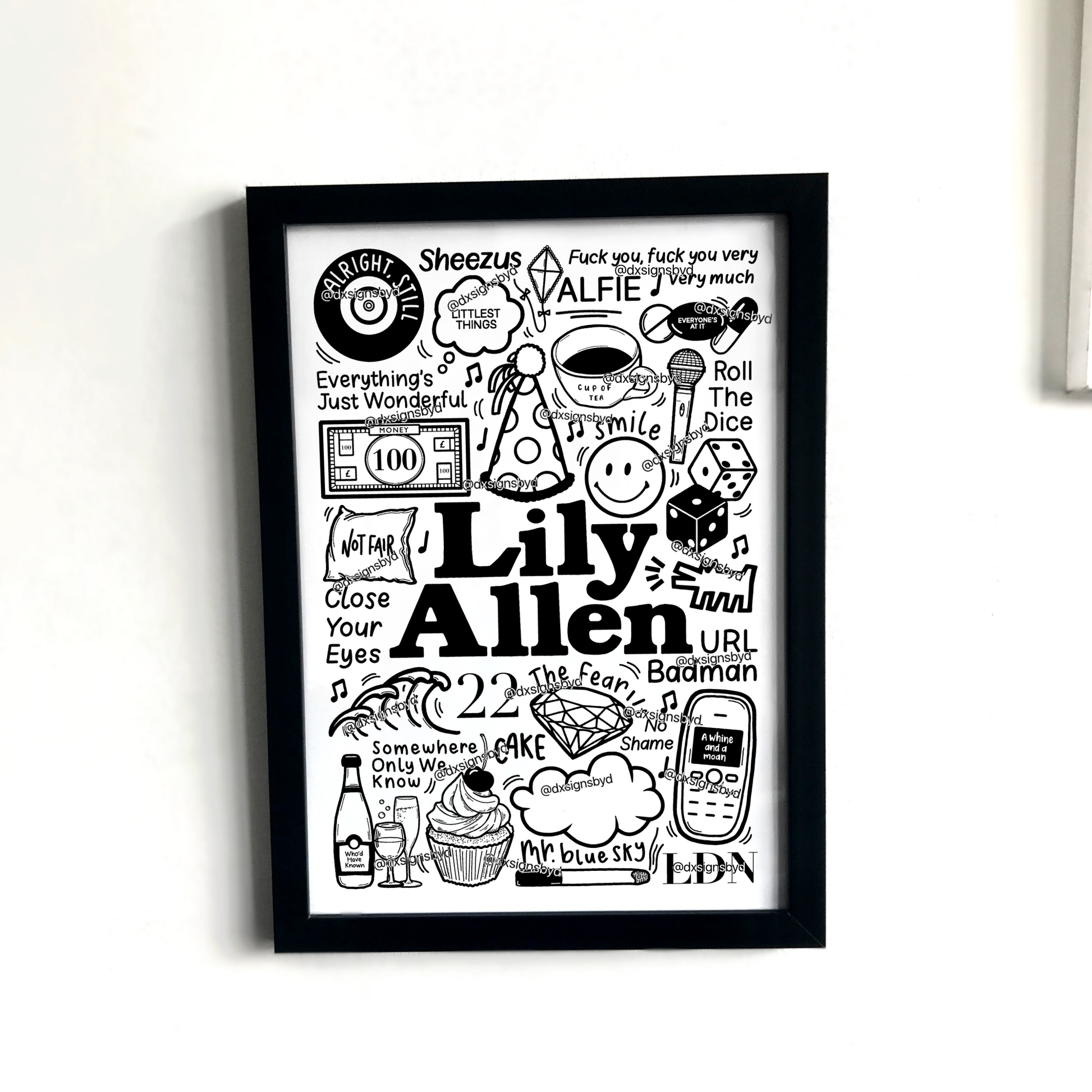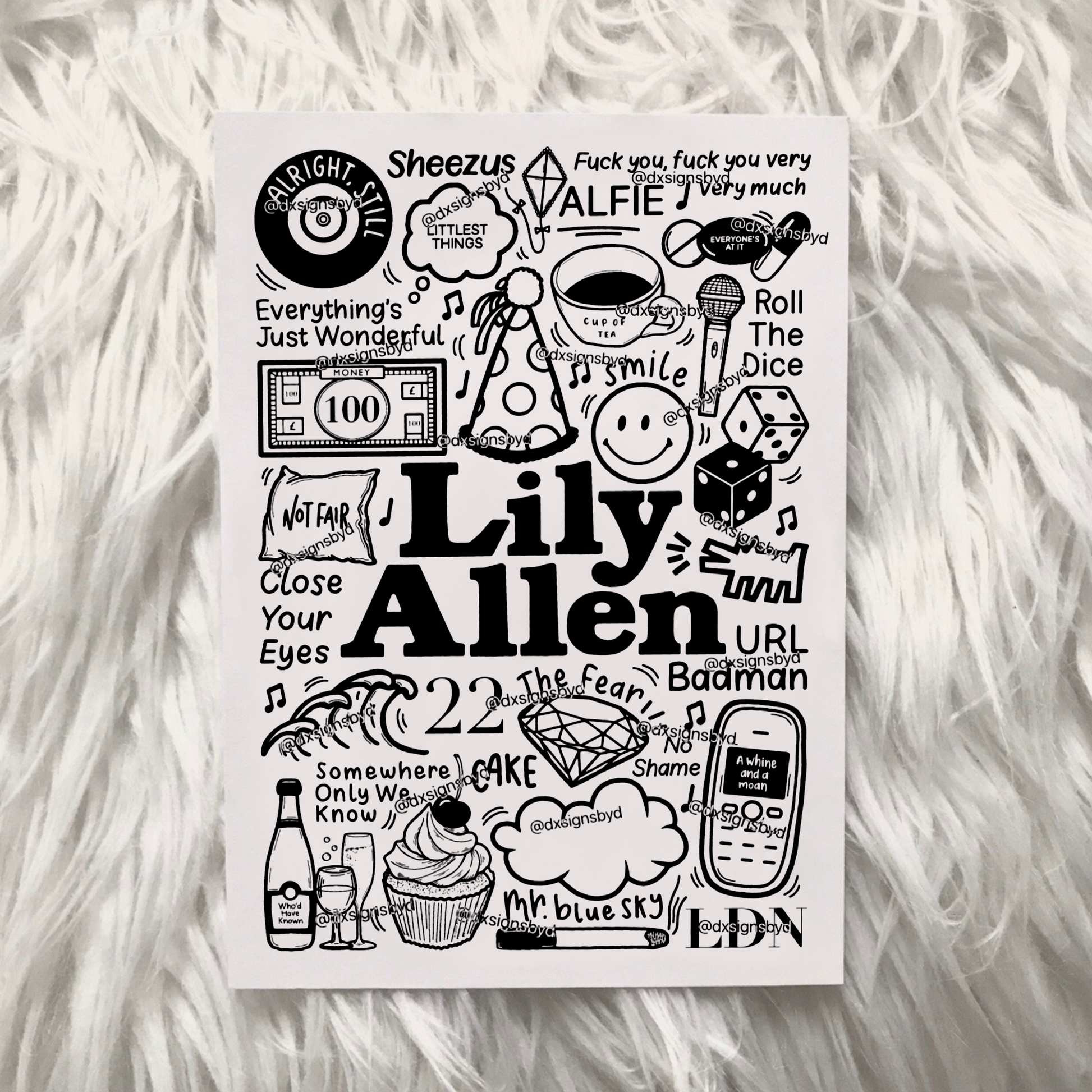 🎶Affiche de Lily Allen qui comprend des images et des paroles de chansons de ses albums tels que Alright, Still, It's Not Me, It's You, Sheezus et No Shame.