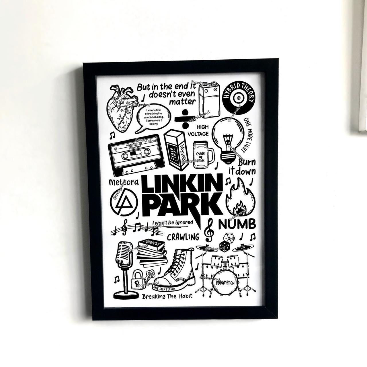 🎶Affiche de Linkin Park avec des images et des paroles de chansons de leurs albums tels que Hybrid Theory, Meteora, One More Light, Minutes To Midnight et A Thousand Suns.