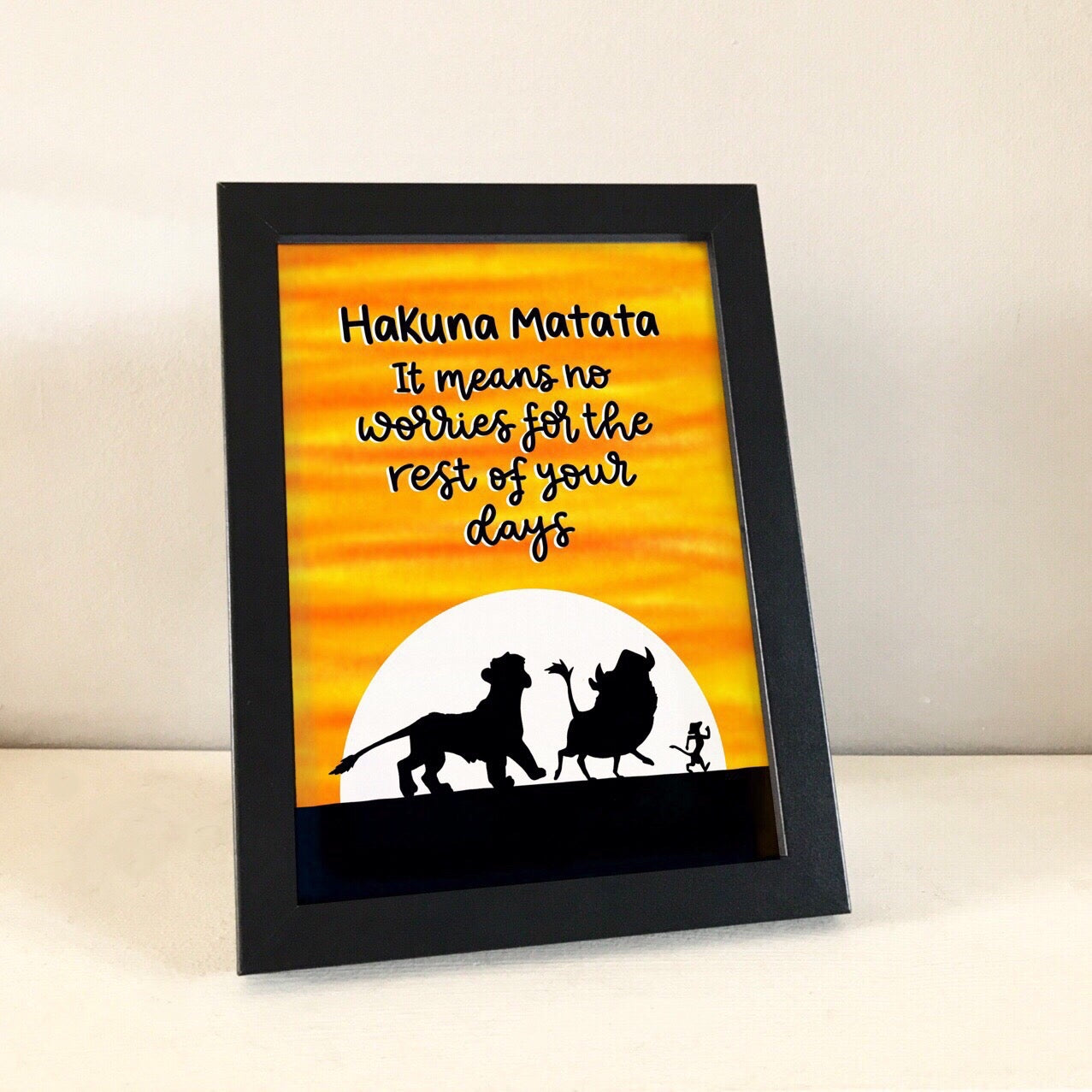 Conception de silhouette du Roi Lion avec la citation « Hakuna Matata, cela signifie pas de soucis pour le reste de vos jours » sur un fond de coucher de soleil orange.