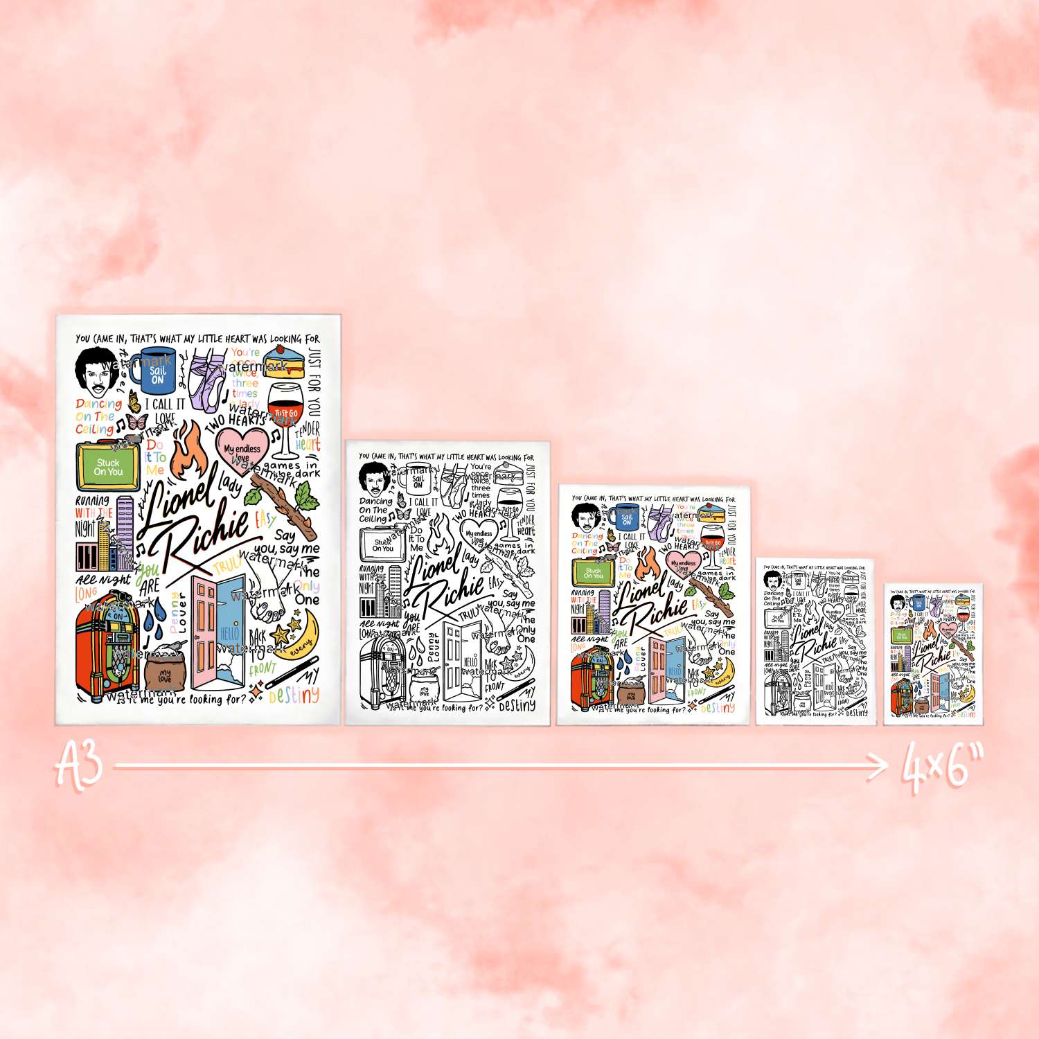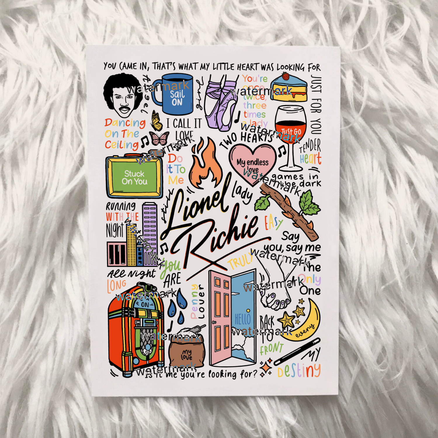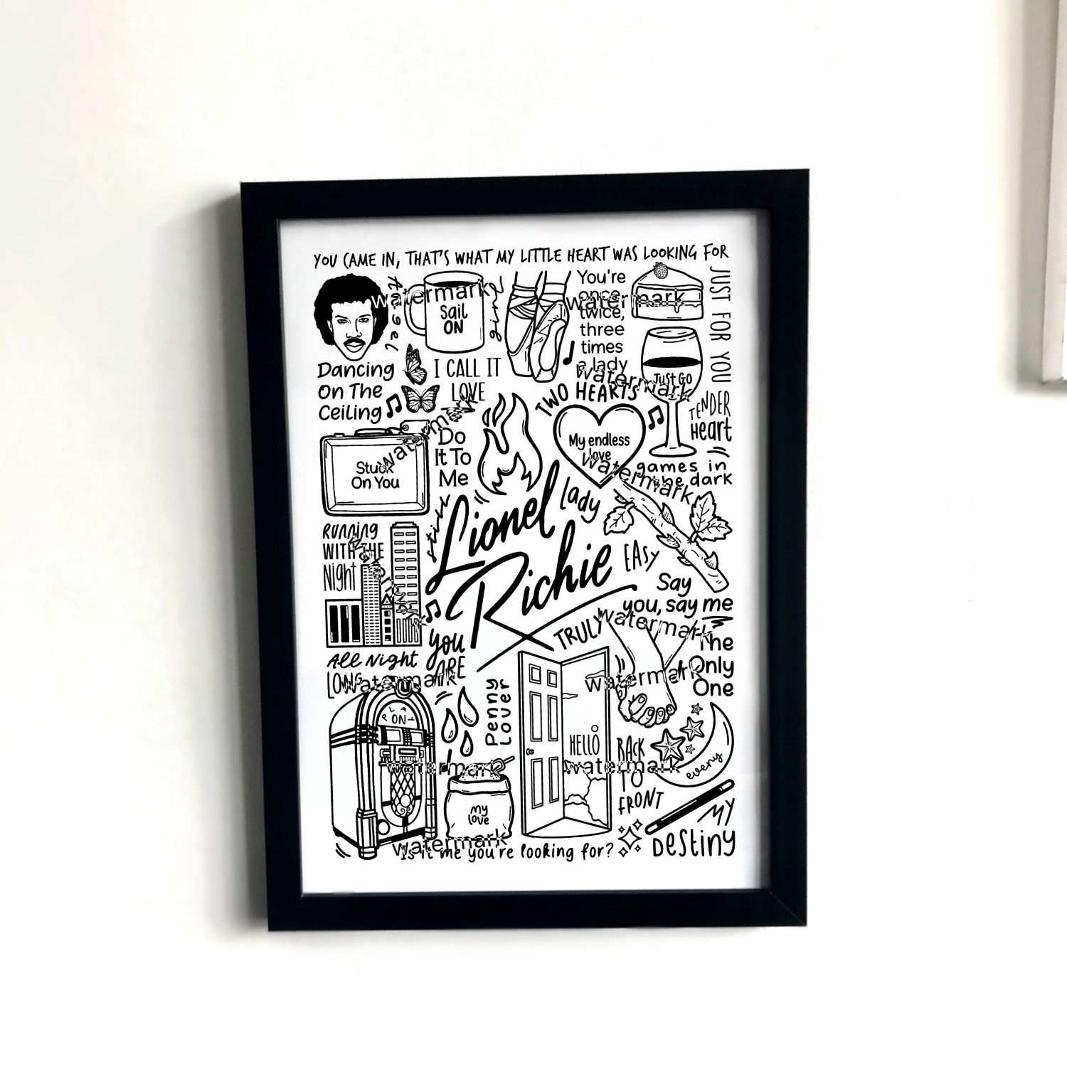 🎶 Affiche de Lionel Richie créée à l'aide d'un iPad et d'un Apple Pencil. Elle comprend des images et des paroles de chansons de ses albums.