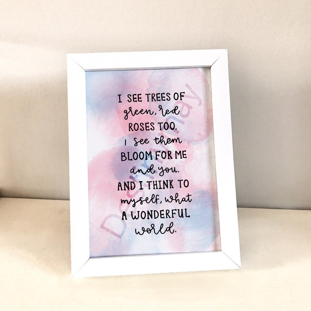 Affiche des paroles de la chanson What A Wonderful World de Louis Armstrong présentant les paroles dans deux polices de caractères différentes écrites par le groupe sur un fond bleu rose mélangé.