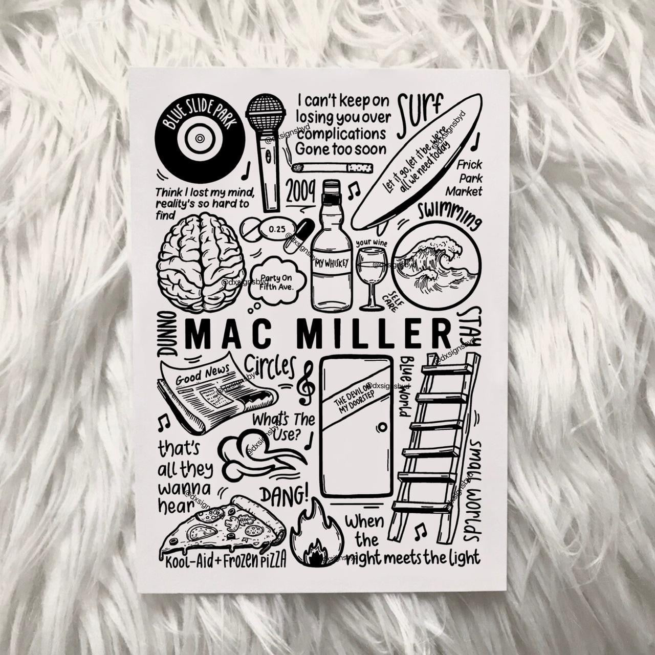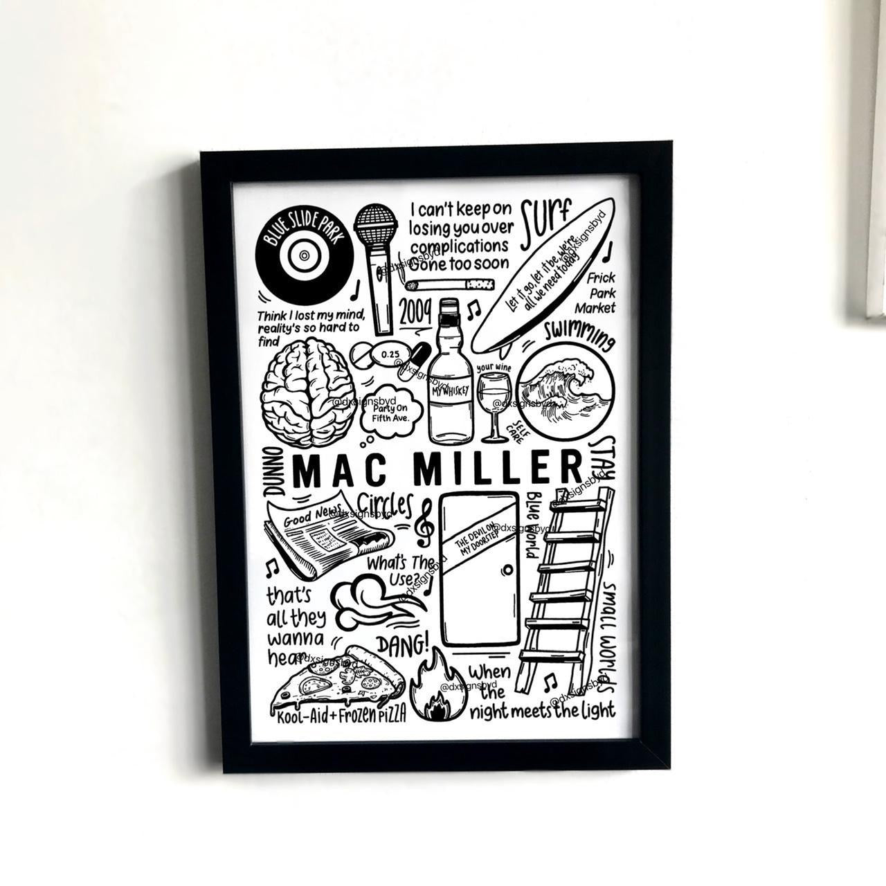 🎶Affiche de Mac Miller avec des images et des paroles de chansons de ses albums tels que Circles, Swimming, Faces et KIDS