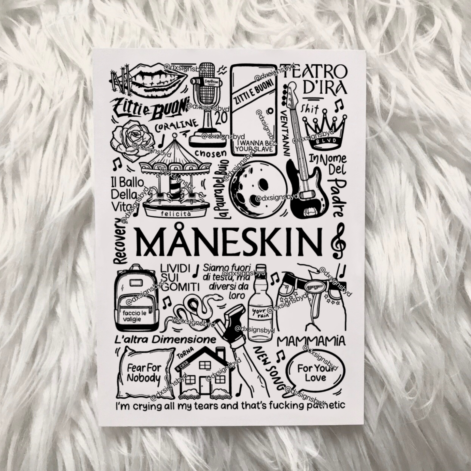 🎶Affiche Maneskin avec des images et des paroles de chansons de leurs albums tels que Il Ballo Della Vita, Teatro D'ira, et des chansons telles que Zitti E Buoni, Mammamia et Coraline.
